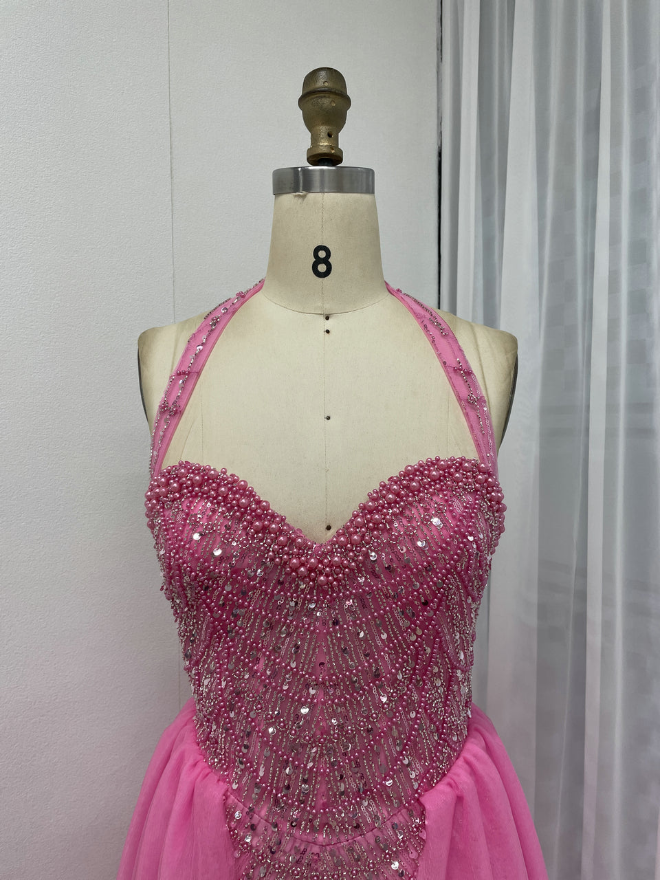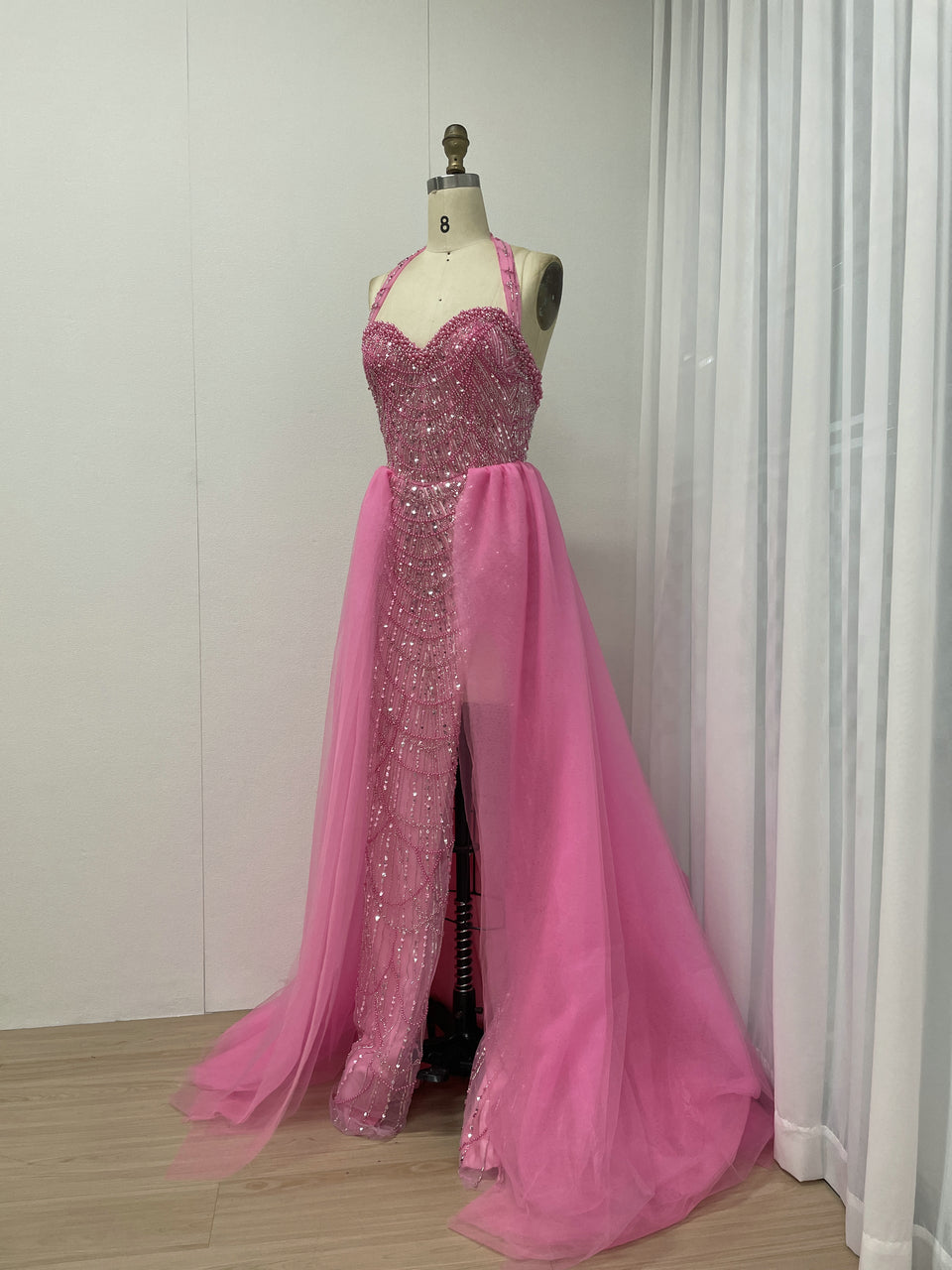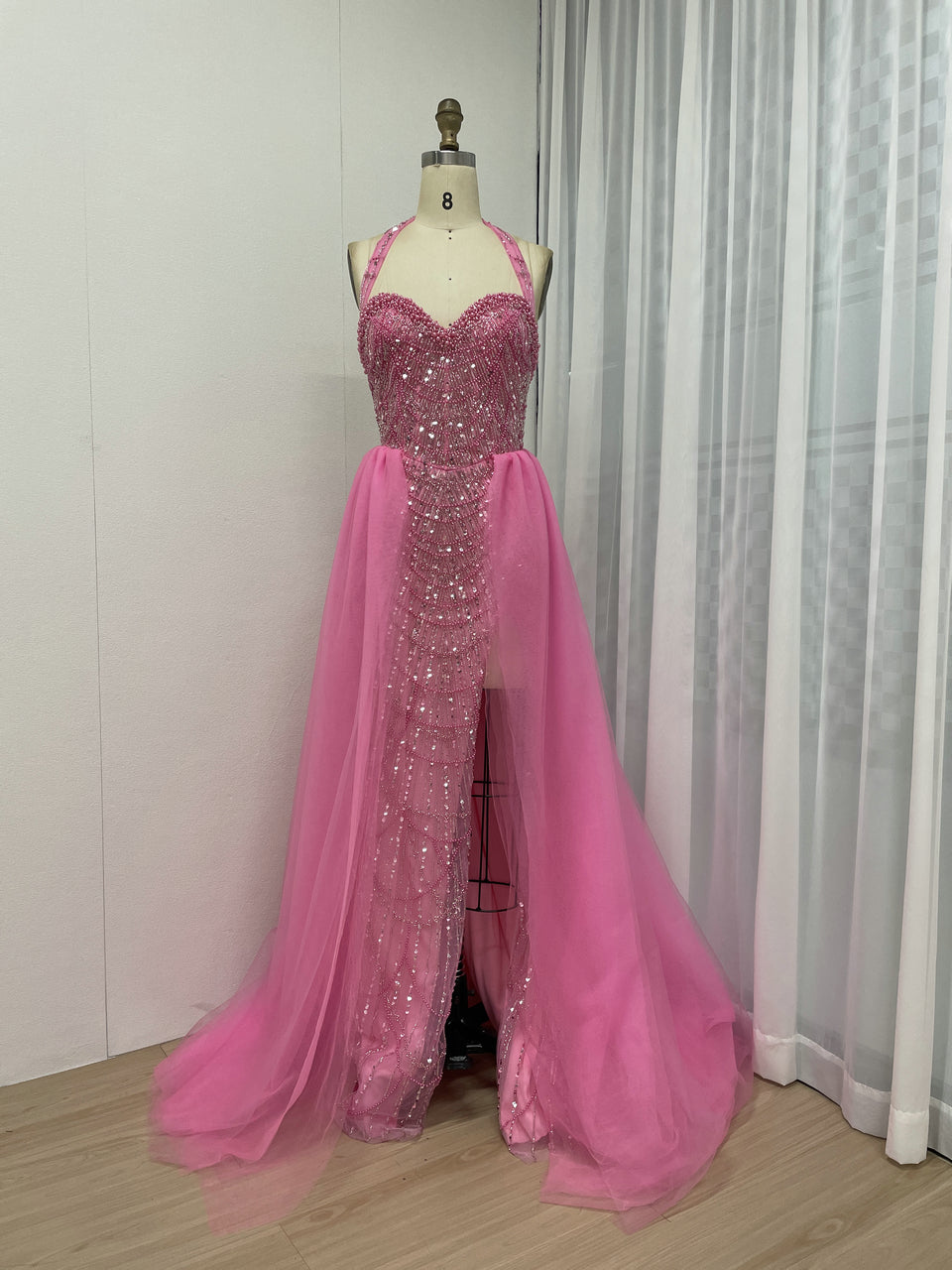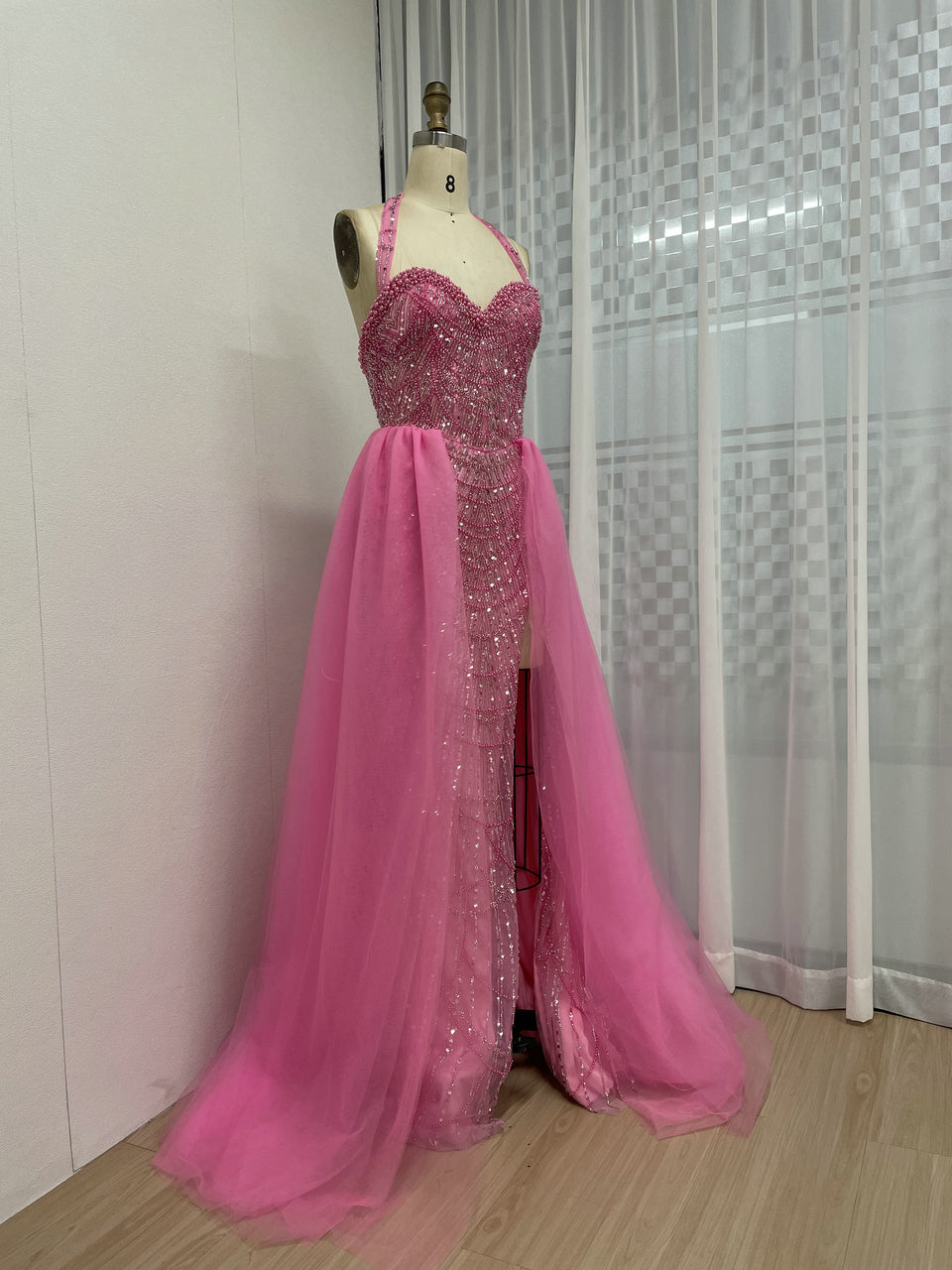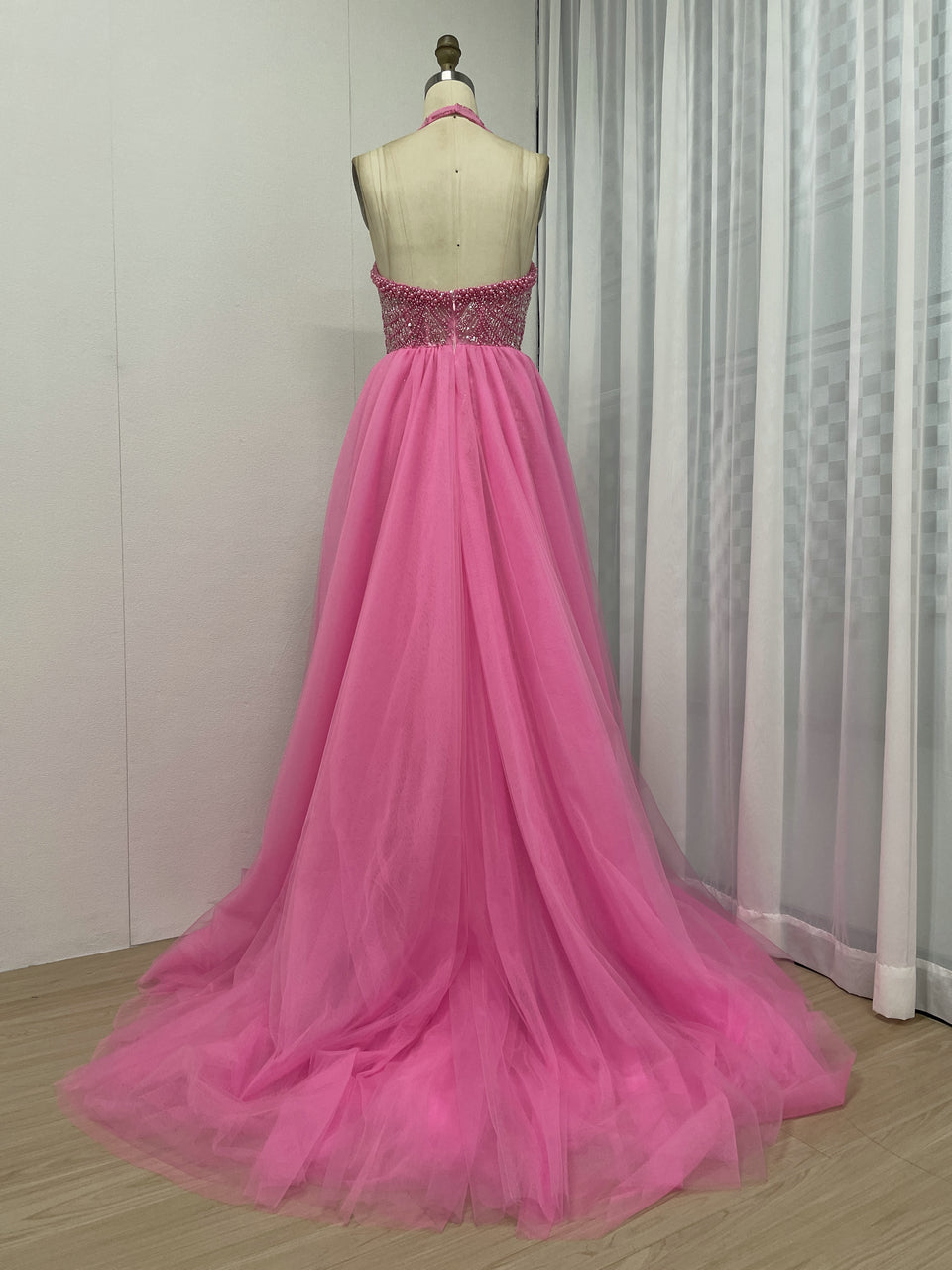 Fuscia Halter Beaded Evening Gown Tulle Train Prom Party Sparkle MY30111-2