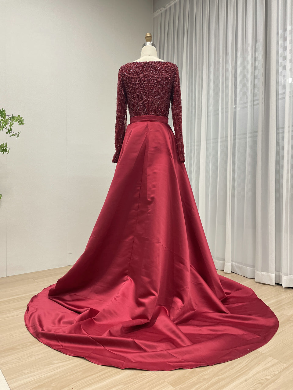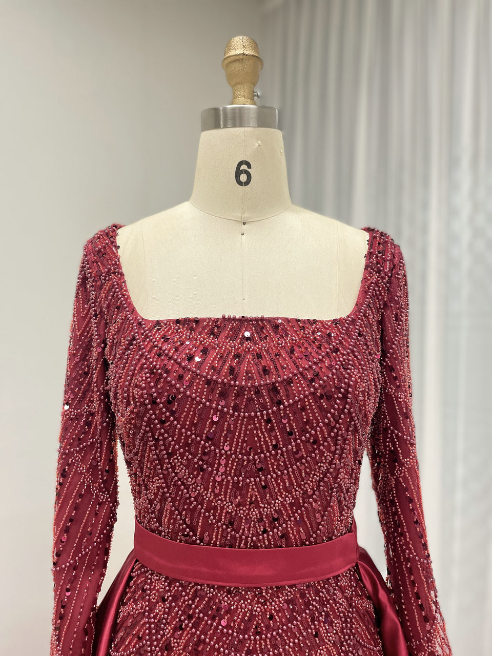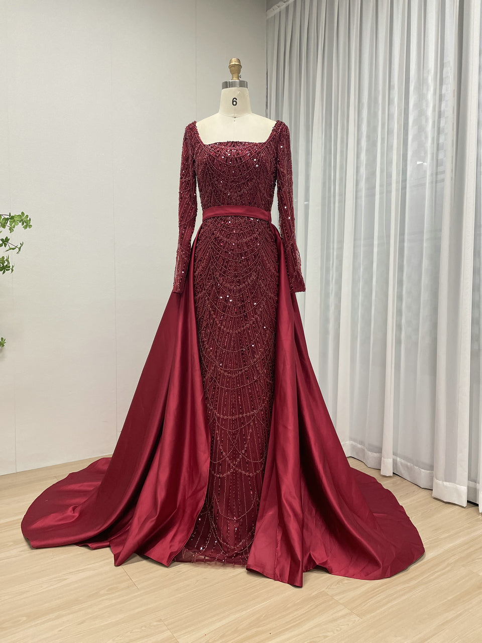 Glamorous Crystal Embroidered Long Sleeve Evening Gown Square Neck Overskirt Dramatic Train MY30153