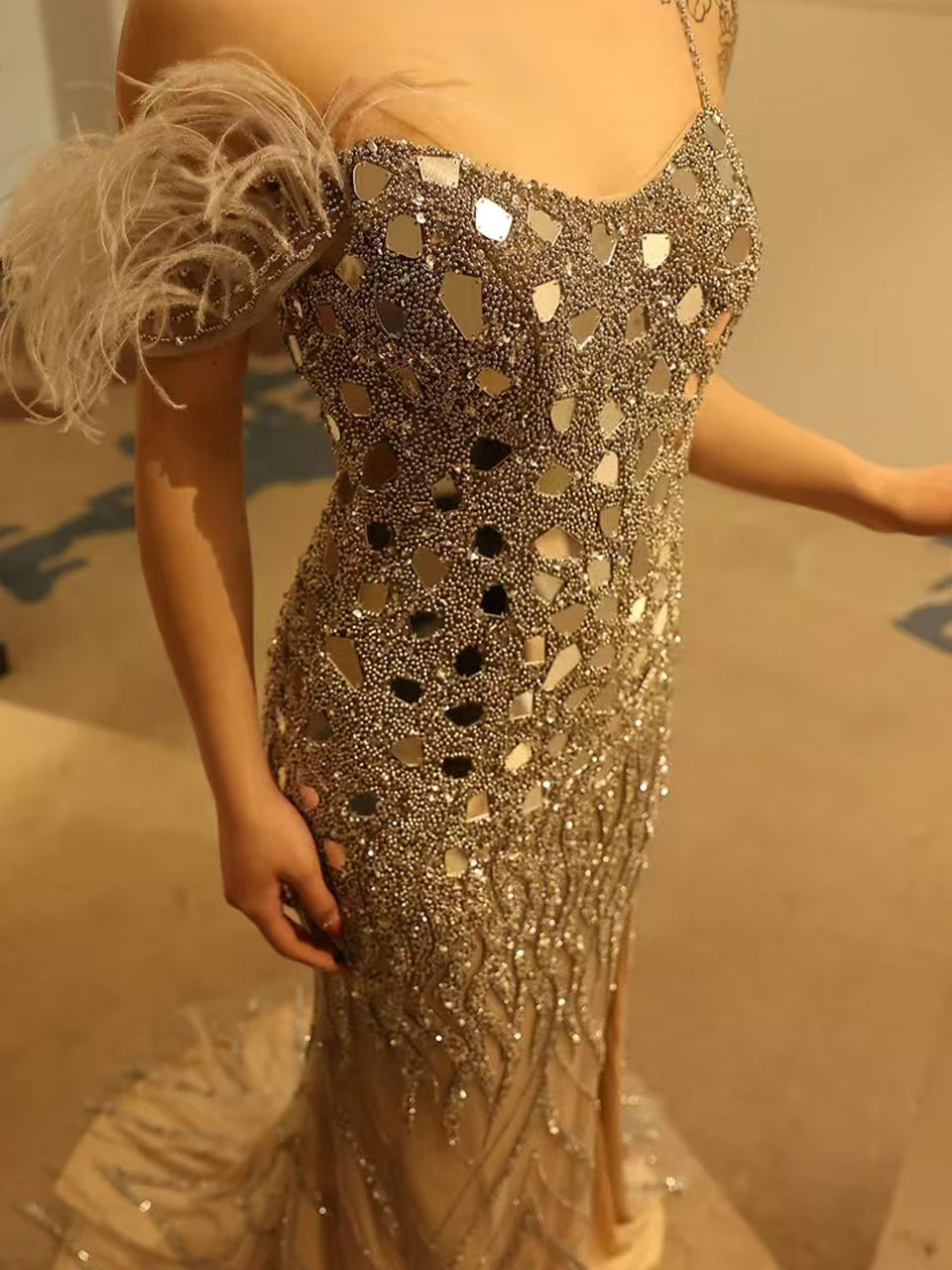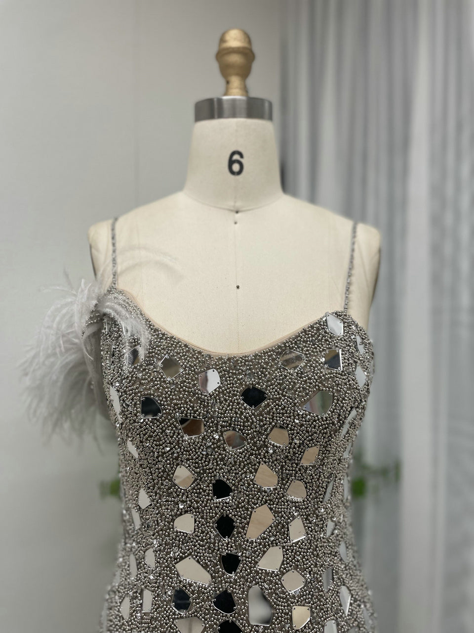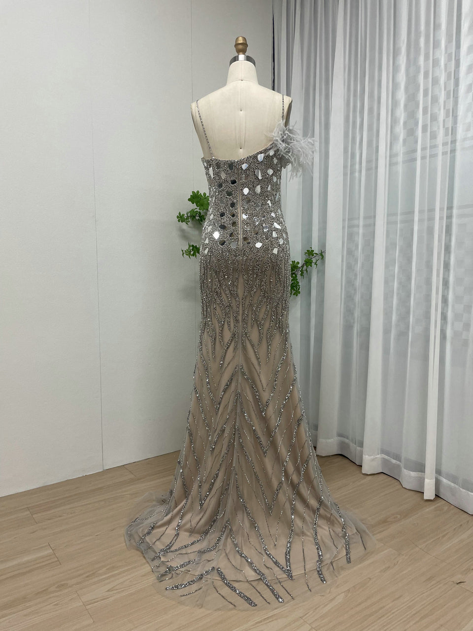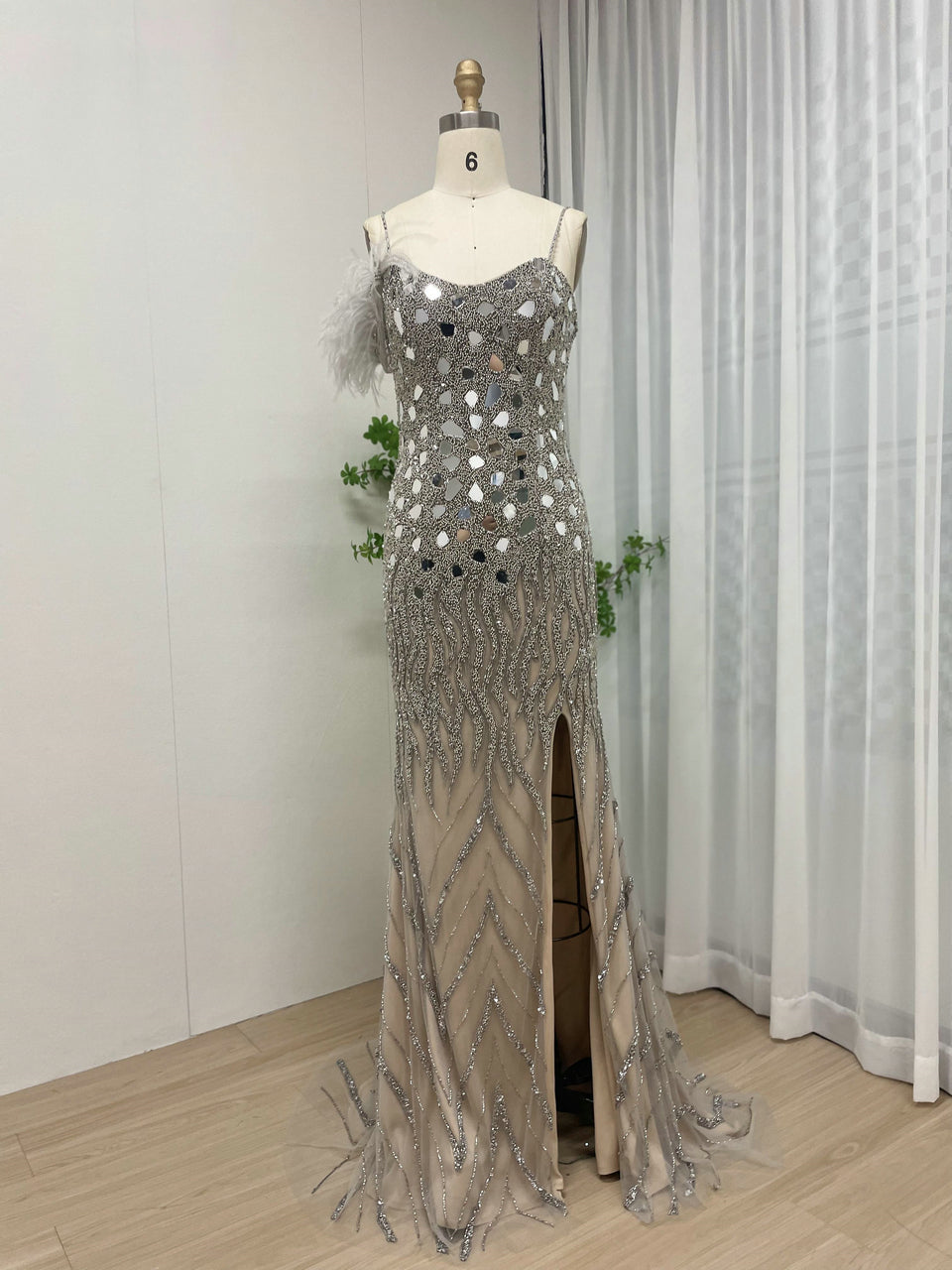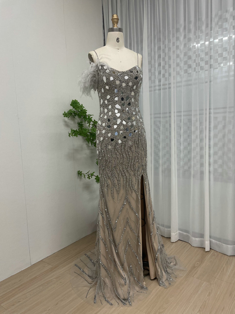 Glamorous Silver Sequin Prom Dress Side Slit Spaghetti Strap Formal Gown MY30034-2