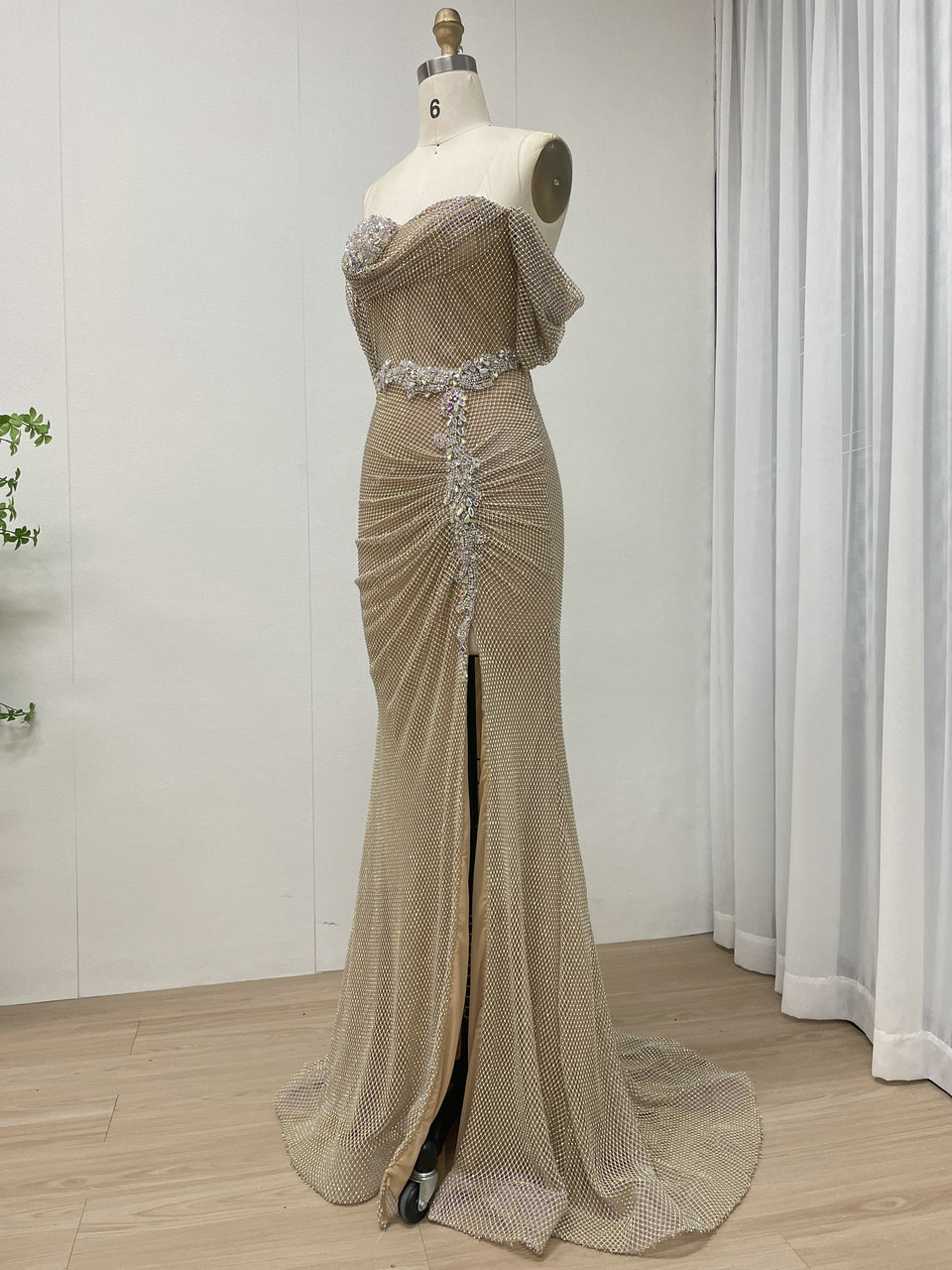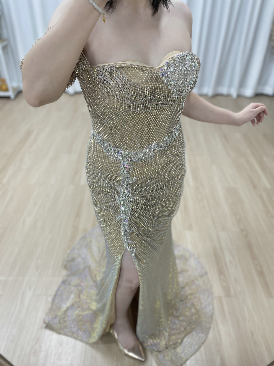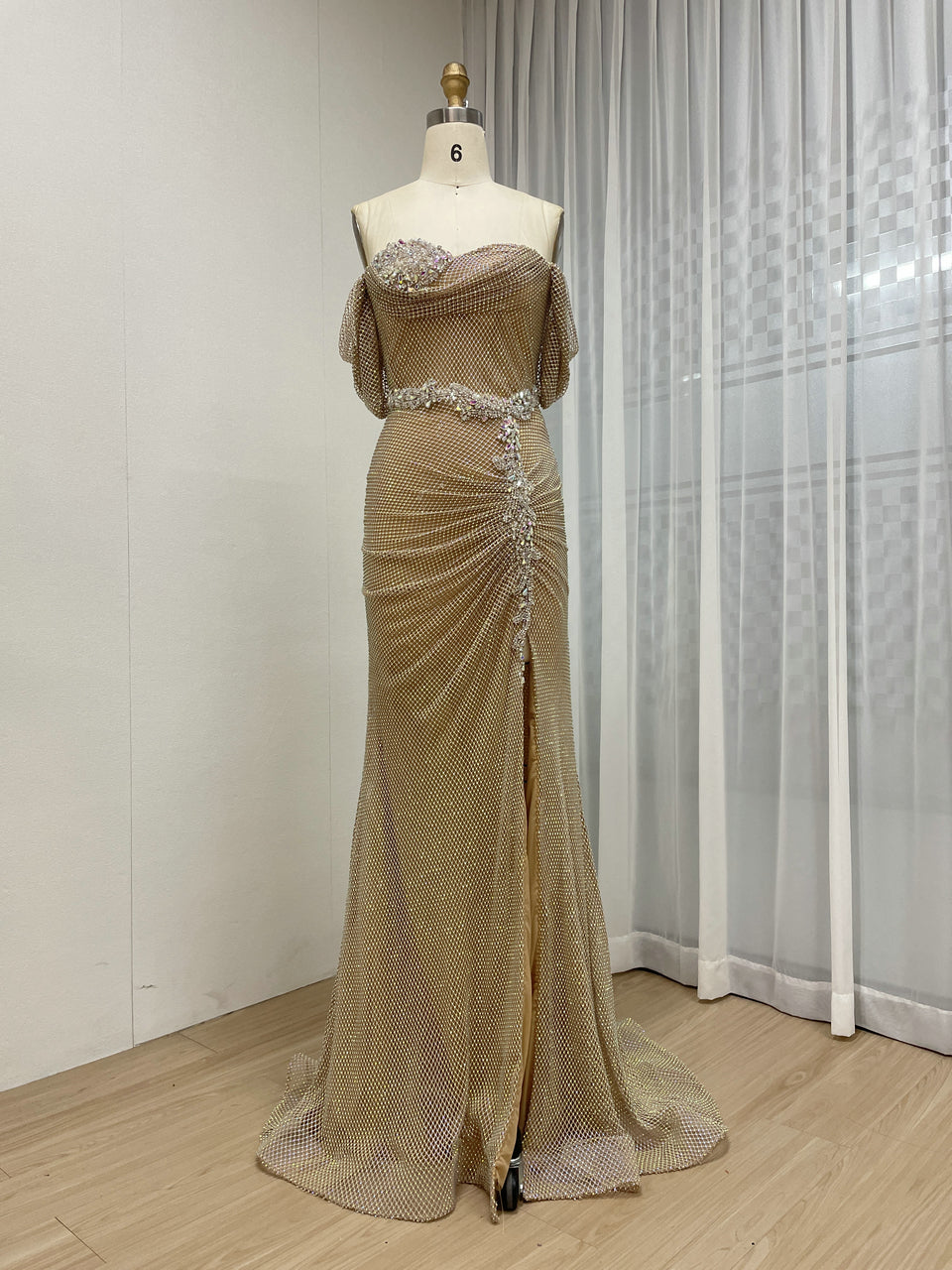 Glittering Ruched Gold Strapless Mermaid Gown with Slit MB40437