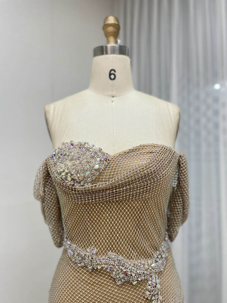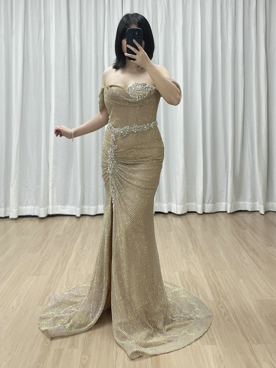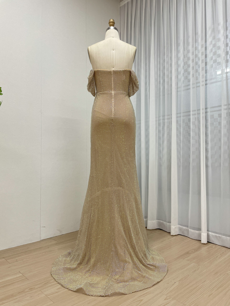 Glittering Ruched Gold Strapless Mermaid Gown with Slit MB40437