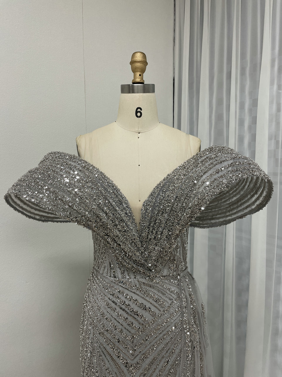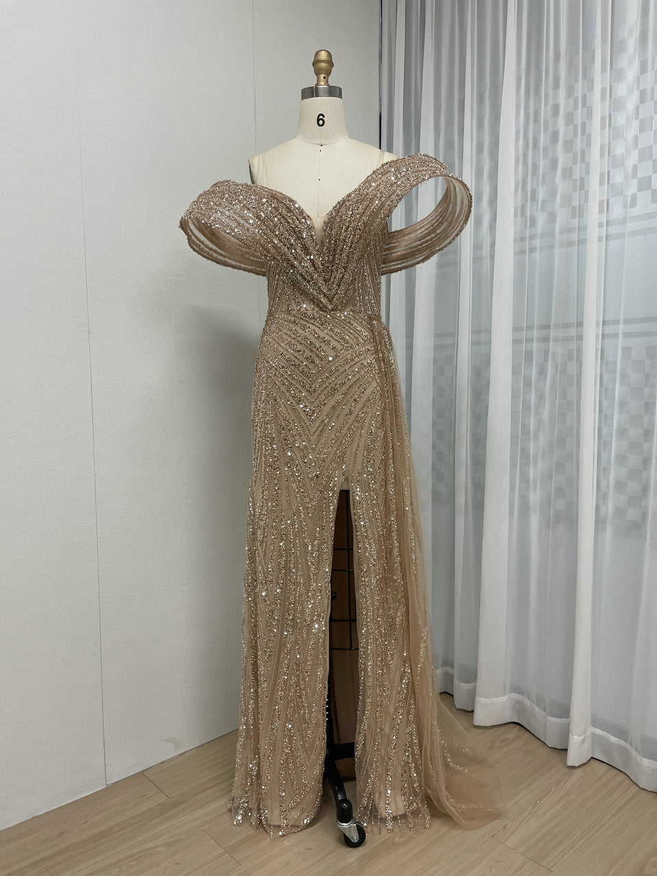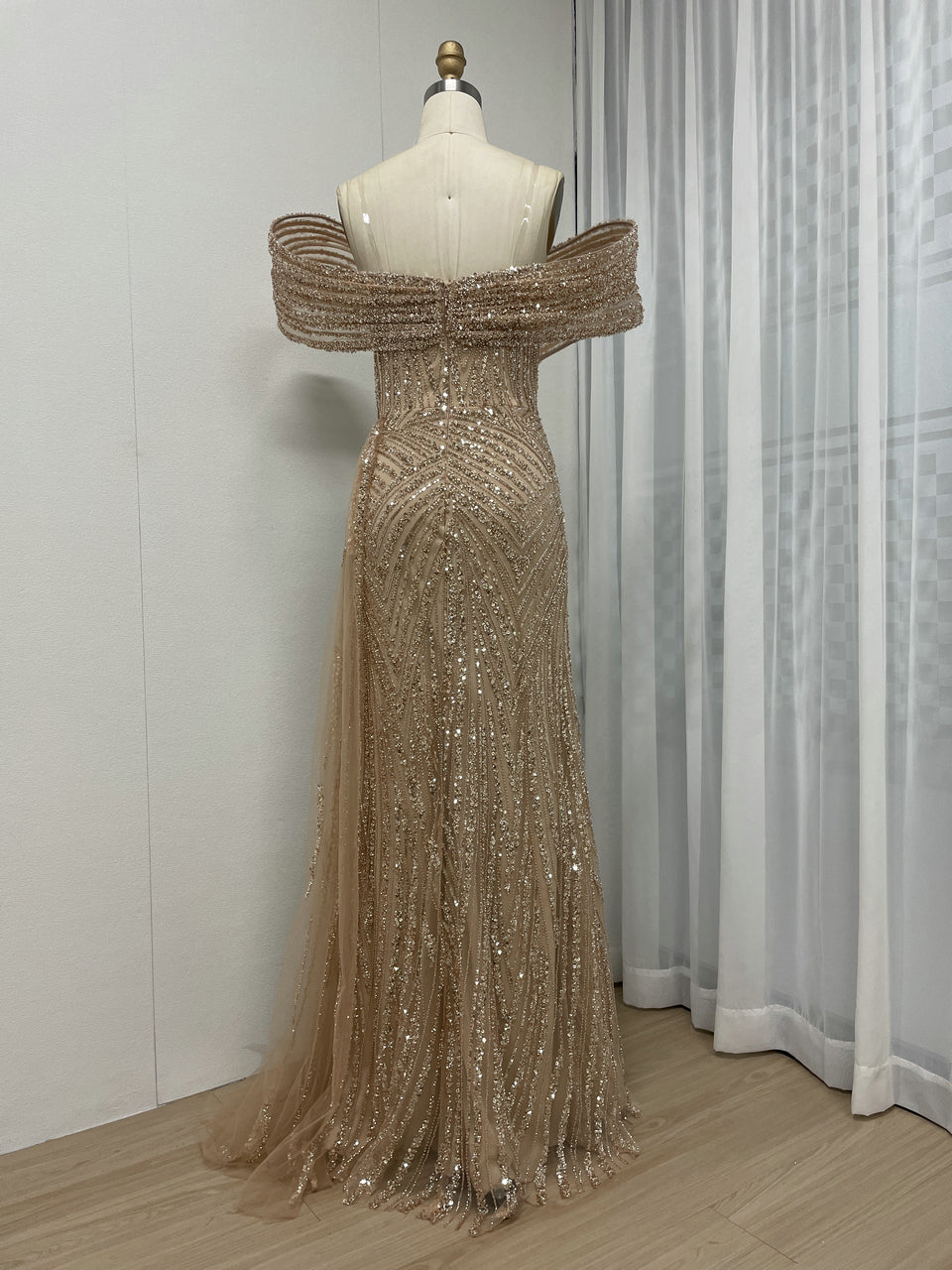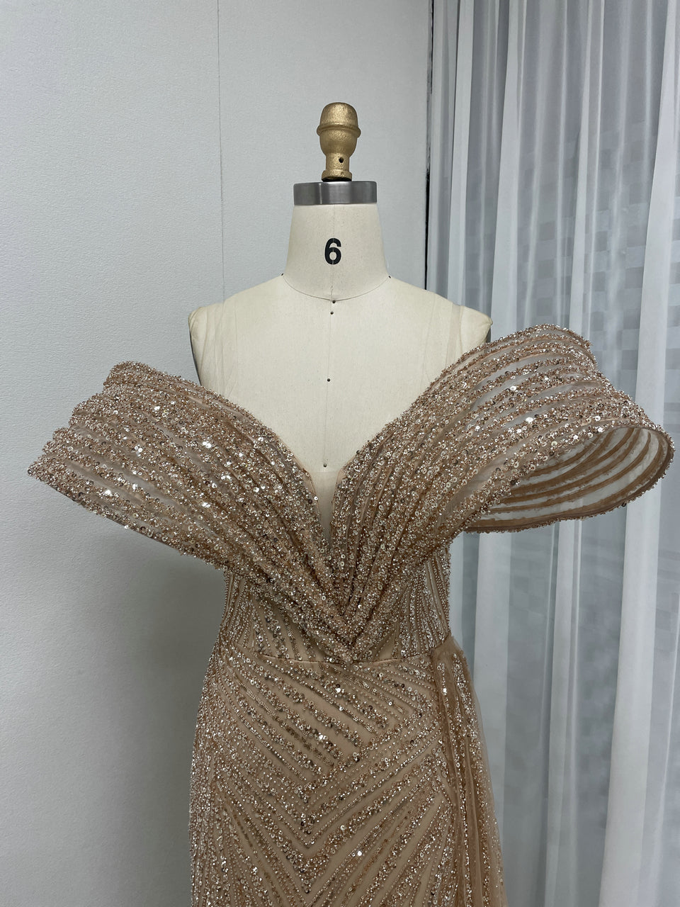 Gold Off-Shoulder Sequin Dress Ruffle Train Prom Gala Wear MY30125B
