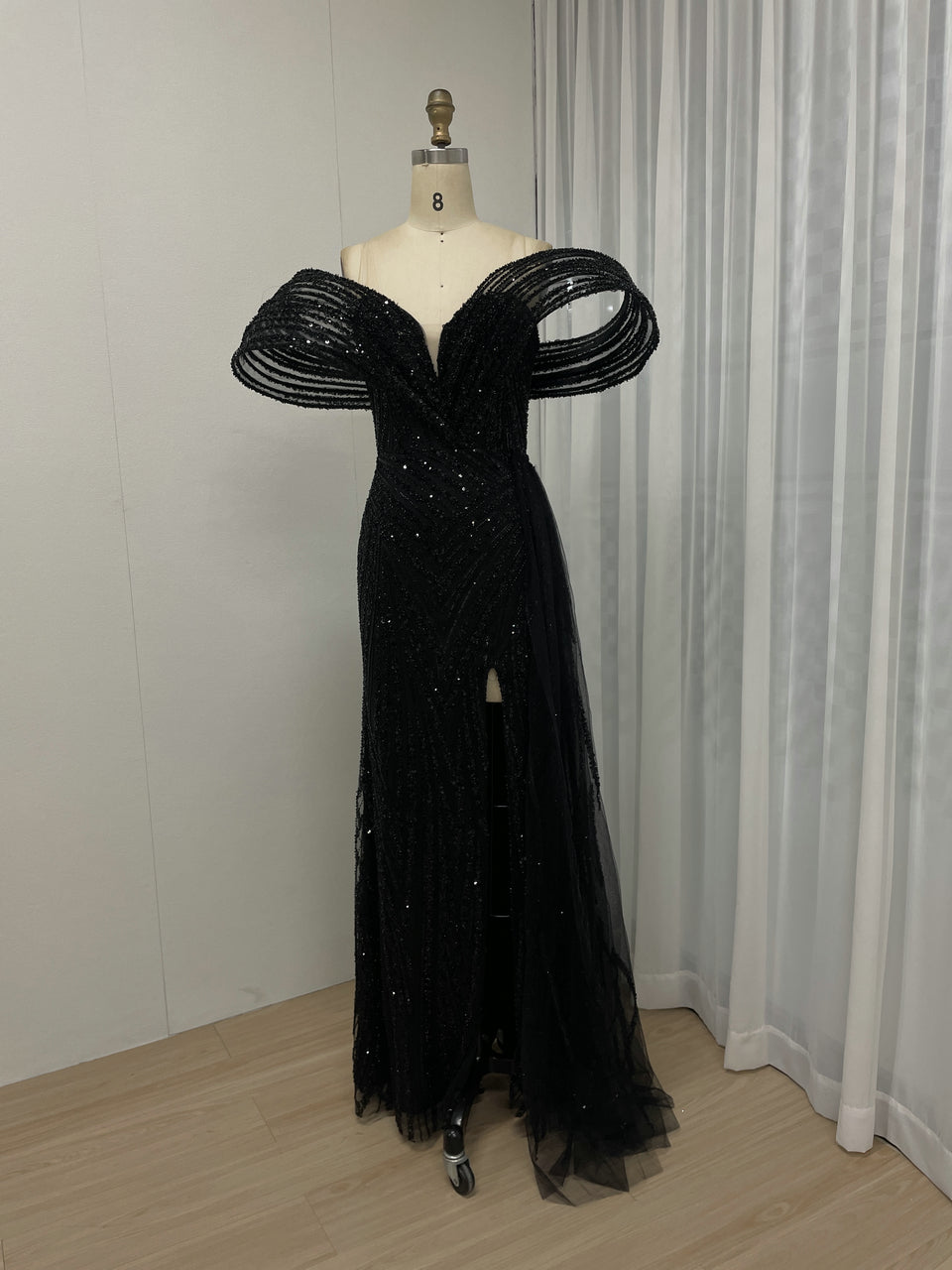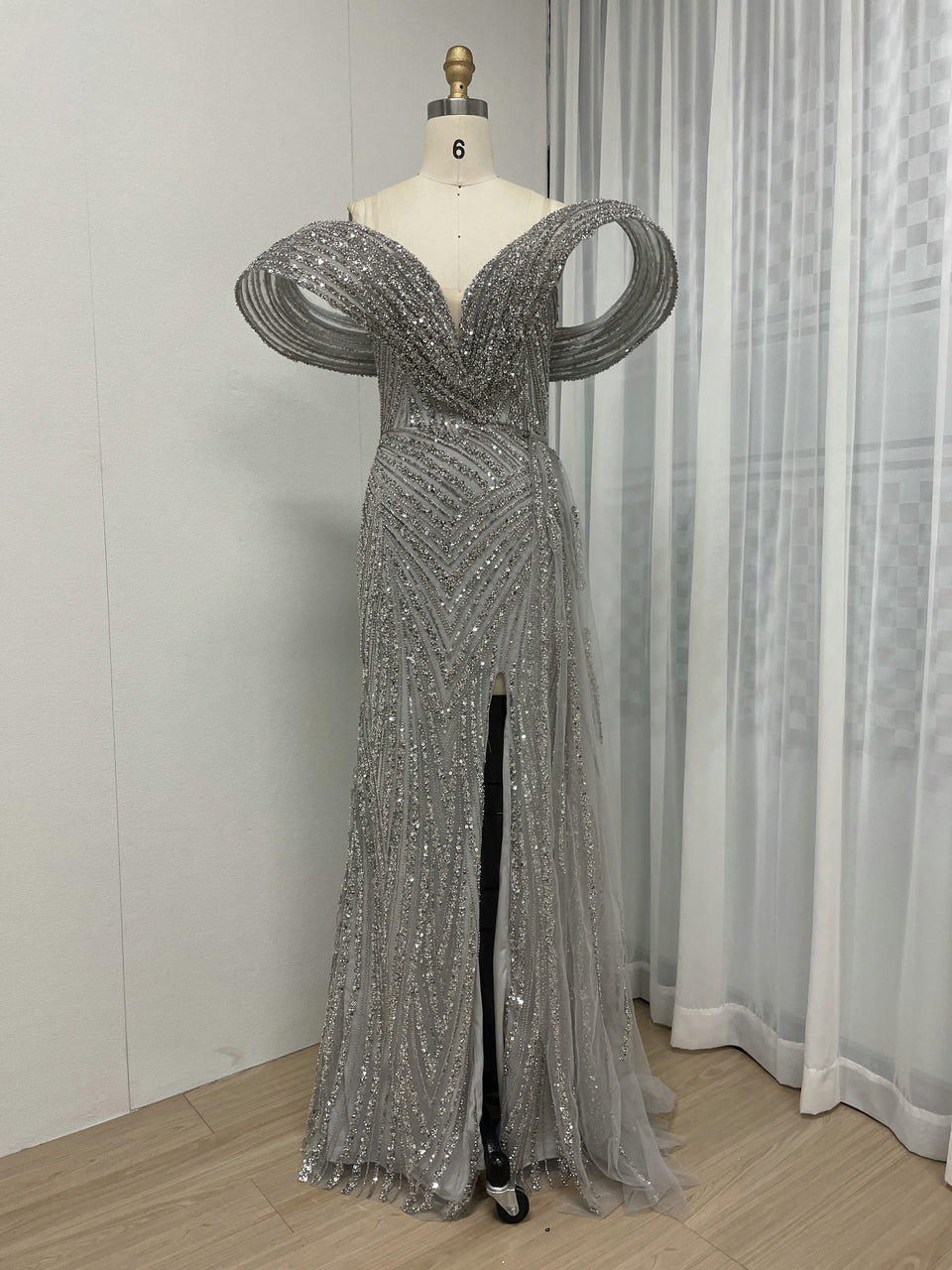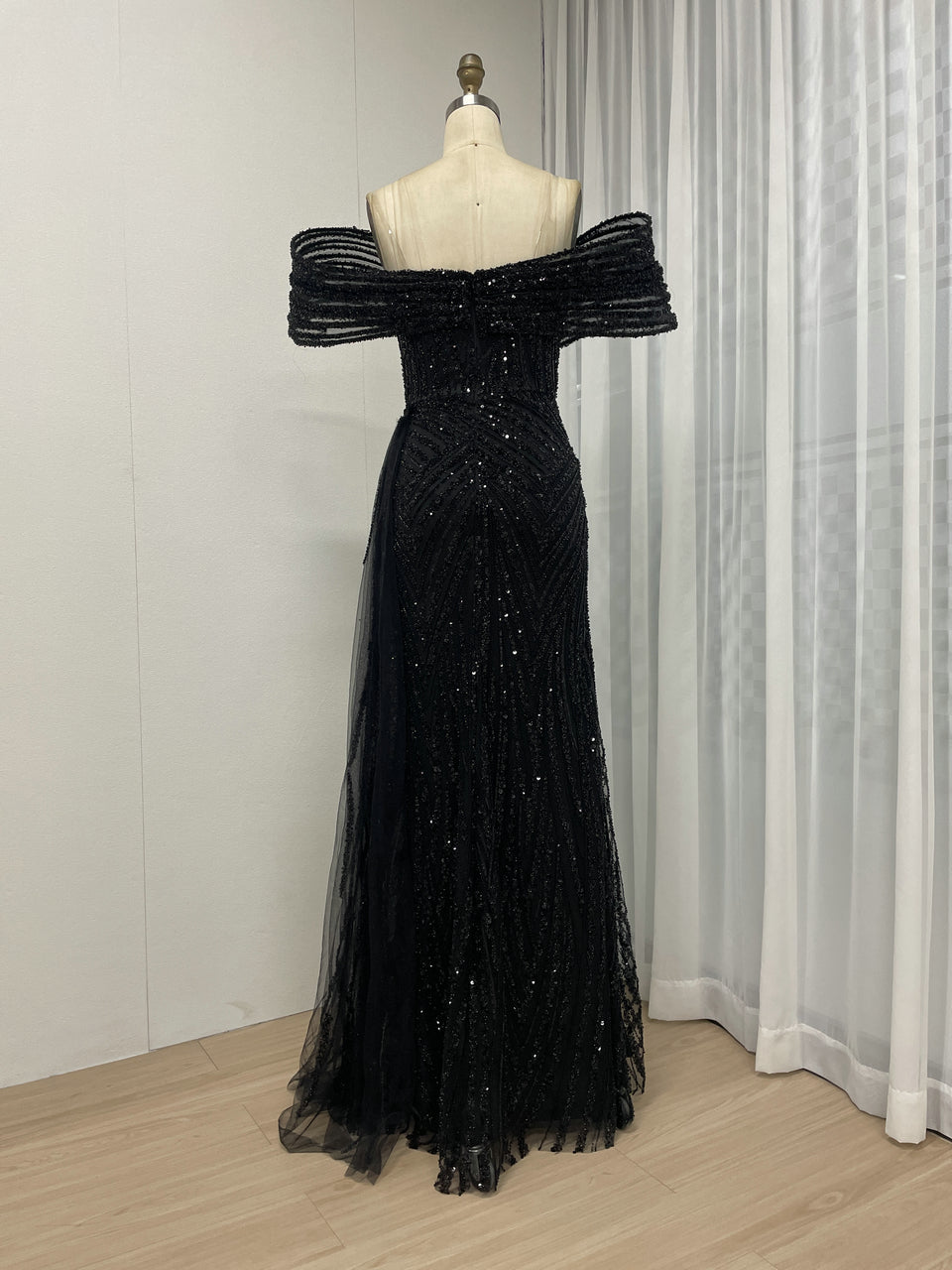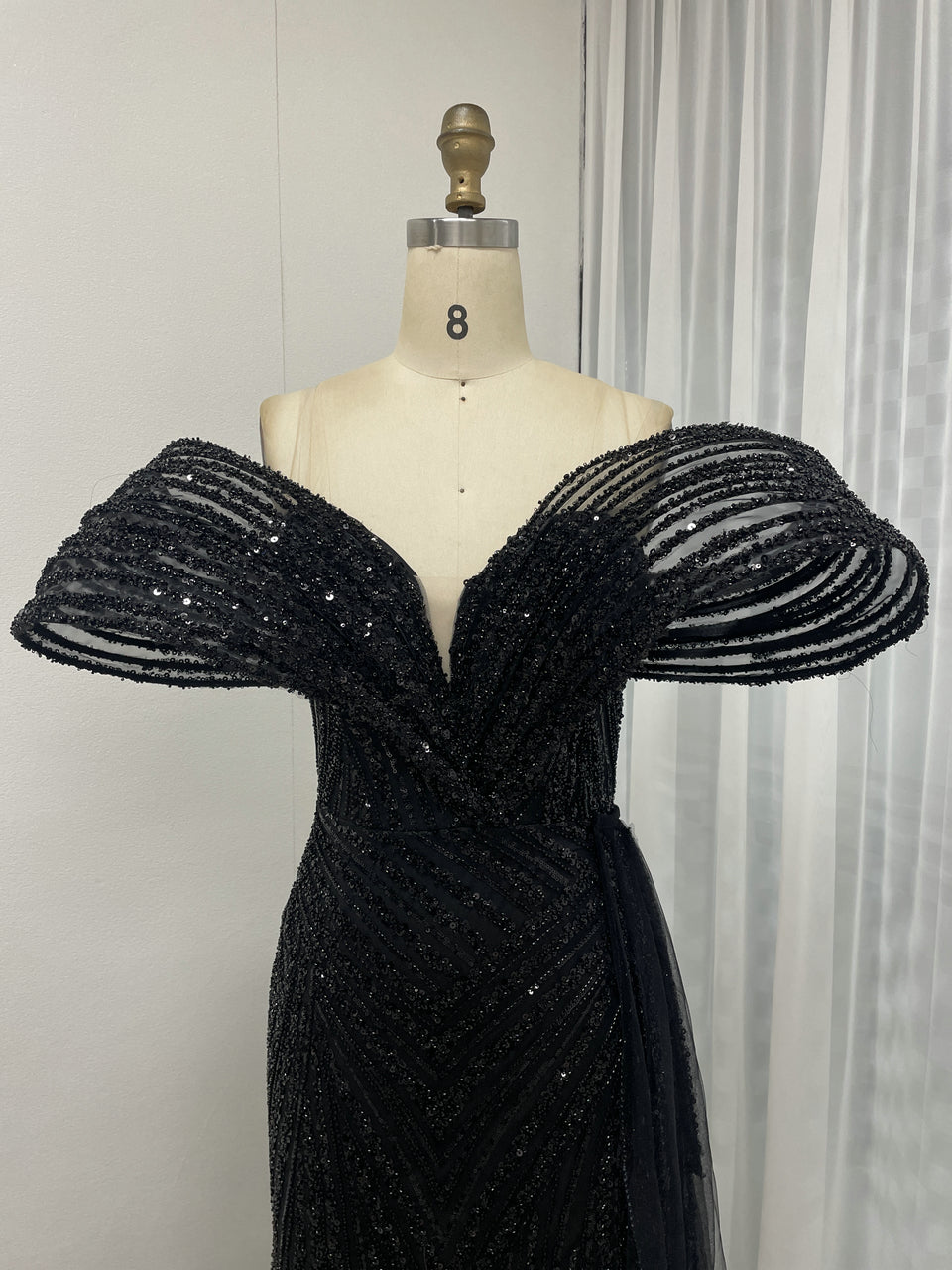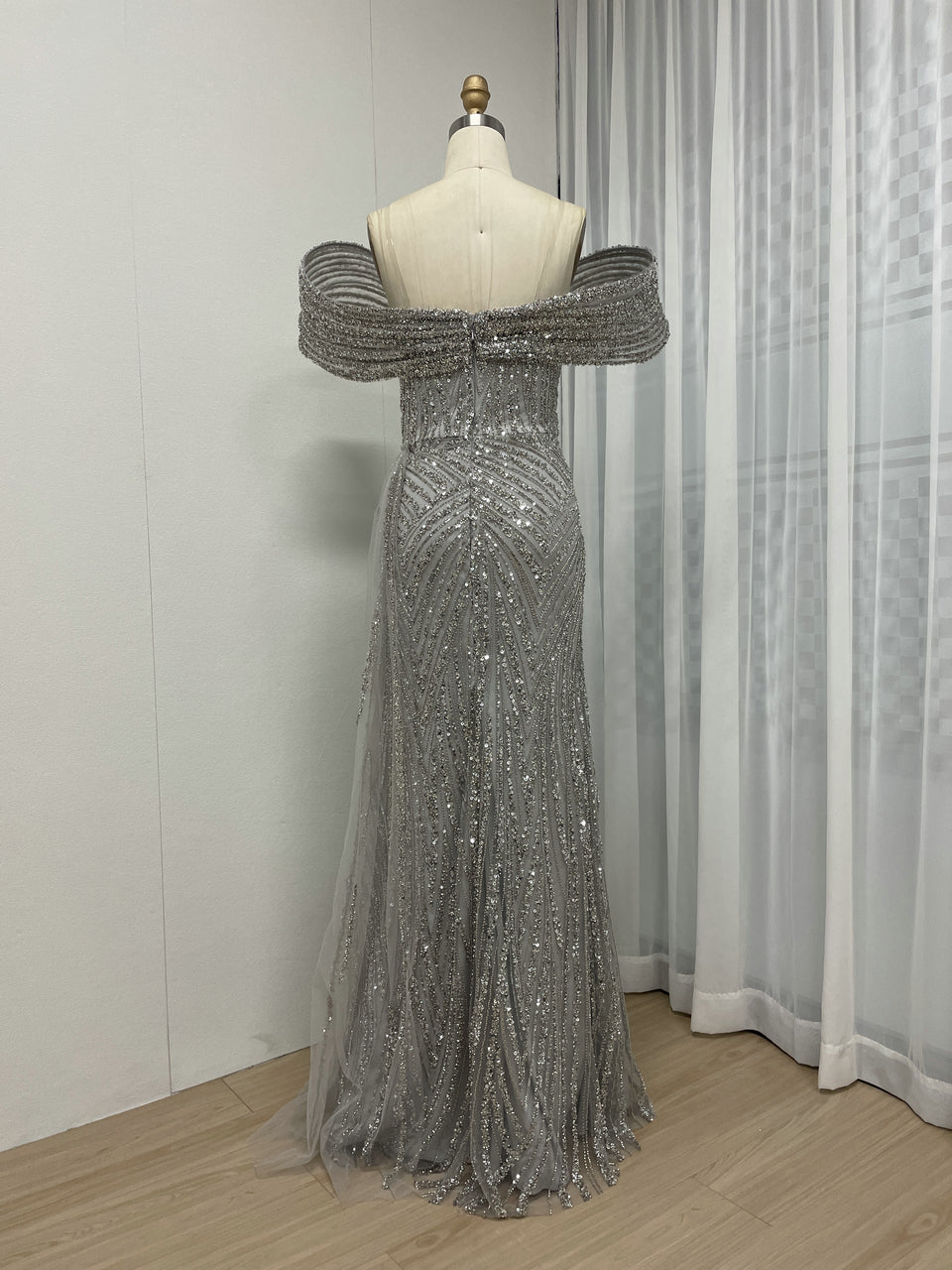 Gold Off-Shoulder Sequin Dress Ruffle Train Prom Gala Wear MY30125B