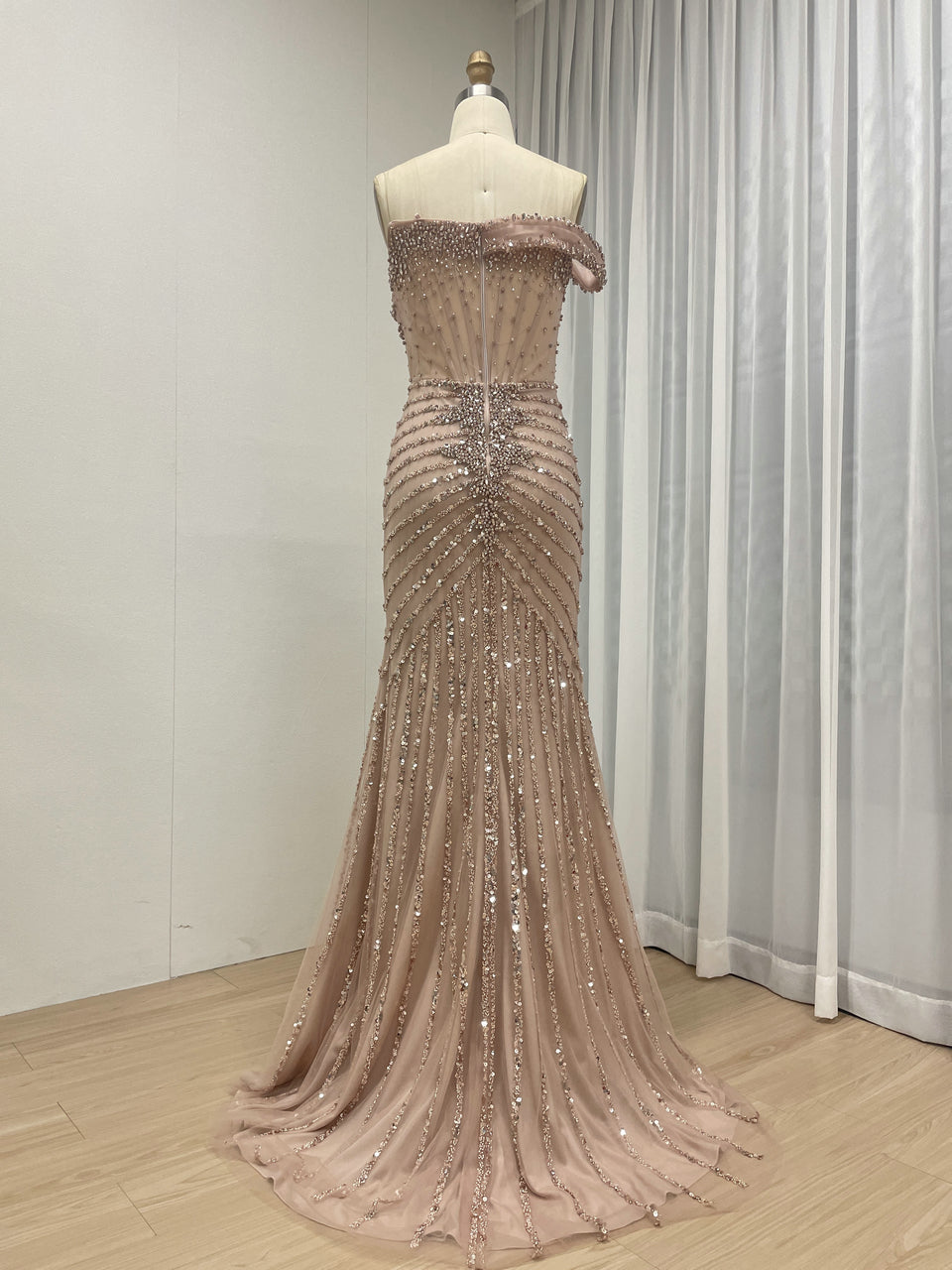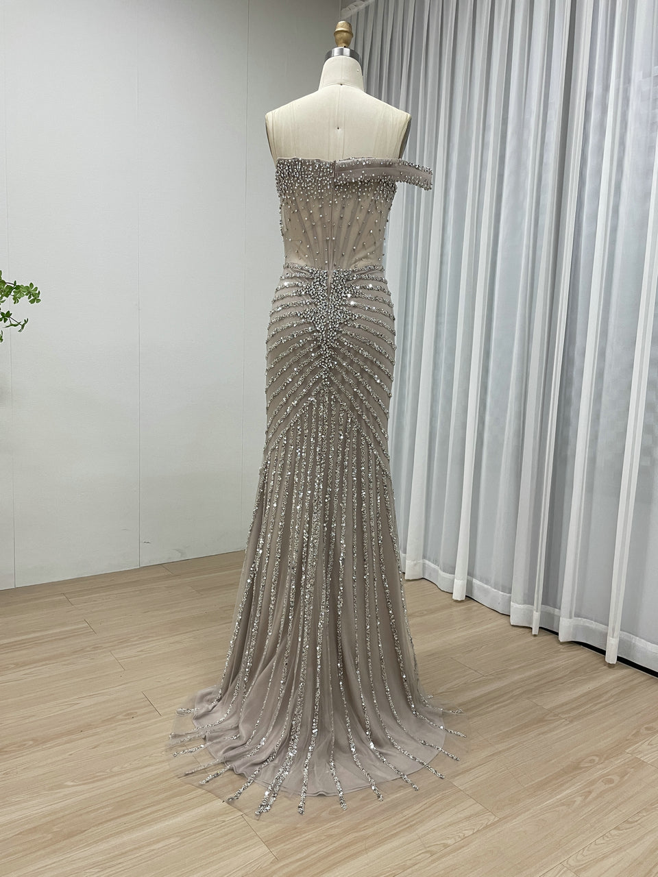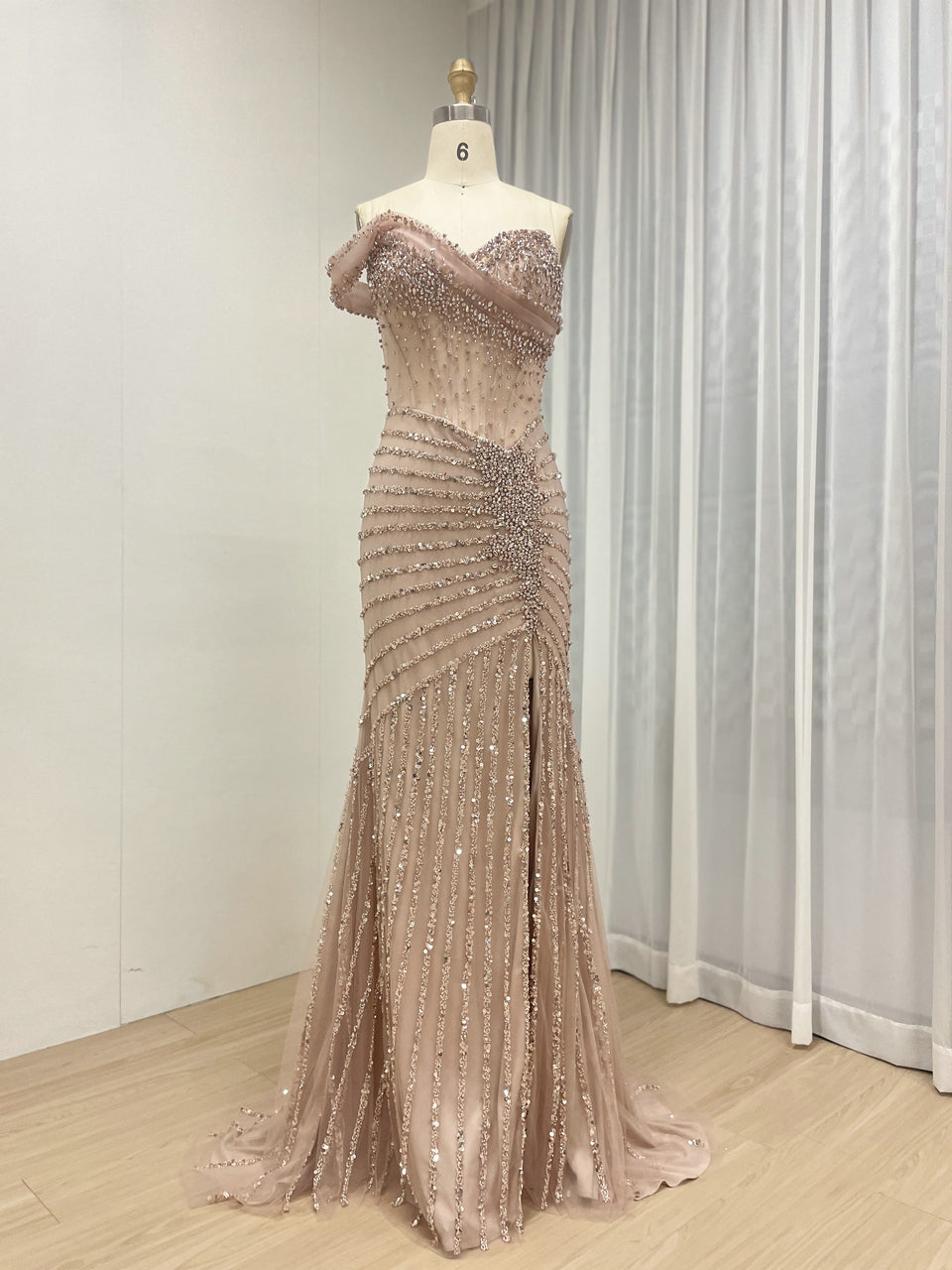 Modern sophistication meets timeless glamour in this linear beaded evening gown. The design features a sheer boned corset bodice adorned with intricate crystals and an elegant off-the-shoulder neckline. Geometric beaded lines elongate the silhouette, leading down to a daring thigh-high slit for a contemporary edge. This neutral caramel-toned dress is the ultimate choice for red carpets, galas, or as a sophisticated bridesmaid look.