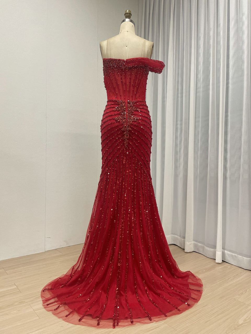 Gorgeous Beaded Off-the-Shoulder Evening Gown with Sheer Corset Bodice and Thigh-High Slit MB40396B