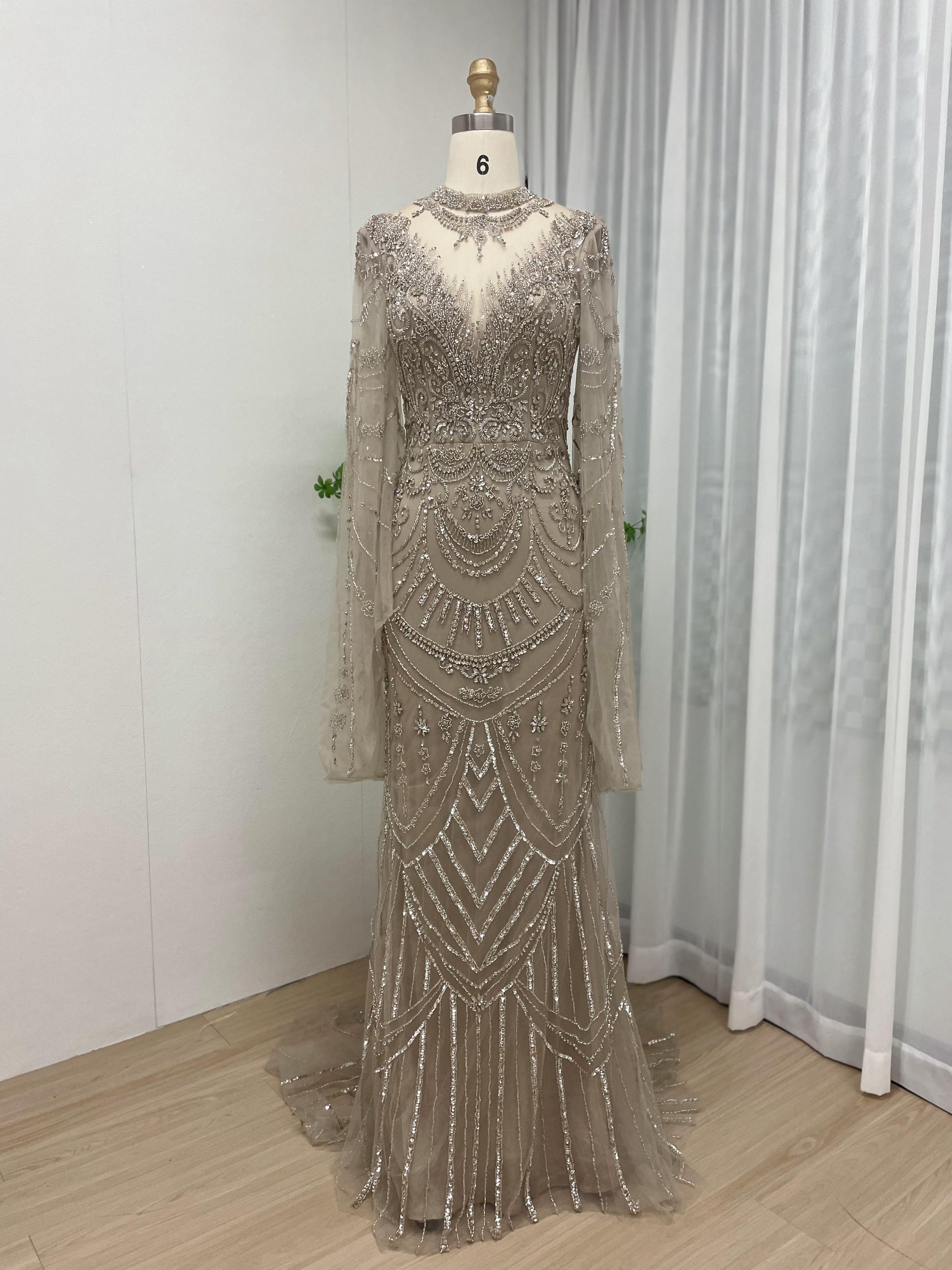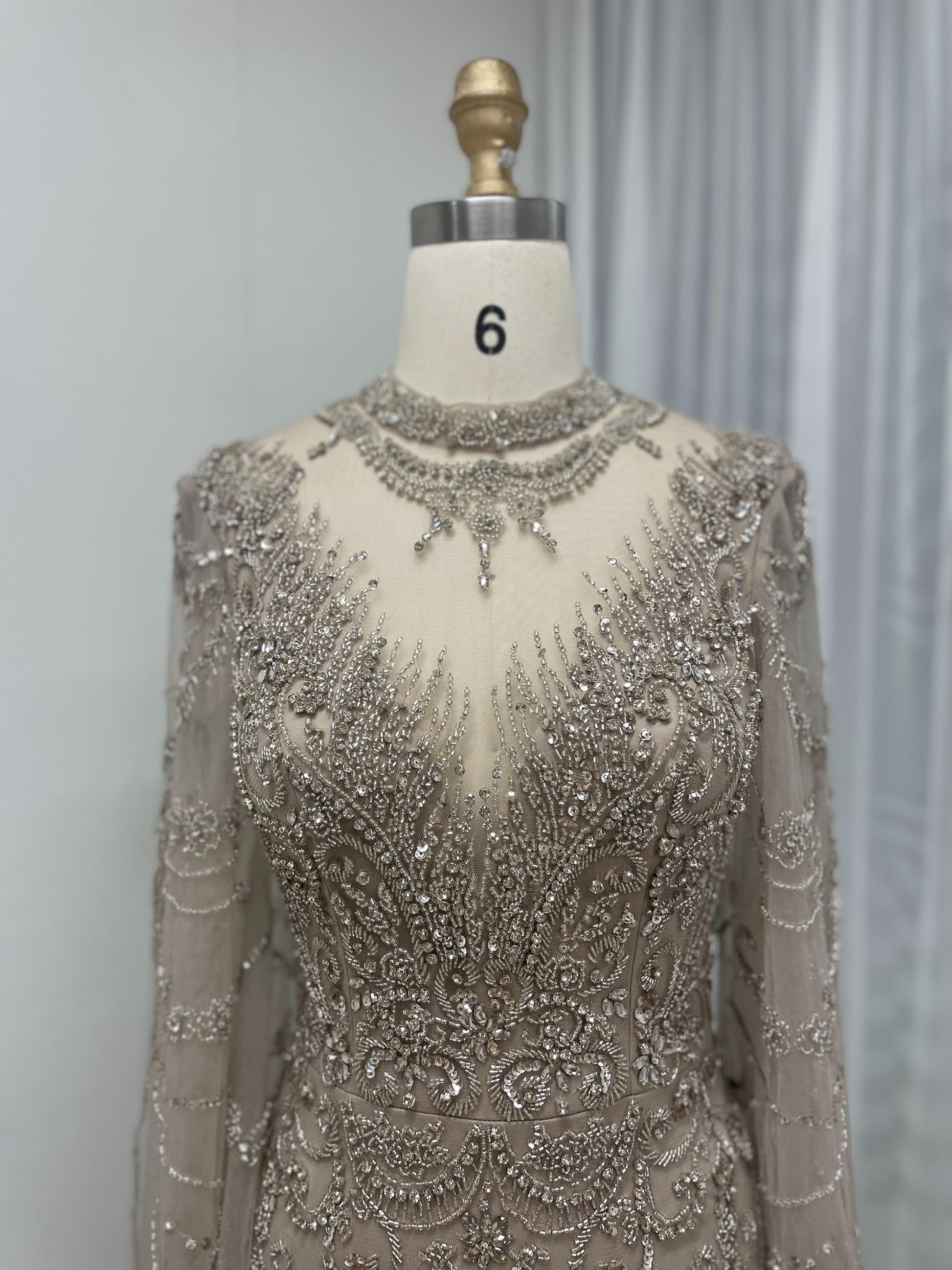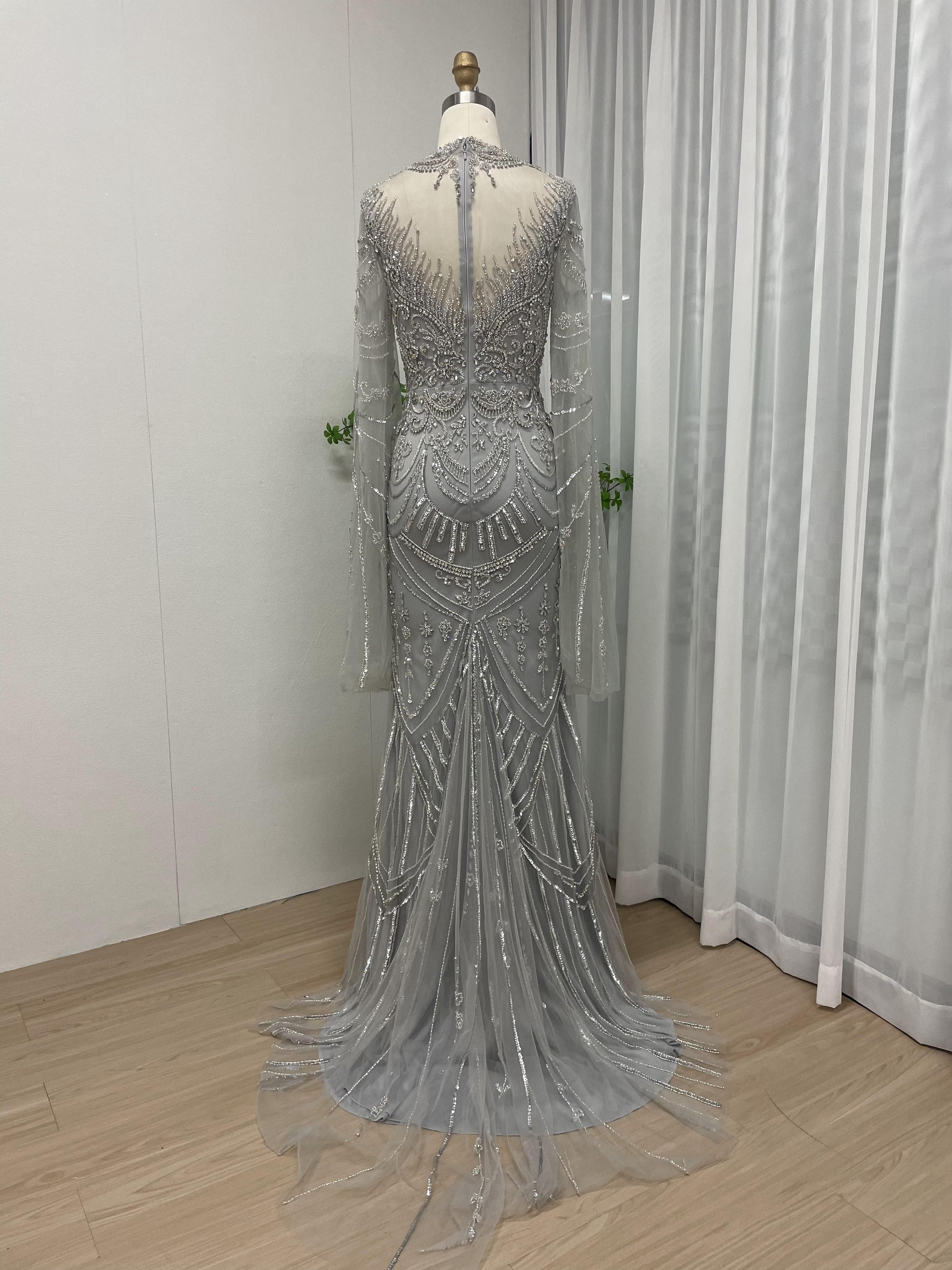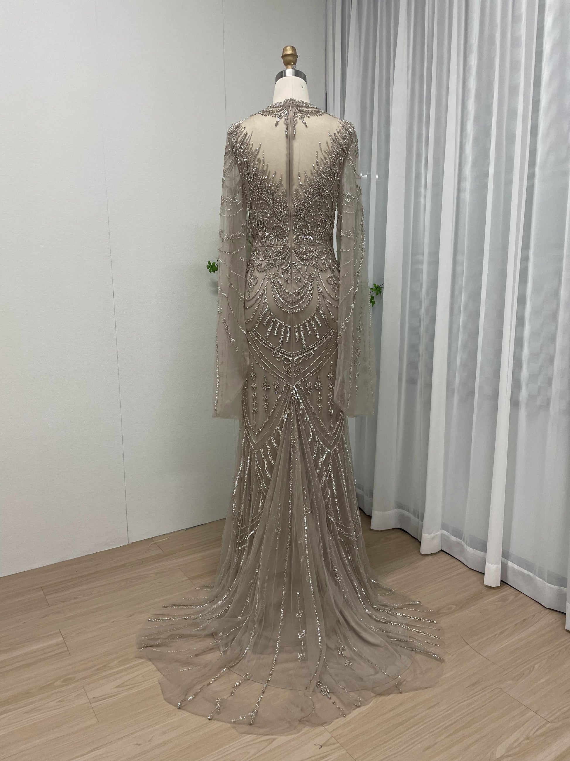 Graceful Handmade Beading Body Fitted Wedding Party Cape Sleeve Formal Gown MB40188
