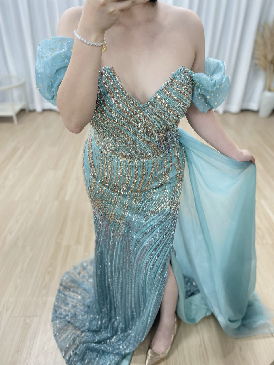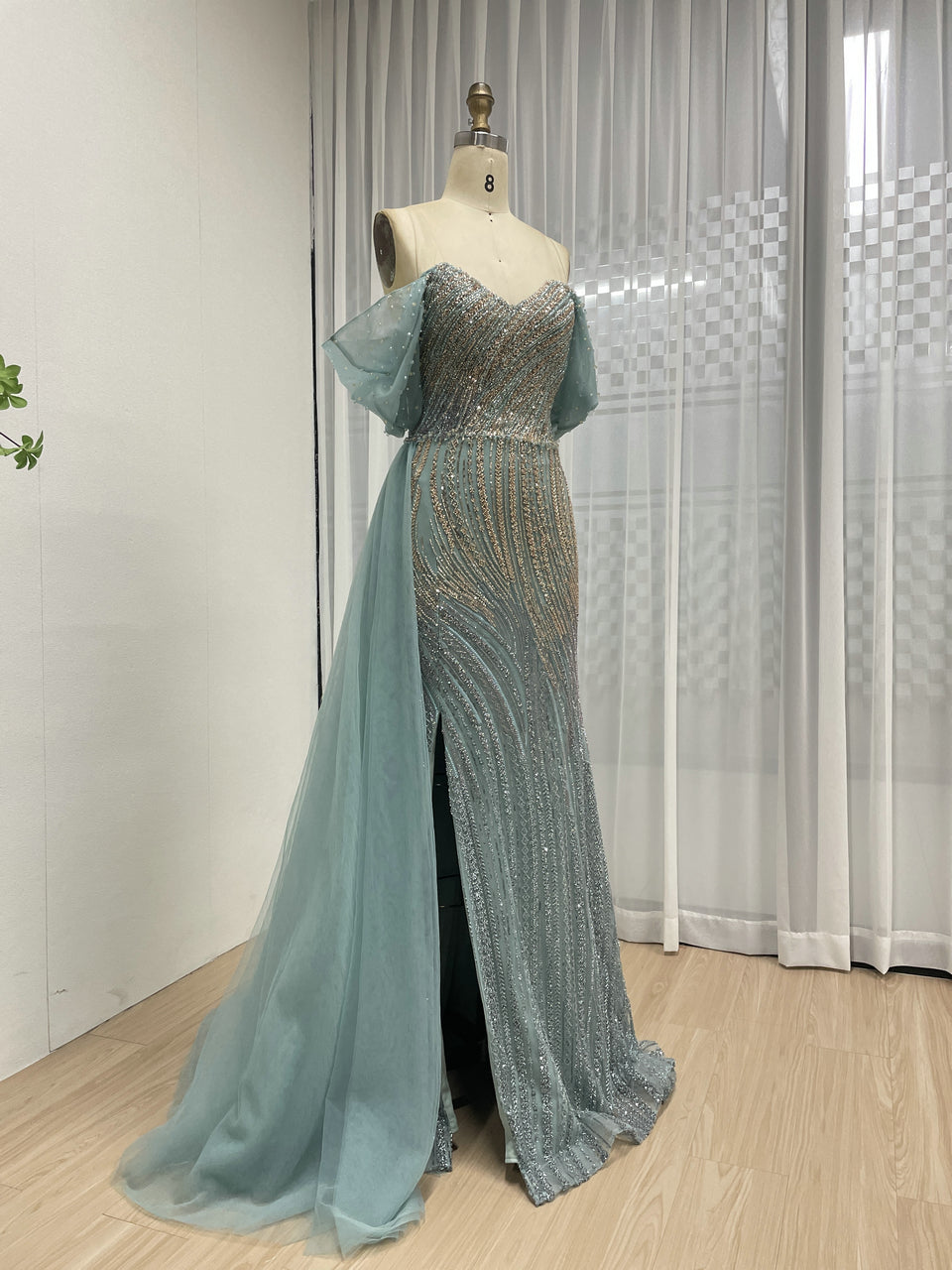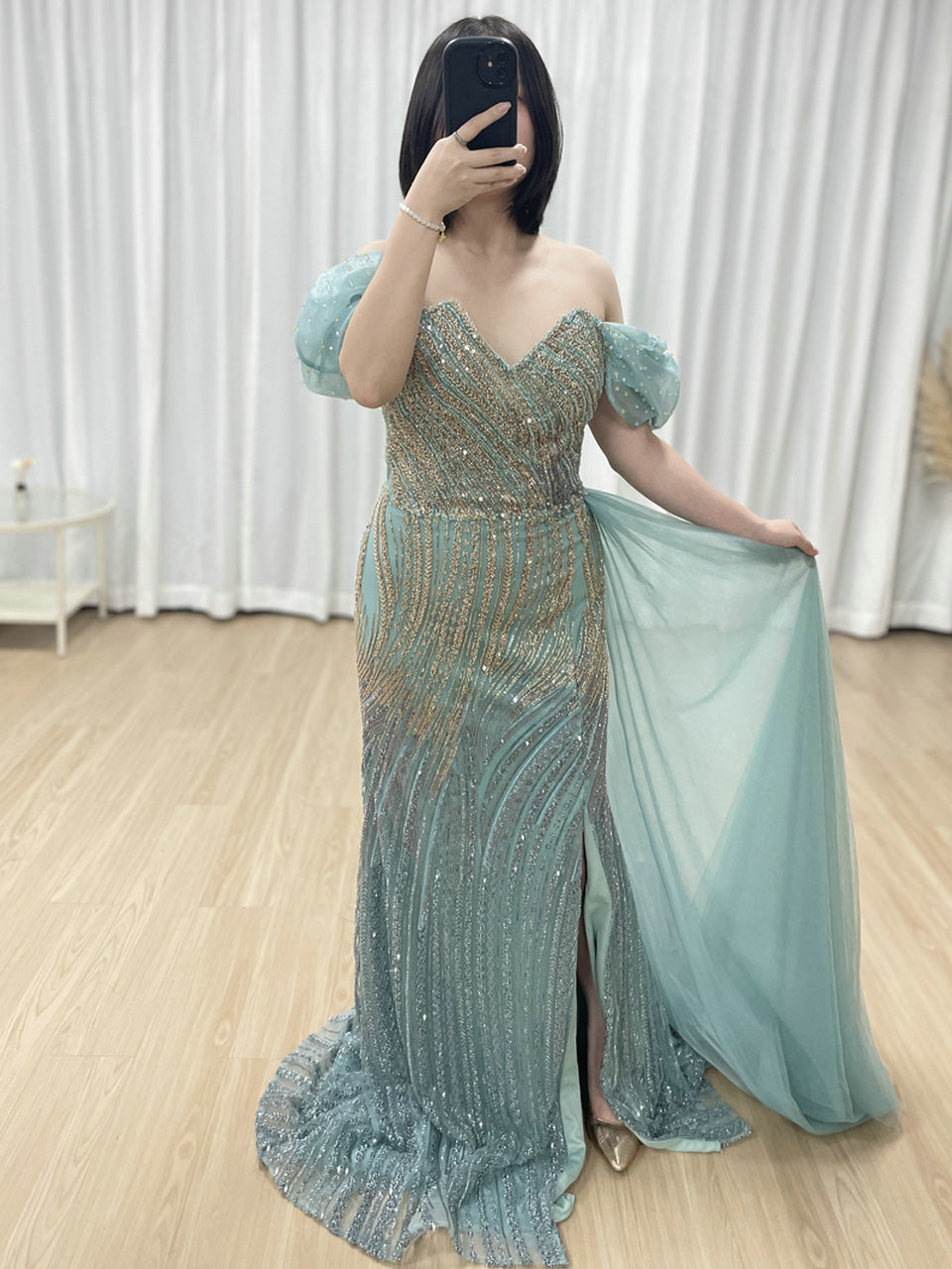 Green Luxurious Sweetheart Off Shoulder Prom Dresses with High Split for Women Dress Plus Size MB40419