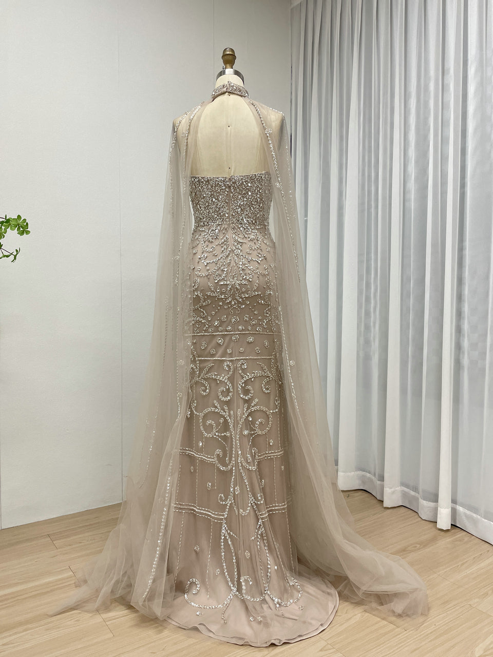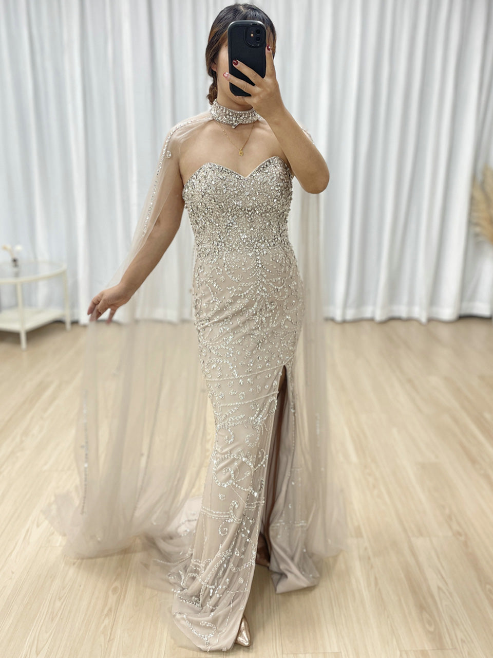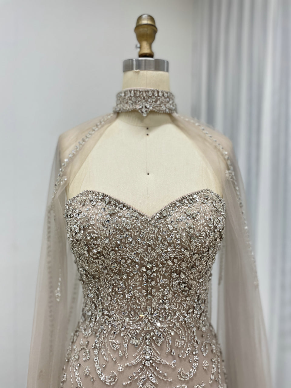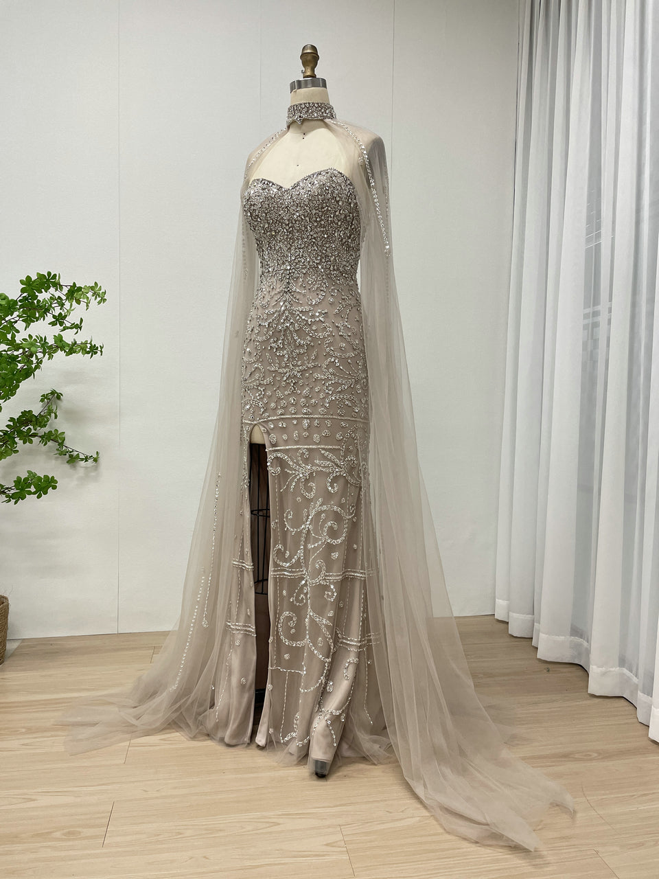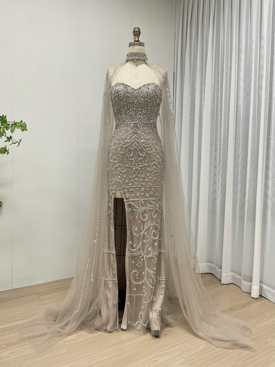 High Slit Dubai Evening Dress for Banquet Embellished Sparkling Beaded With Detachable Cape Sleeve MB40237-2