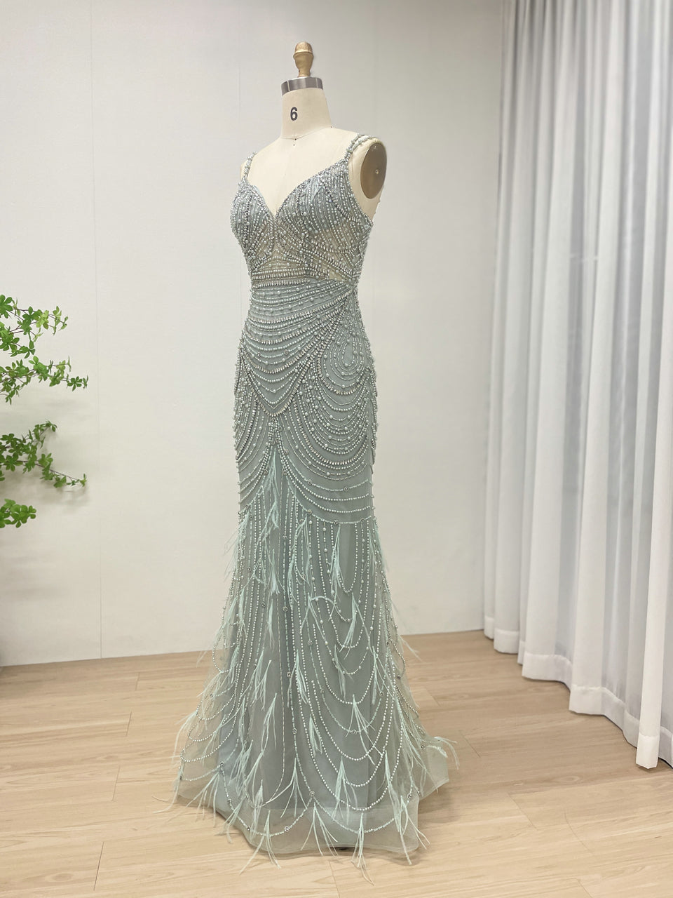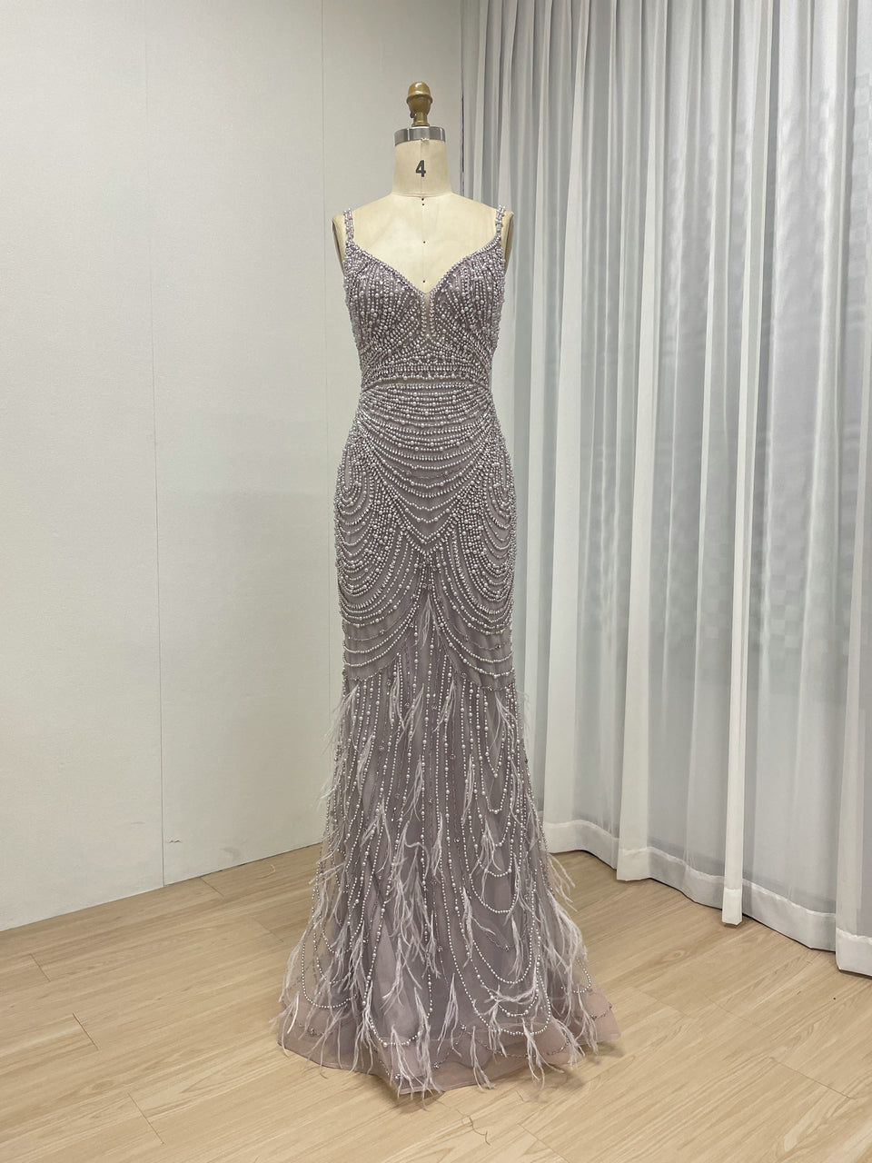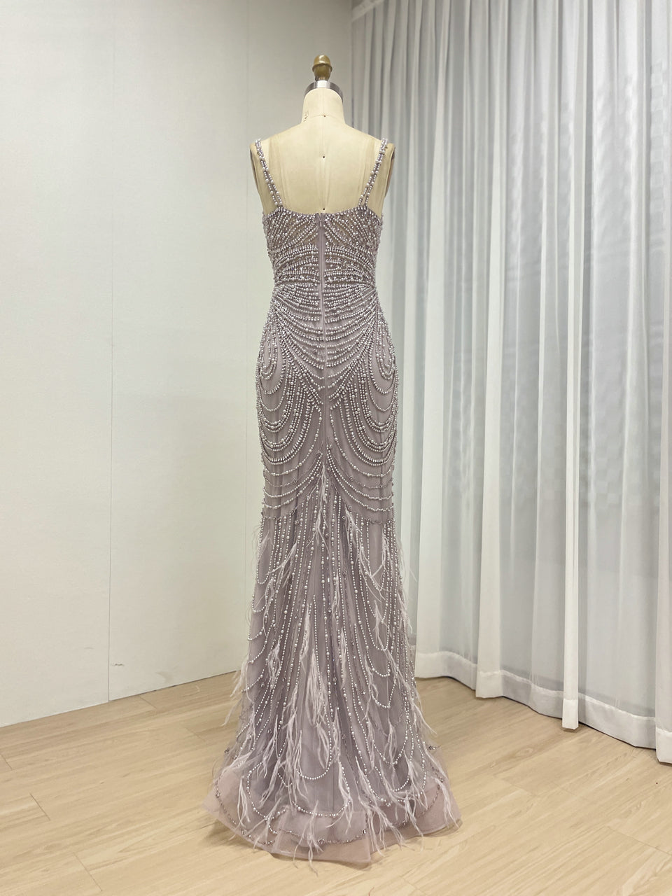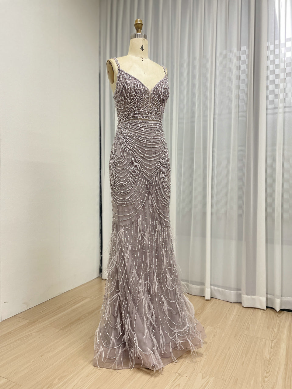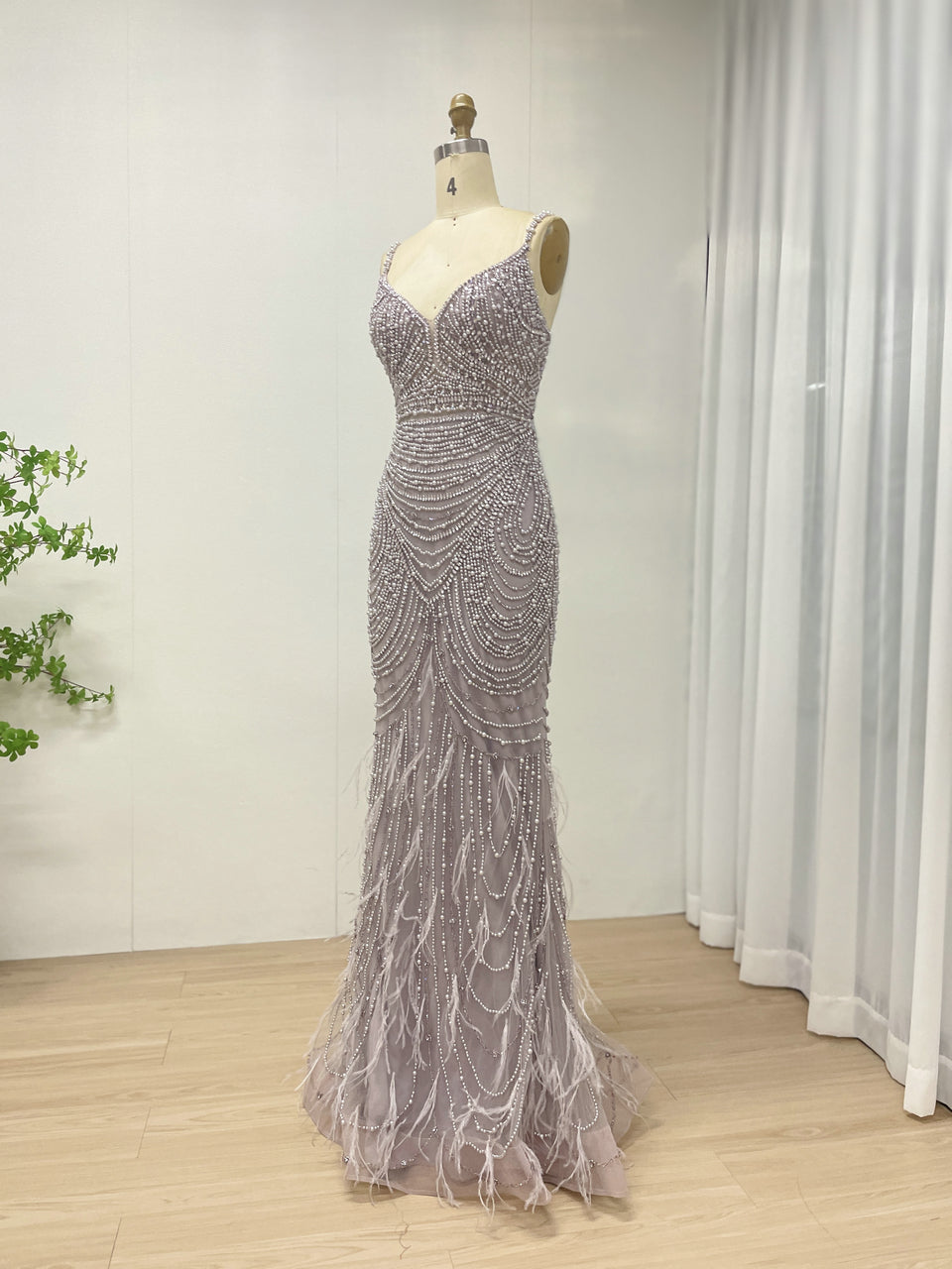 Lavender Spaghetti Strap V-Neck Beaded Mermaid Evening Gown Feather Hem Luxury Pearl Embellished Formal Prom Dress Women MY30128-2
