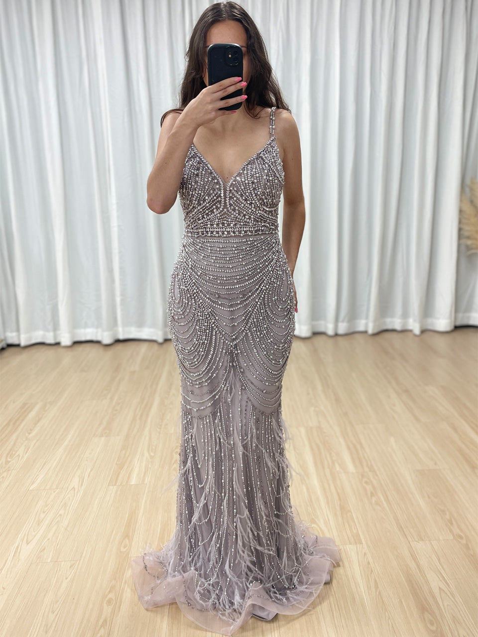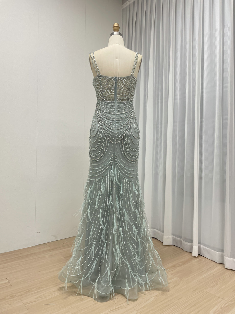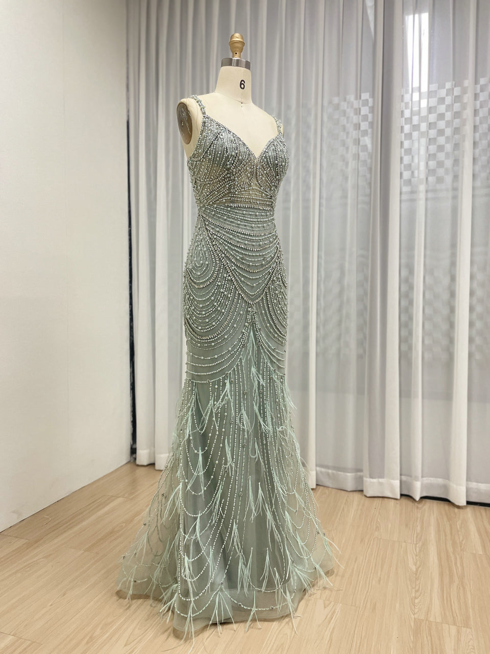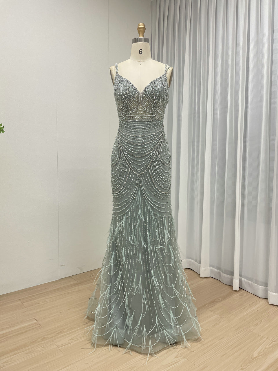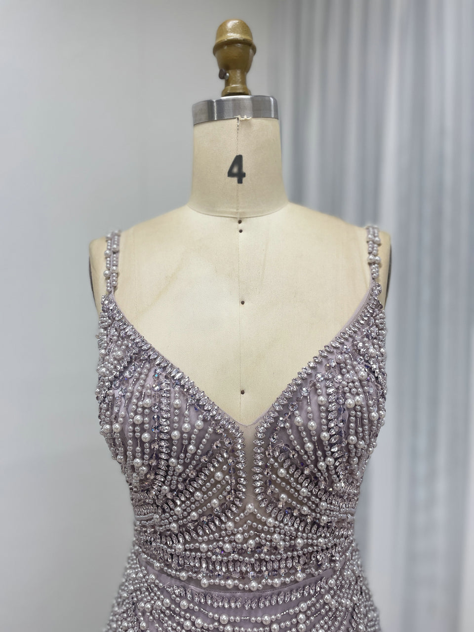 Lavender Spaghetti Strap V-Neck Beaded Mermaid Evening Gown Feather Hem Luxury Pearl Embellished Formal Prom Dress Women MY30128-2