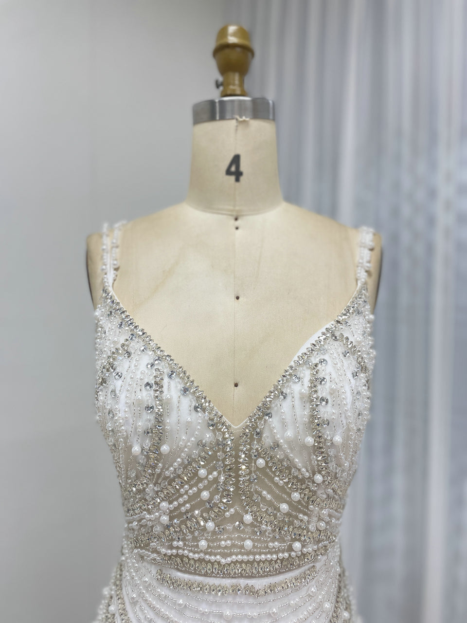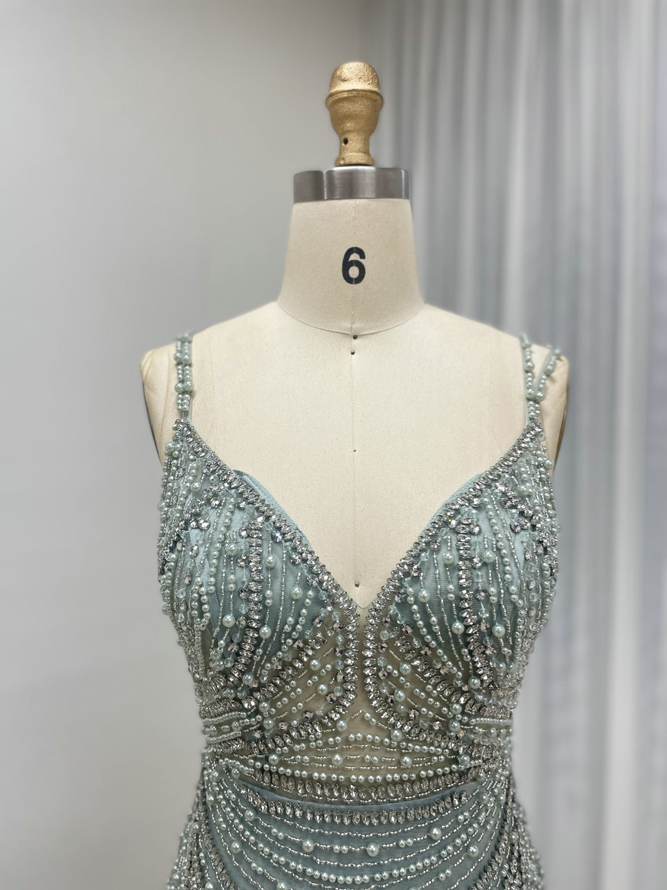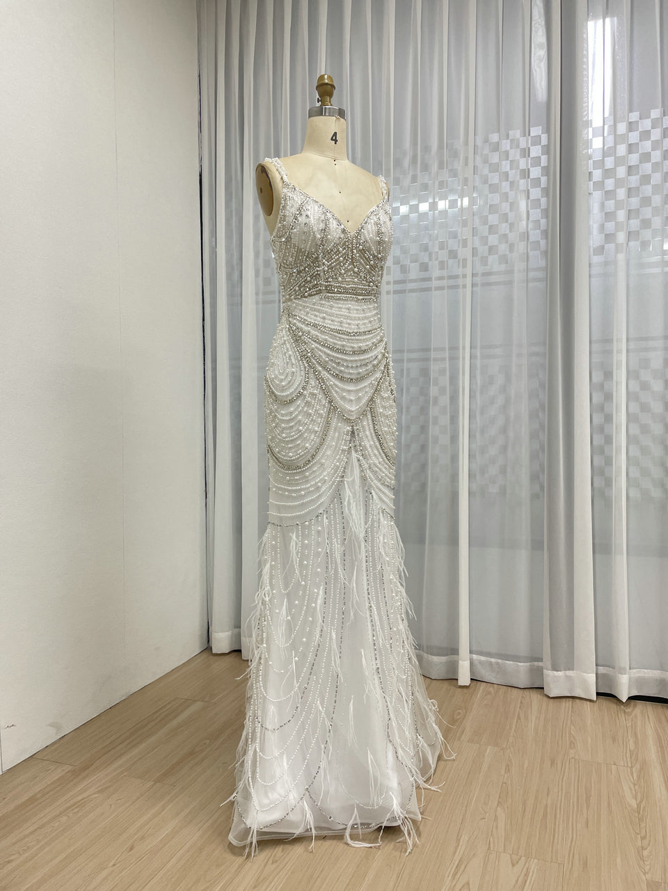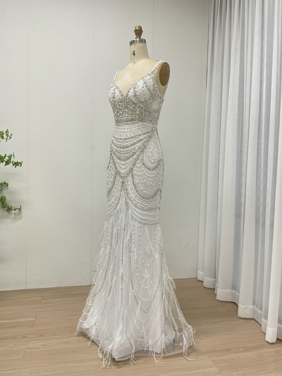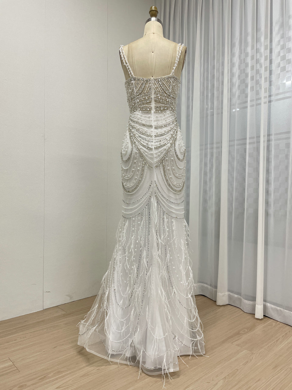 Lavender Spaghetti Strap V-Neck Beaded Mermaid Evening Gown Feather Hem Luxury Pearl Embellished Formal Prom Dress Women MY30128-2