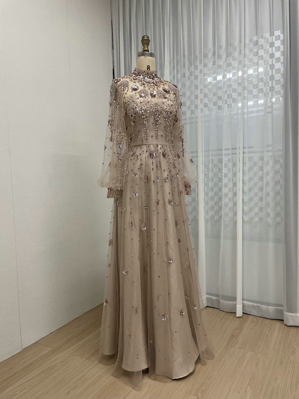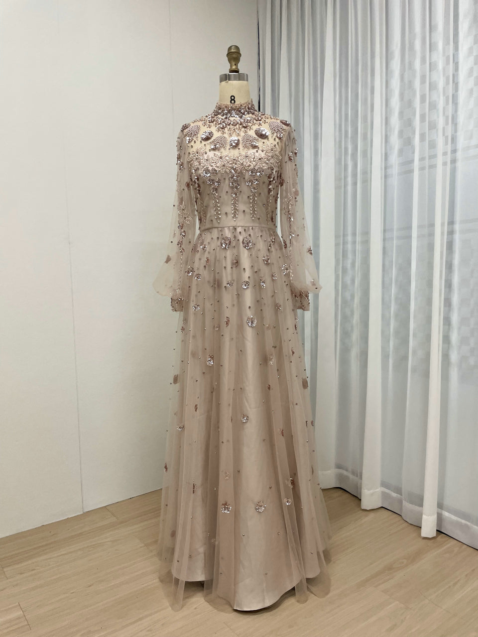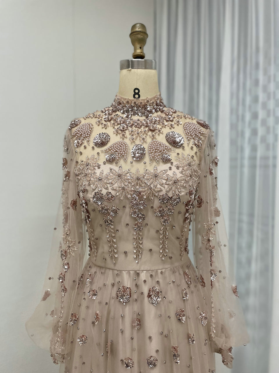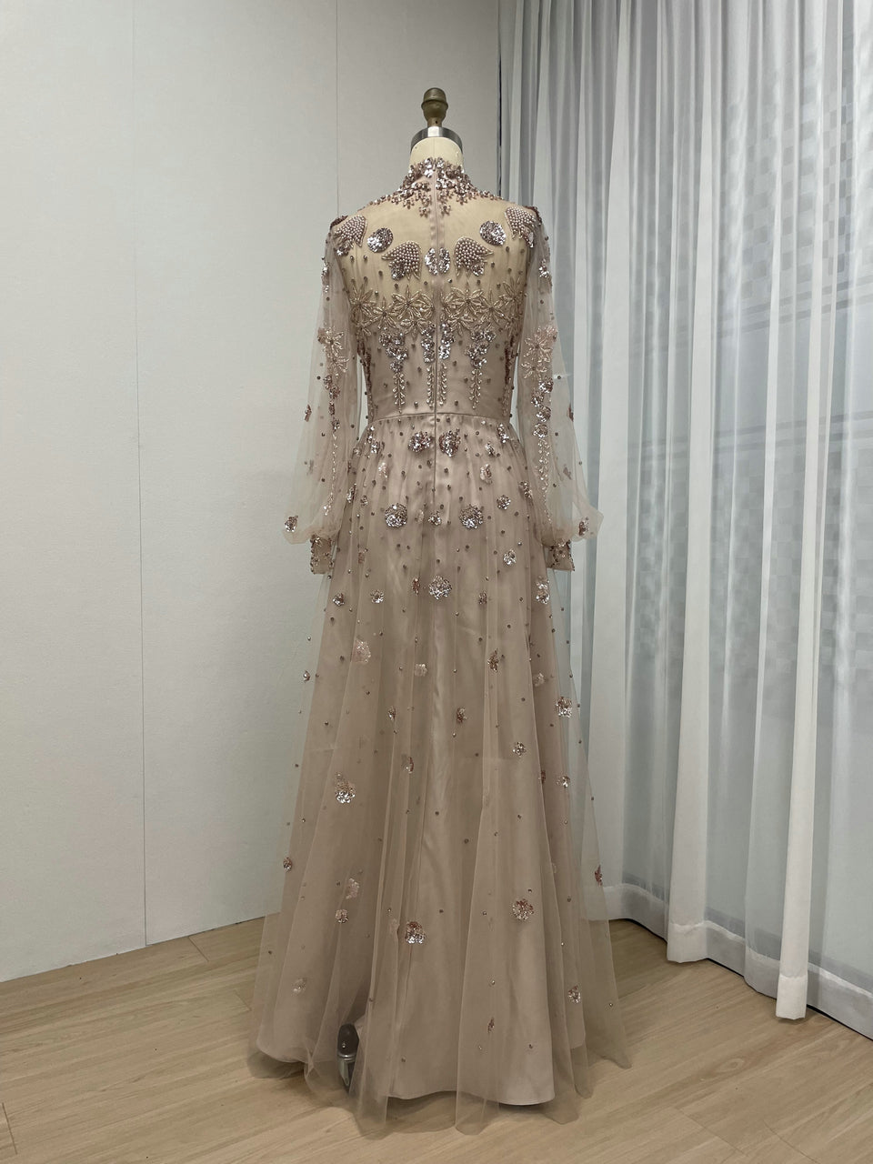 Long Sleeve Evening Dress Sequin Floral Embellished Prom Gown MY30117