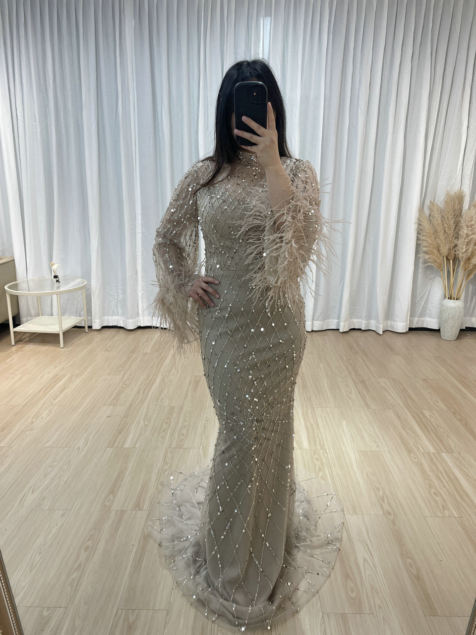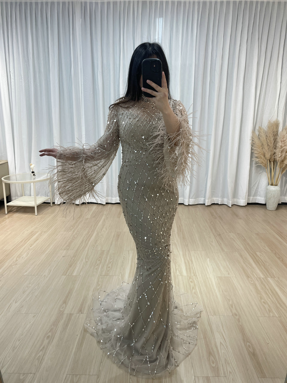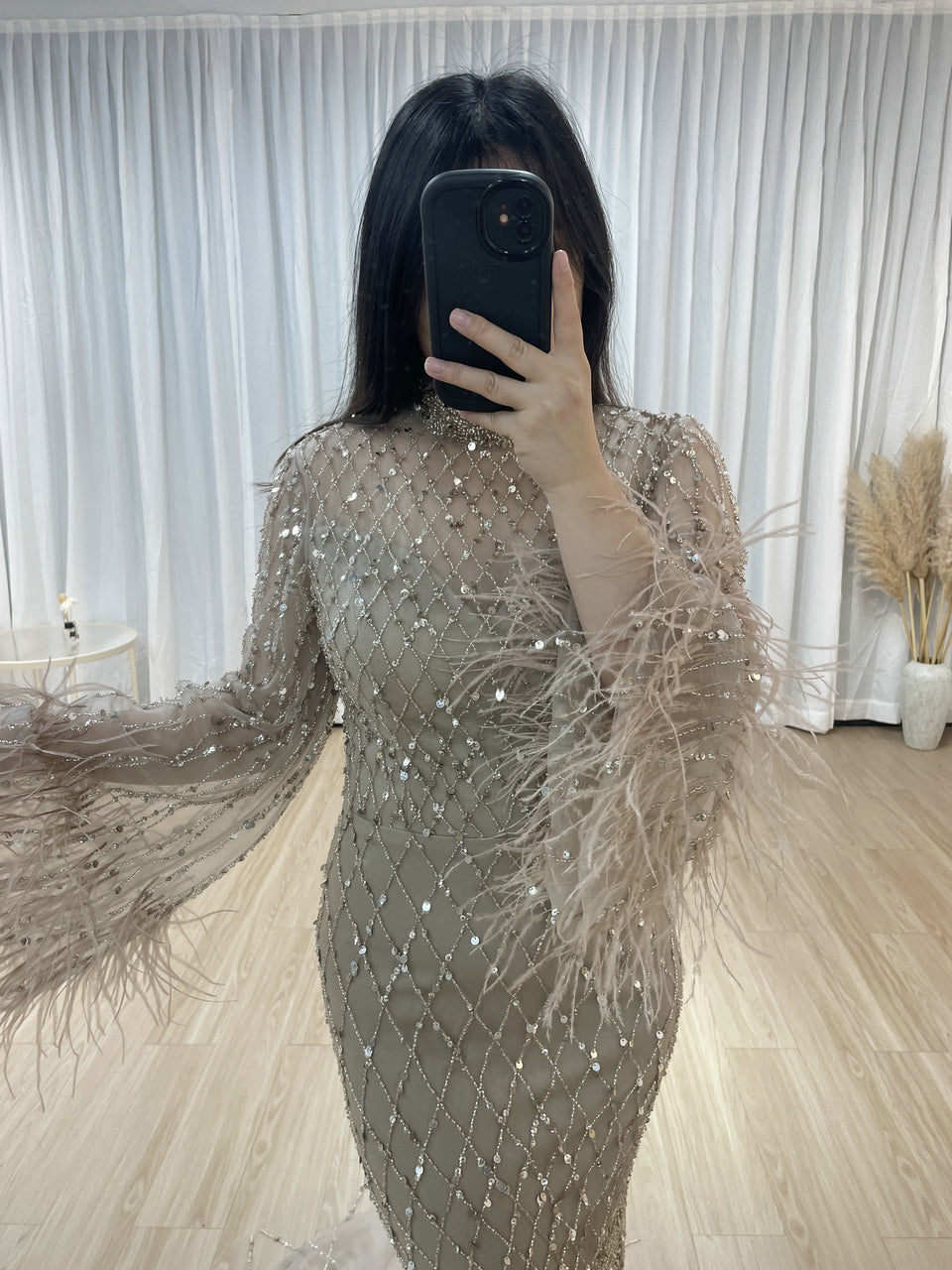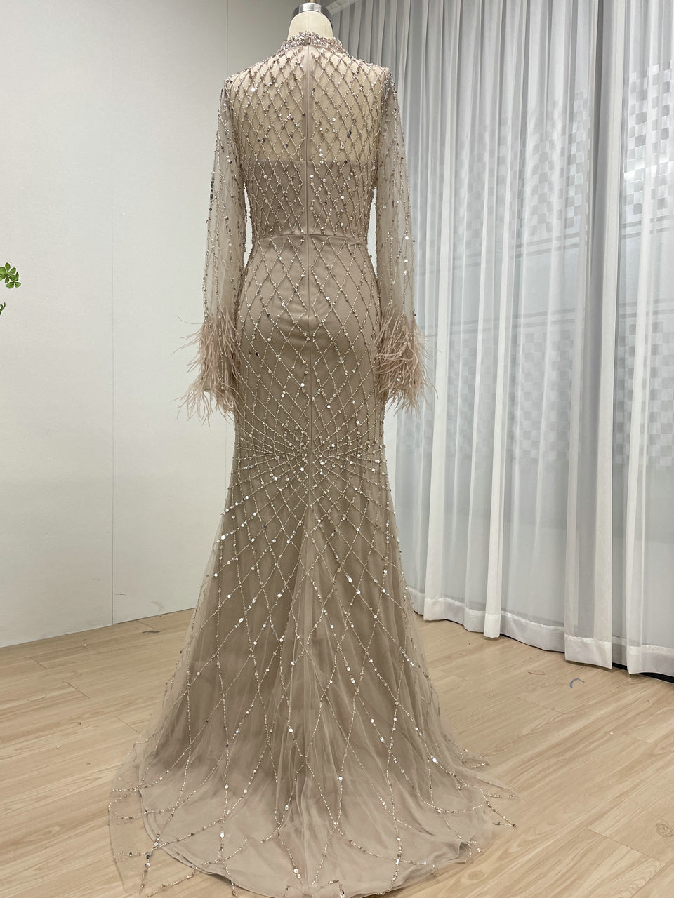 Luxurious Long Sleeve With Feathers Designer Evening Party Dress Handmade Haute Couture Evening Gown MB40294