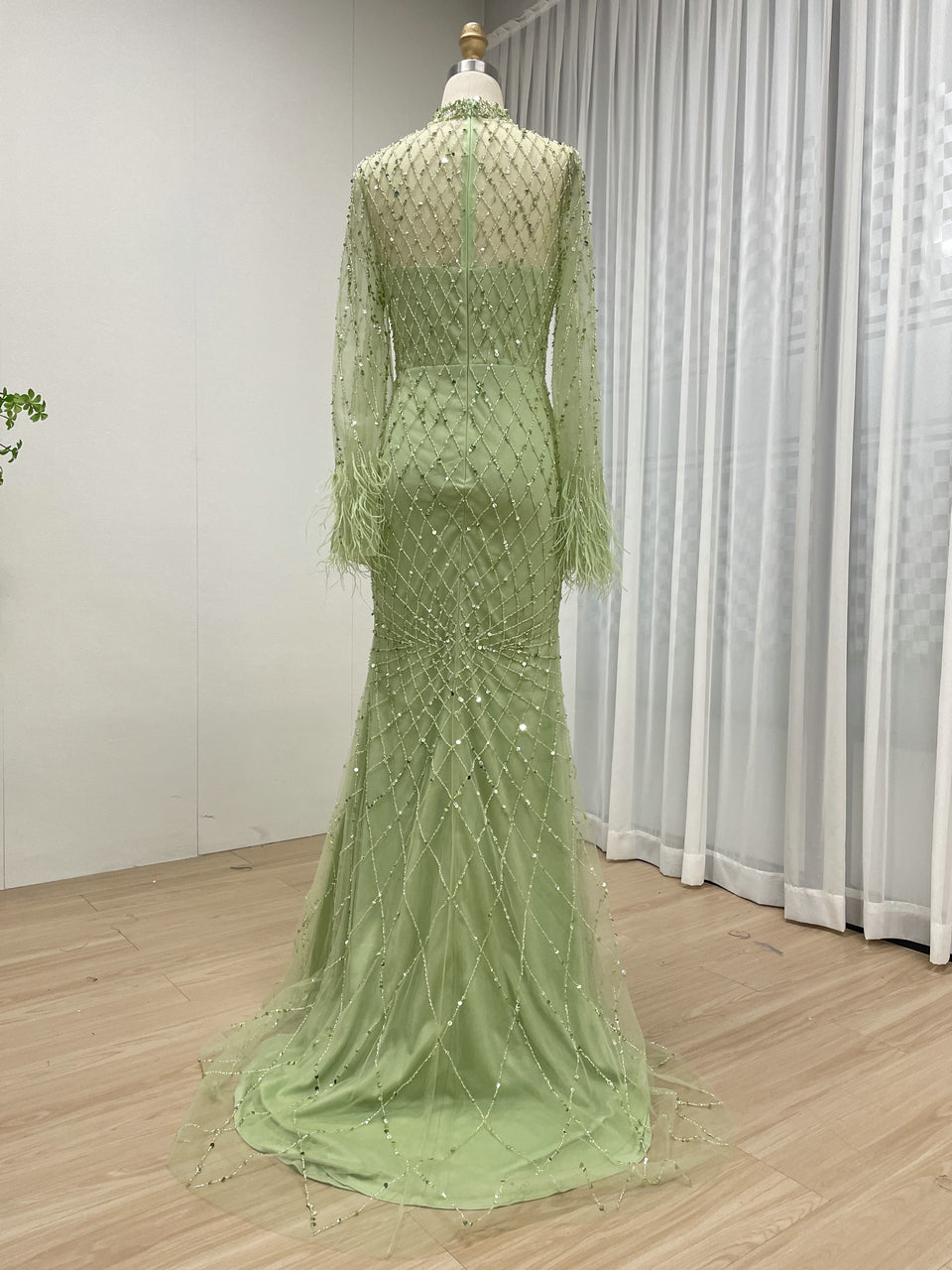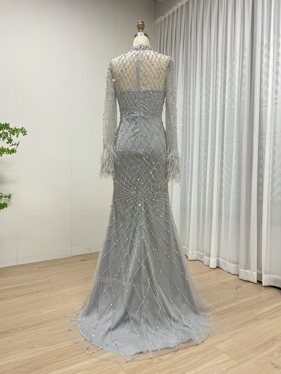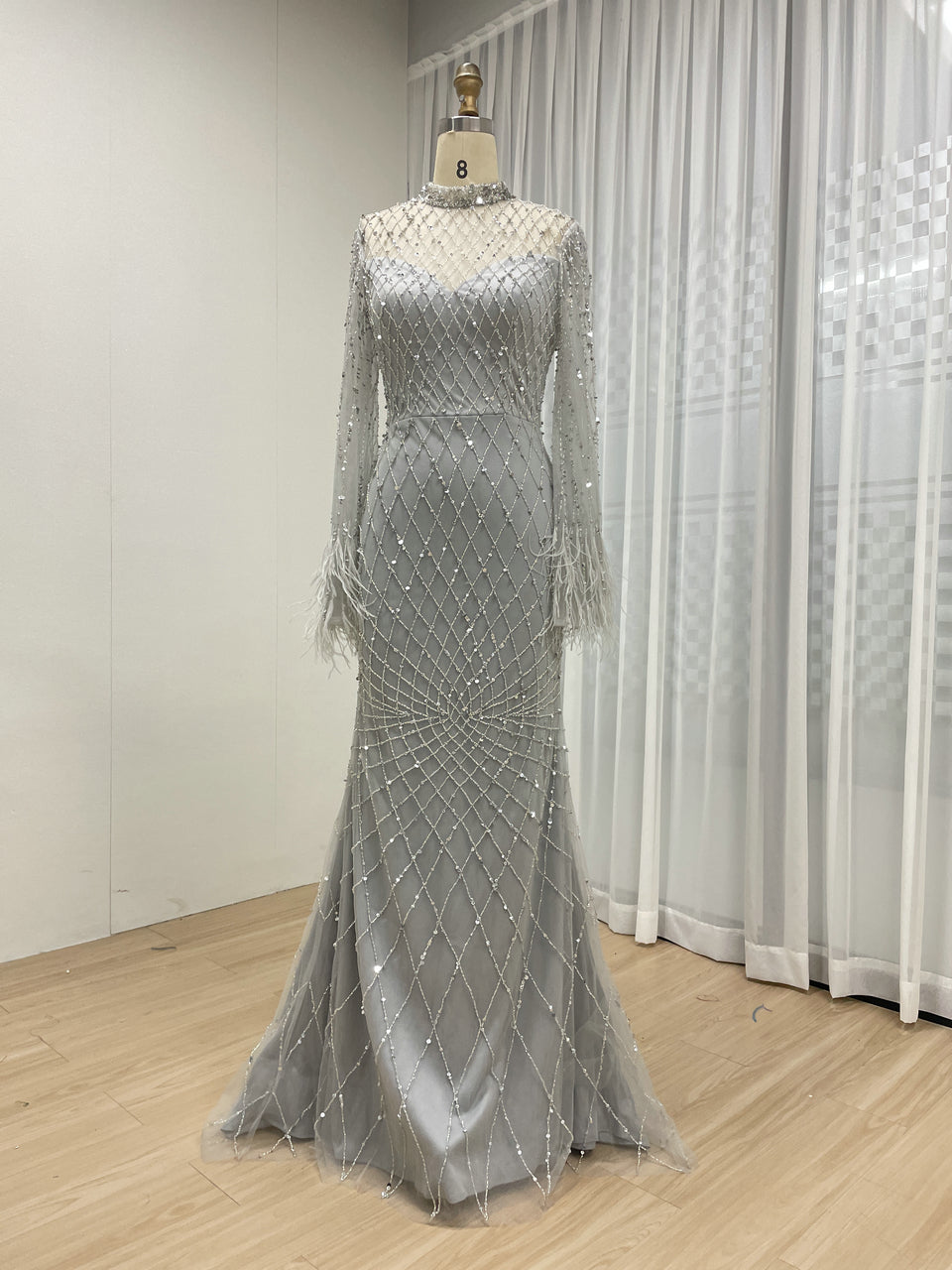 Luxurious Long Sleeve With Feathers Designer Evening Party Dress Handmade Haute Couture Evening Gown MB40294