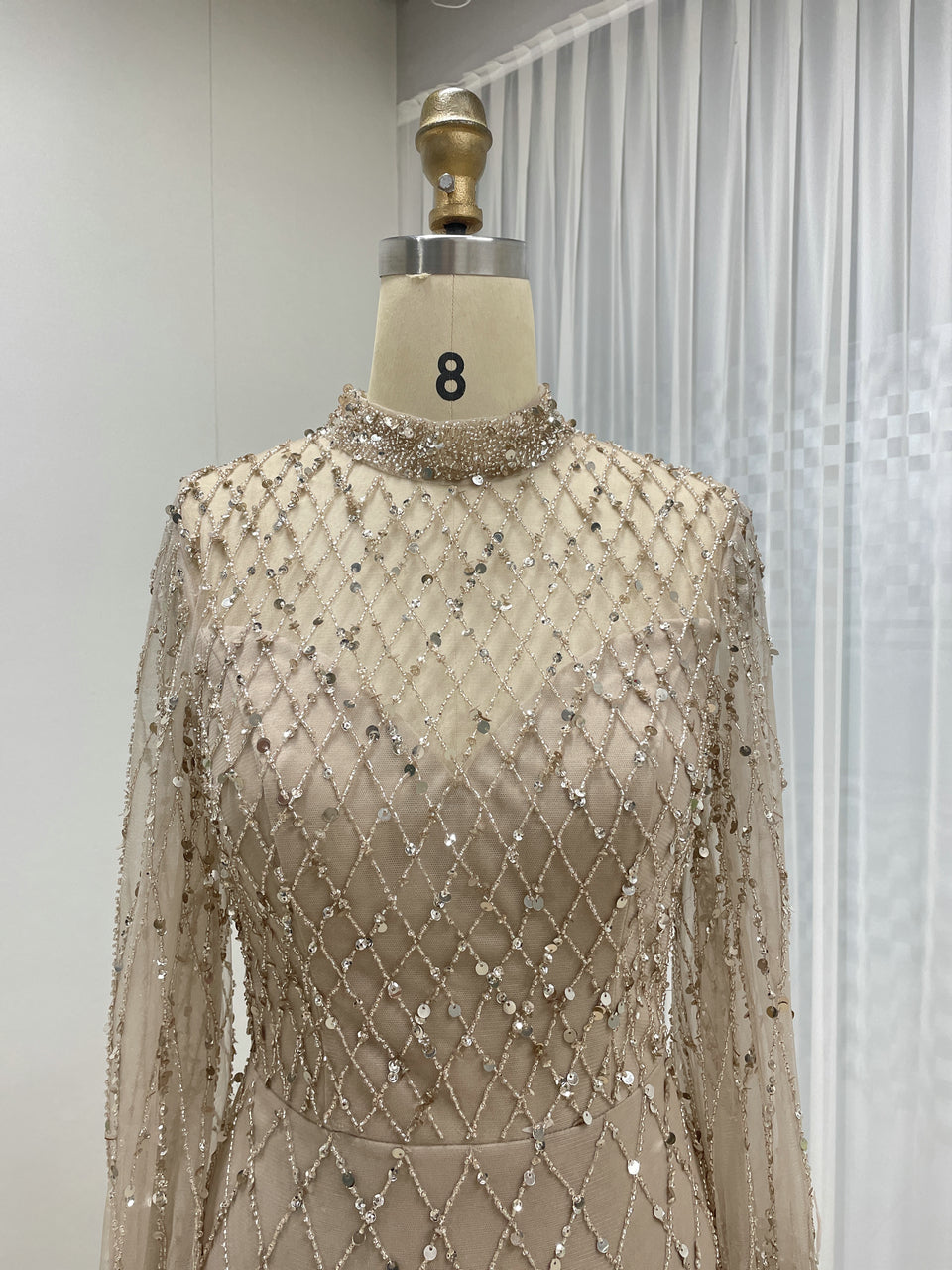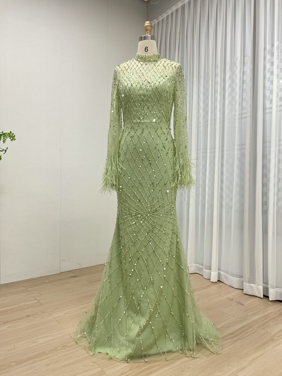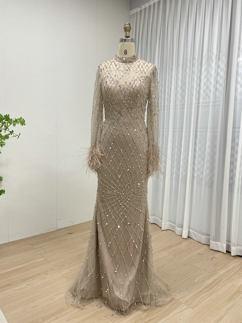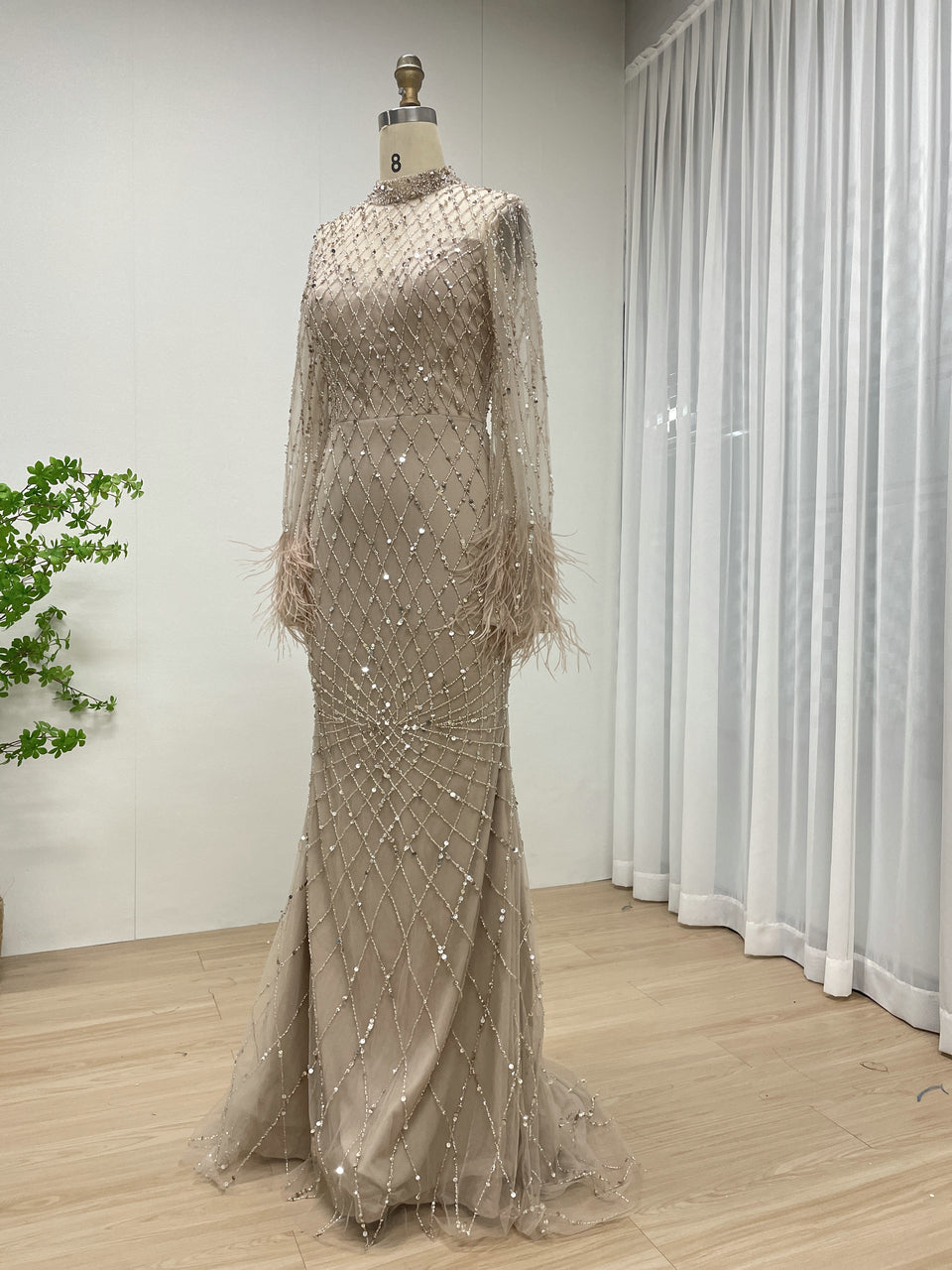 Luxurious Long Sleeve With Feathers Designer Evening Party Dress Handmade Haute Couture Evening Gown MB40294