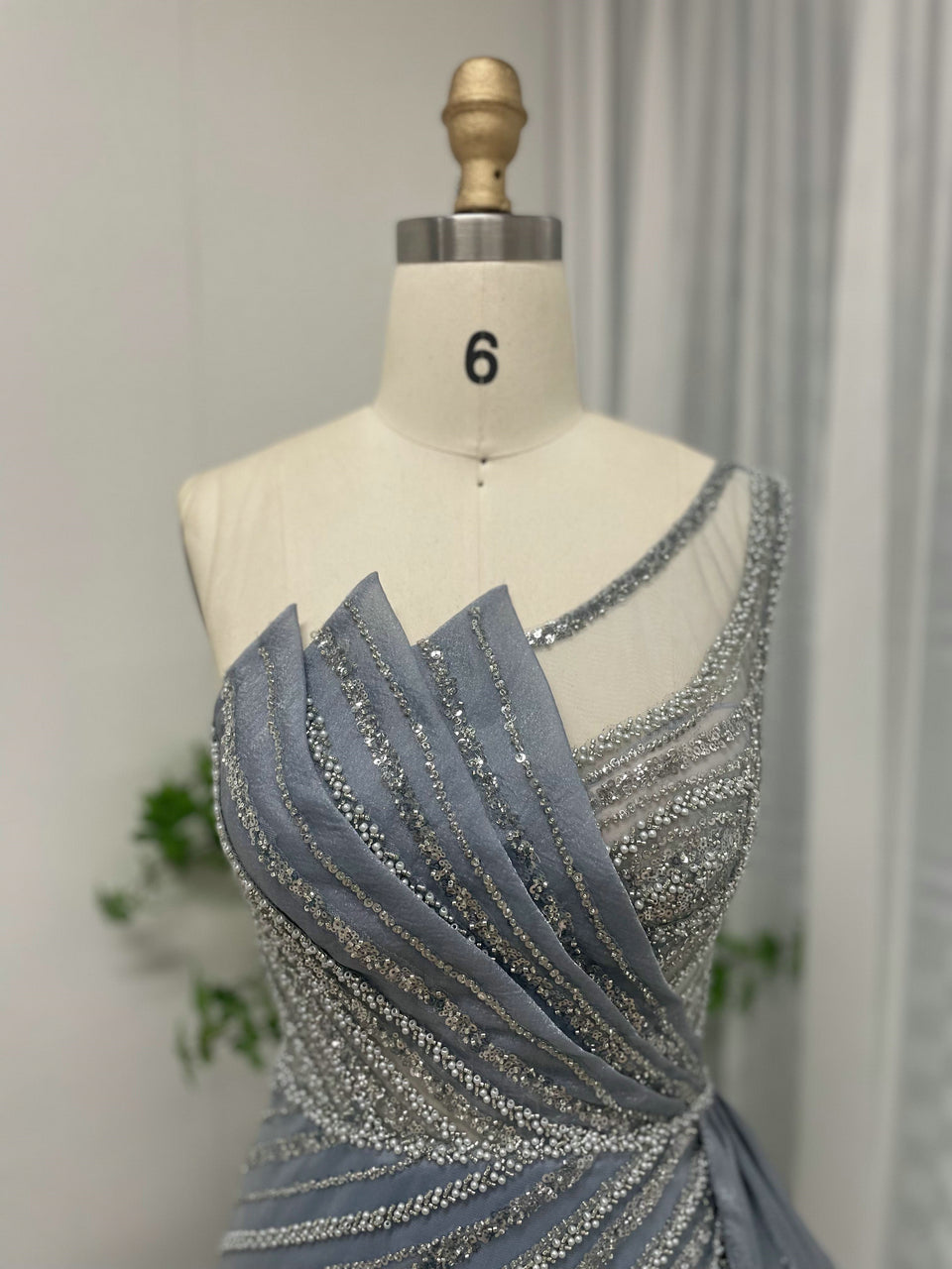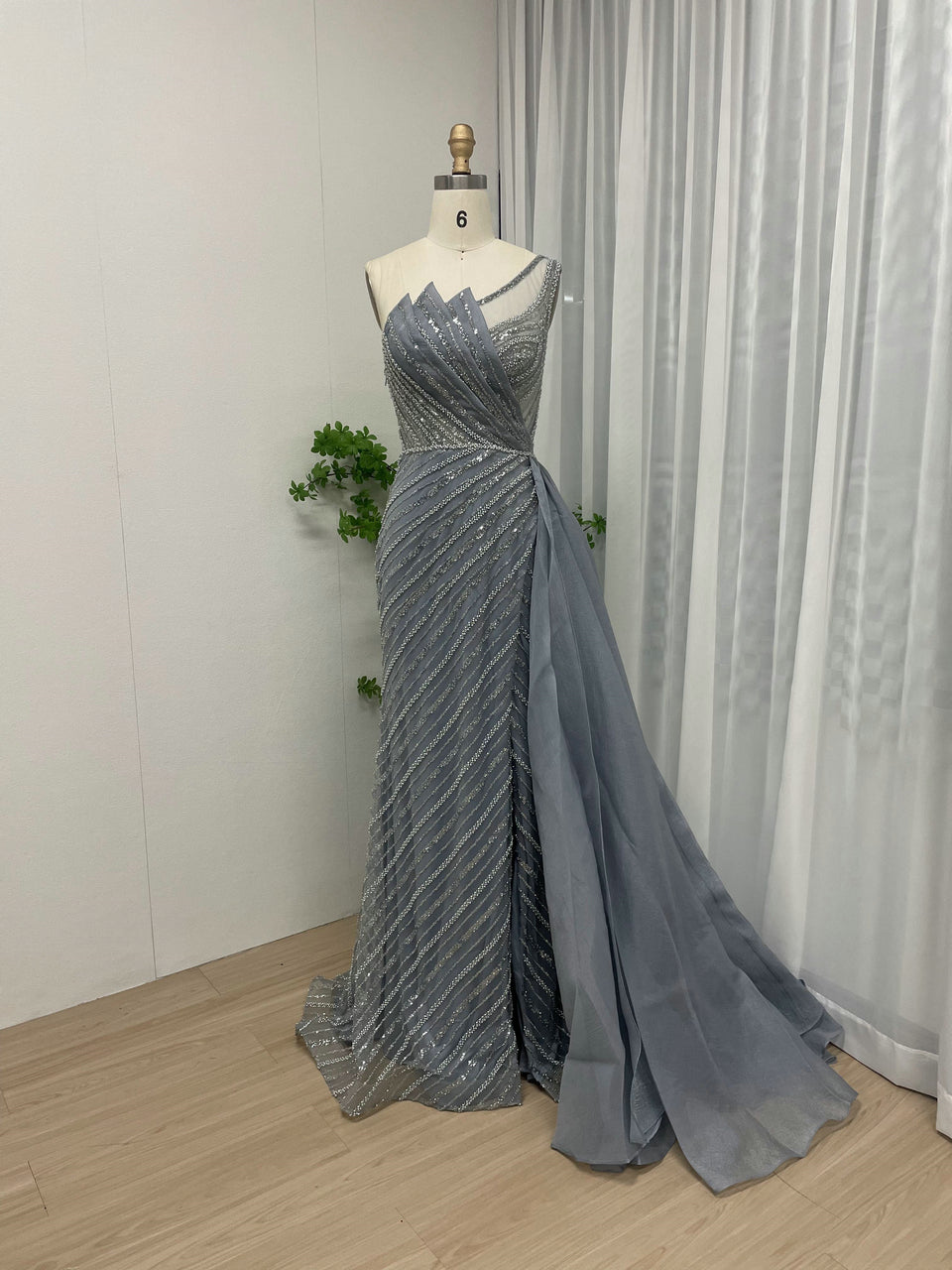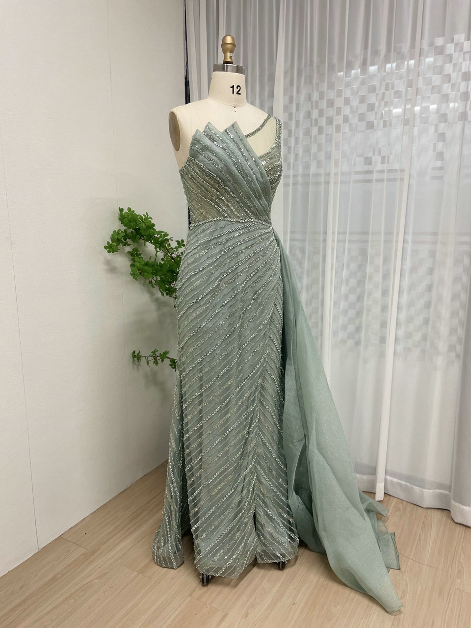 Luxurious One Shoulder Asymmetrical Mermaid Evening Gown Intricate Beading Lace Party Dress MB40185