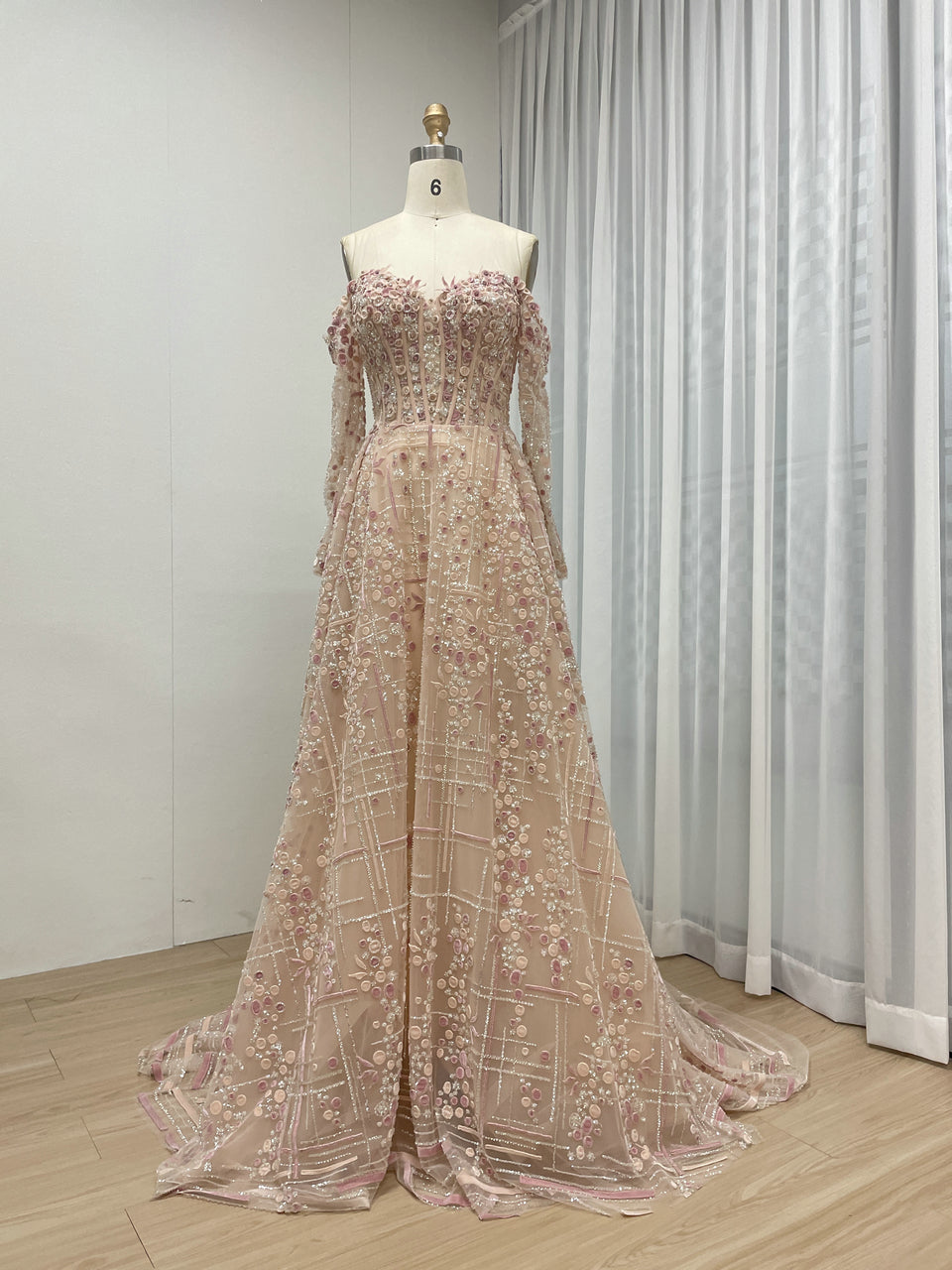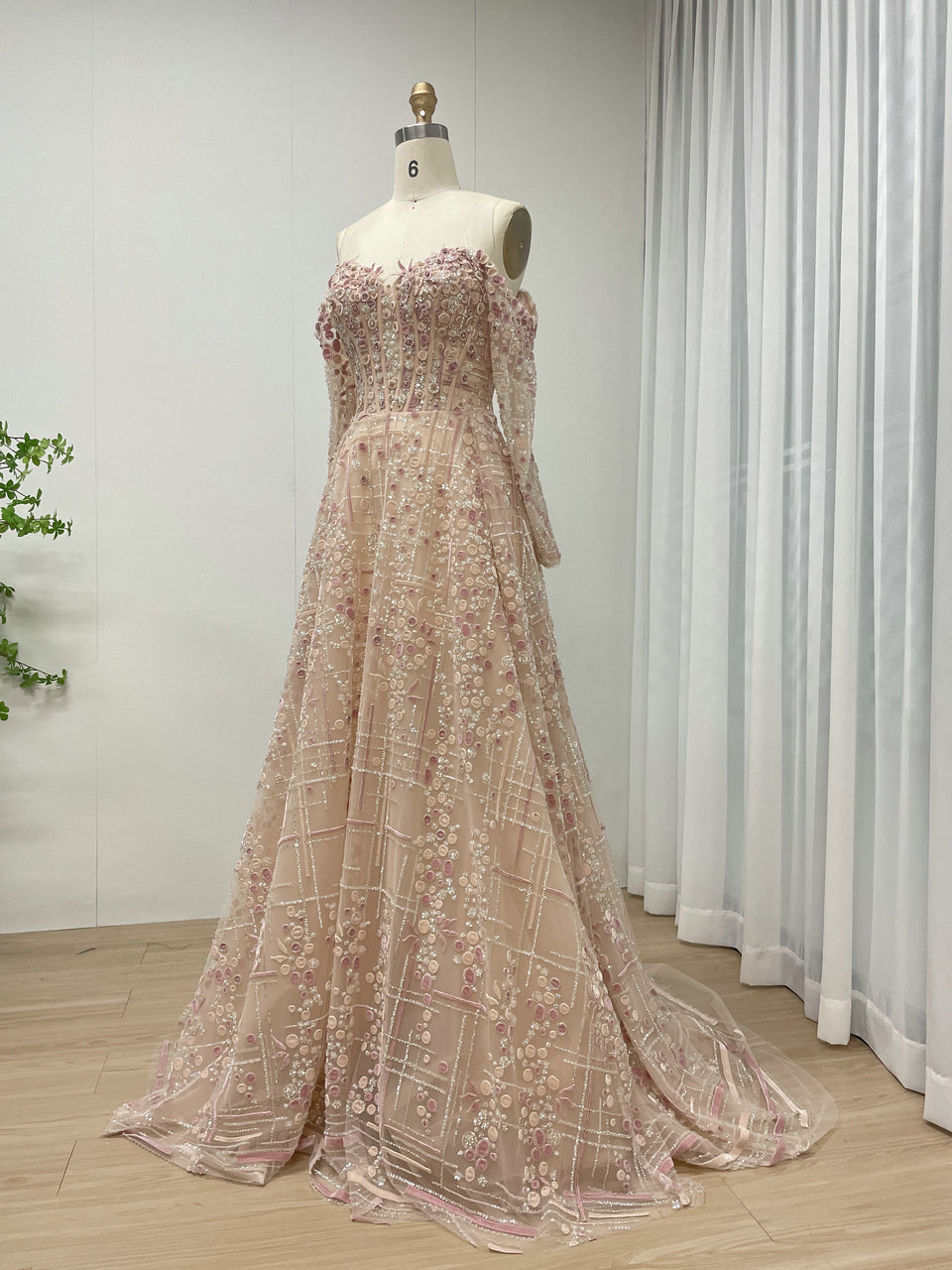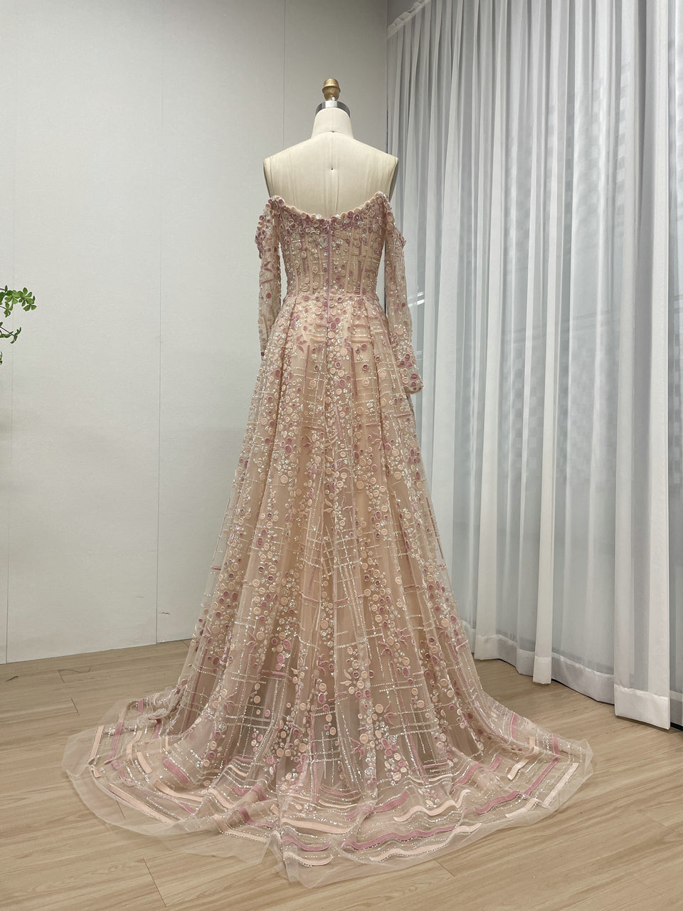 Luxury A-Line Floral Maxi Dress Pink Flowers Decoration Off Shoulder Sweetheart Neckline Party Evening Dress MB40305