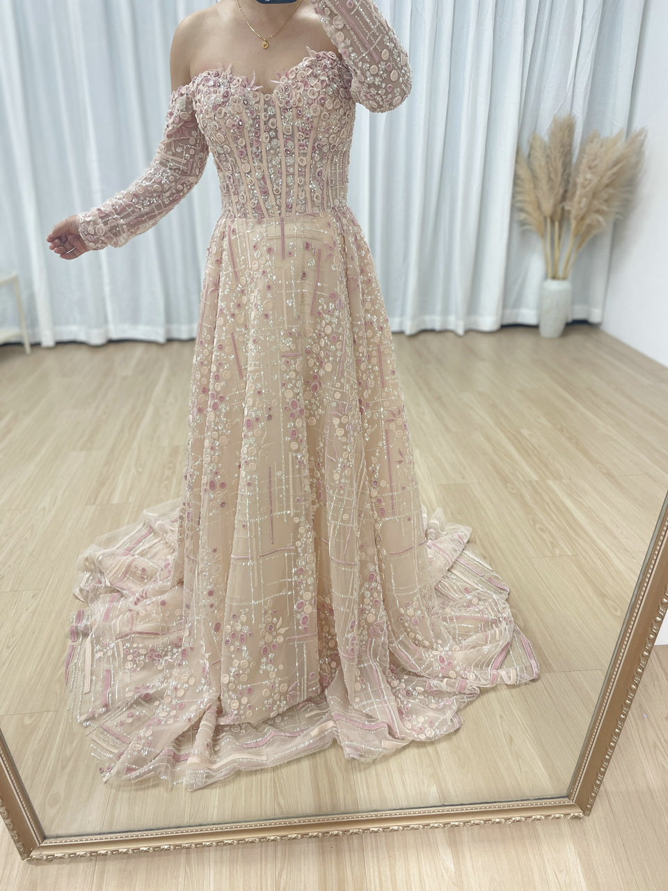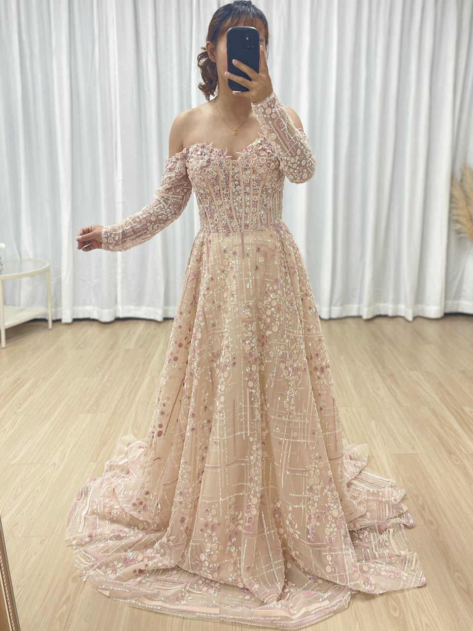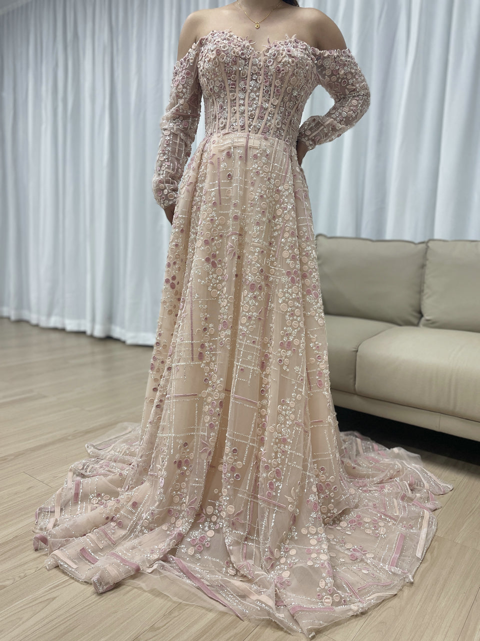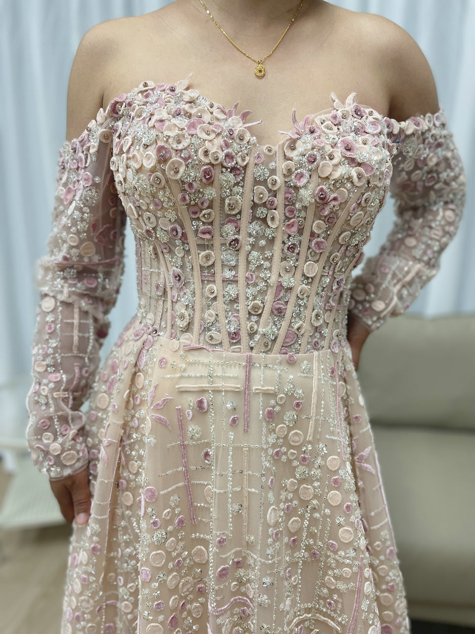 Luxury A-Line Floral Maxi Dress Pink Flowers Decoration Off Shoulder Sweetheart Neckline Party Evening Dress MB40305