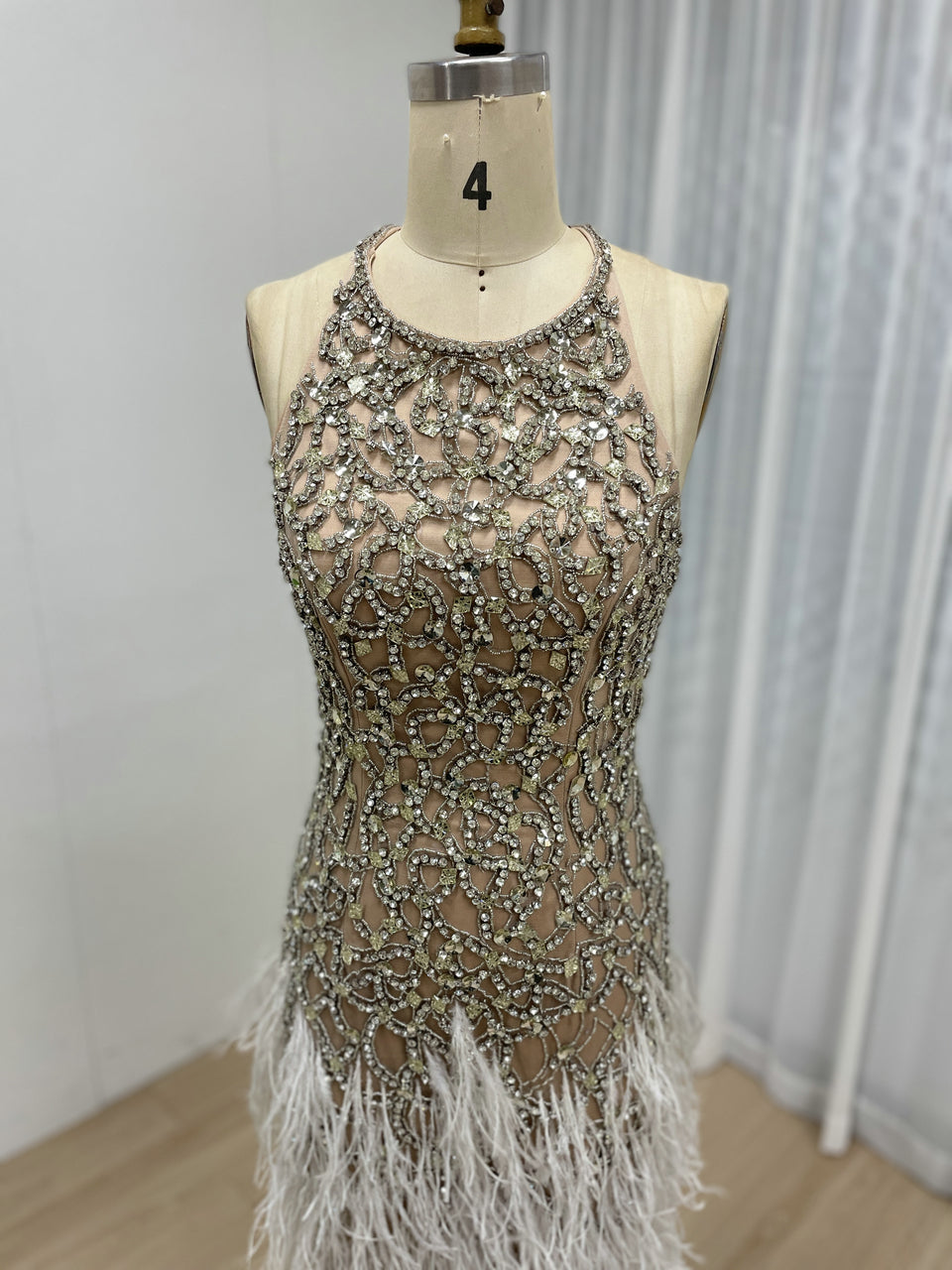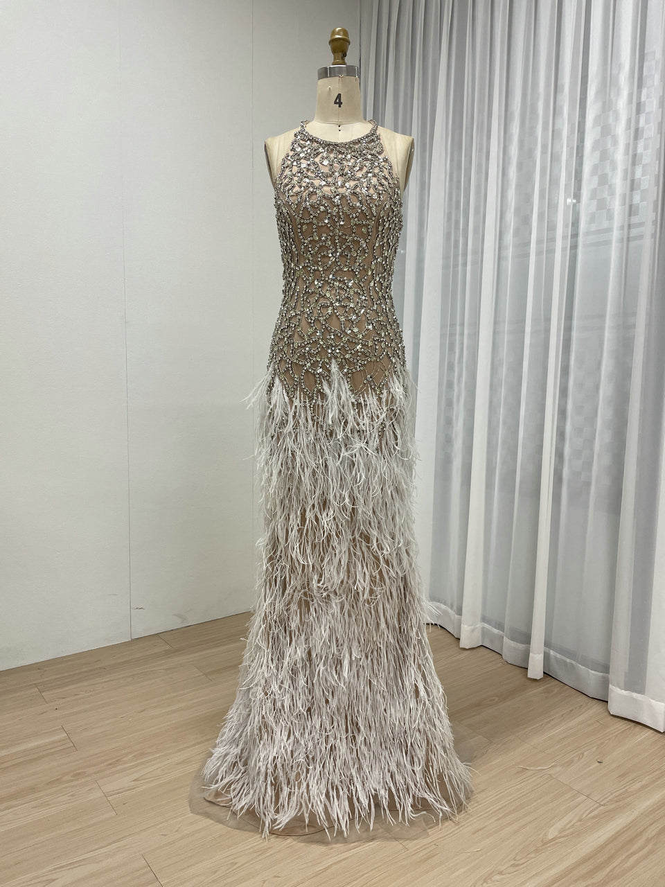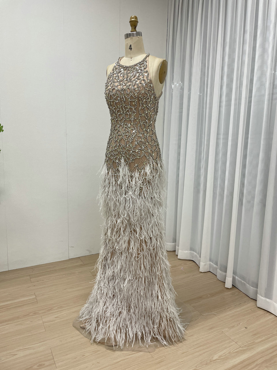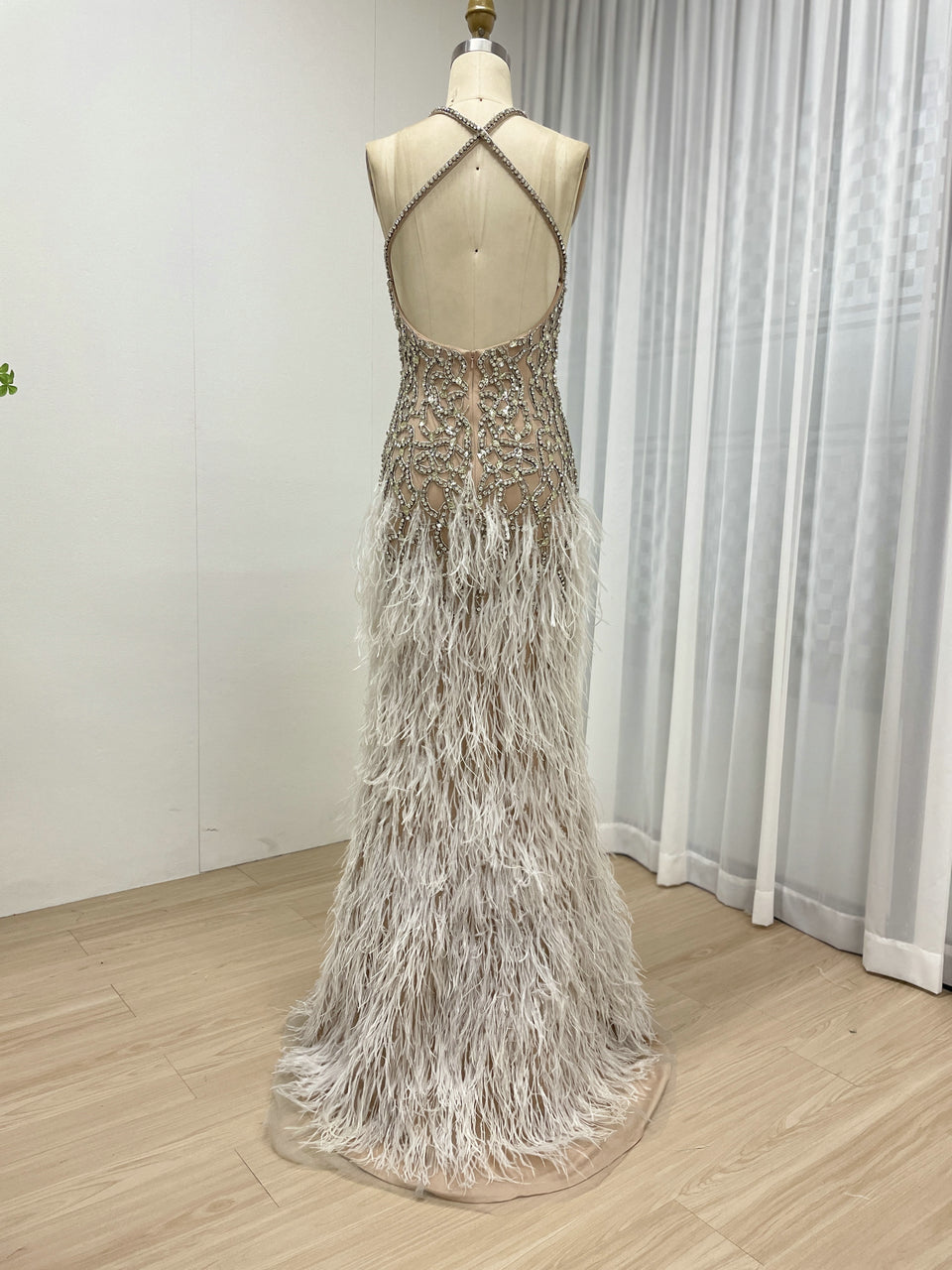 Luxury Bead Diamond Sexy Sleeveless Backless Feather Bottom Embellished Prom Evening Gown MB40416