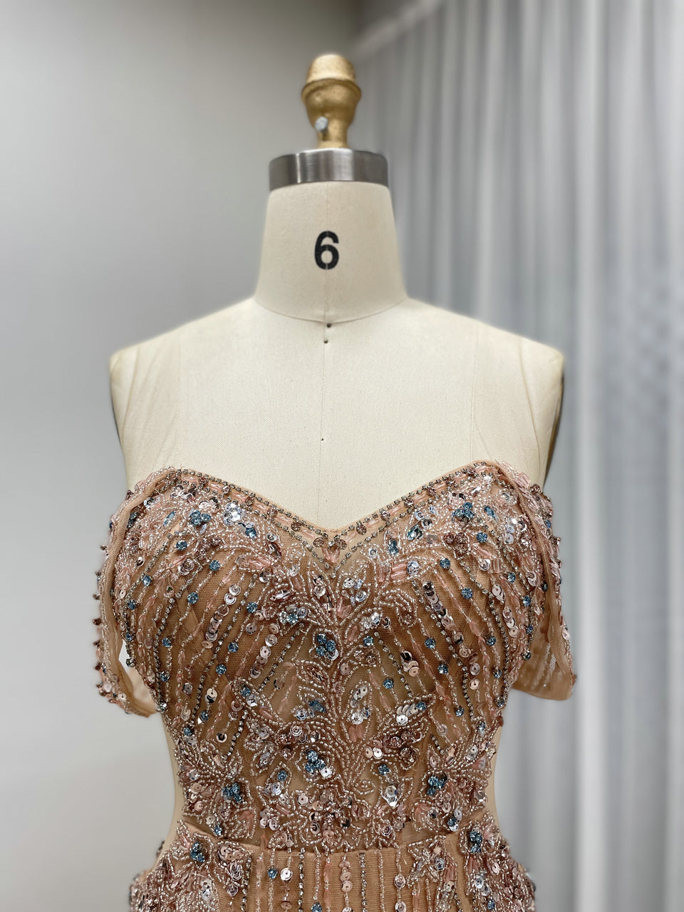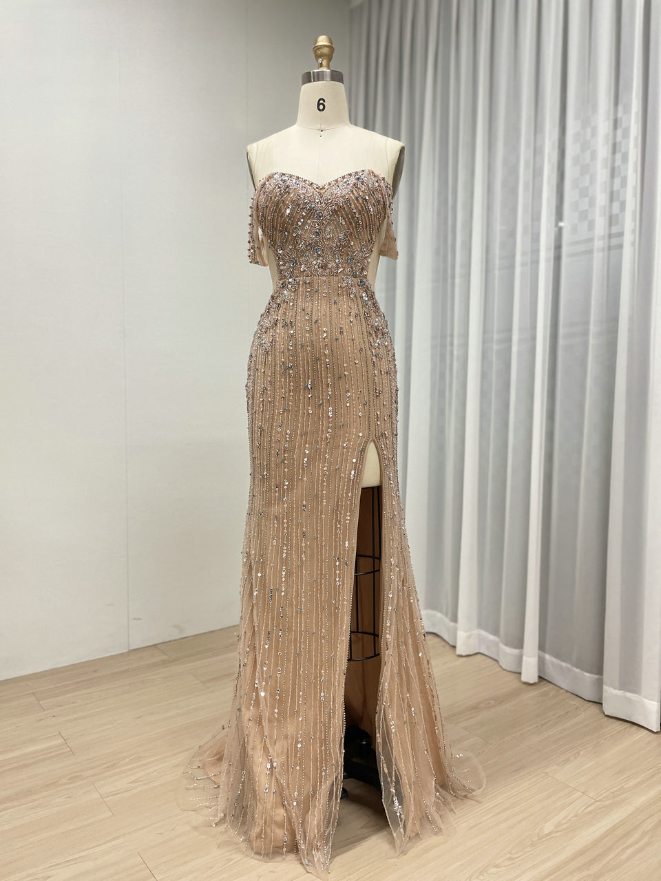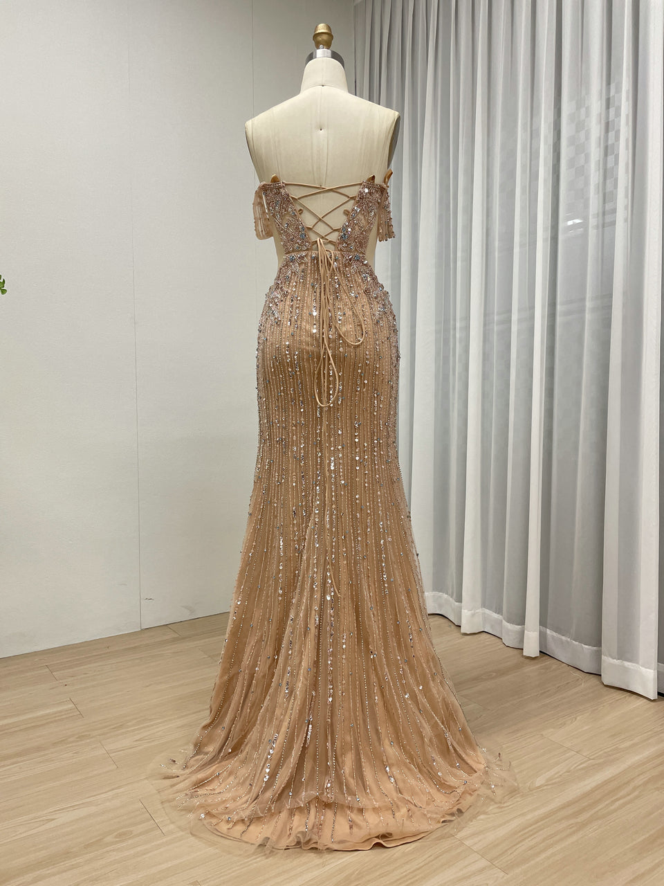 Exquisite Champagne Prom Dress with Pearl Embellishments Off-Shoulder Style MB40399