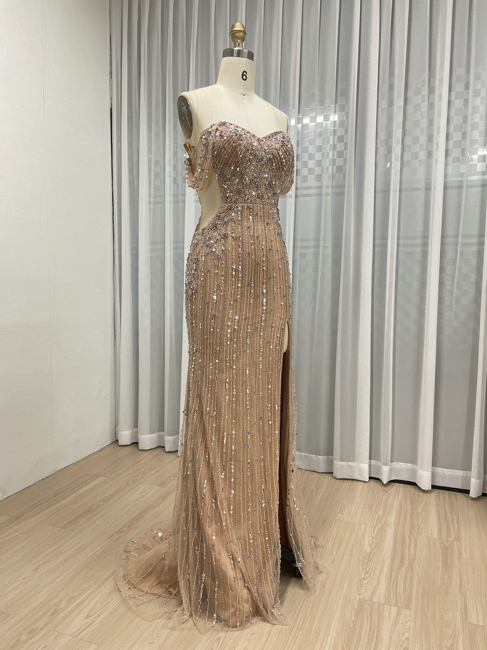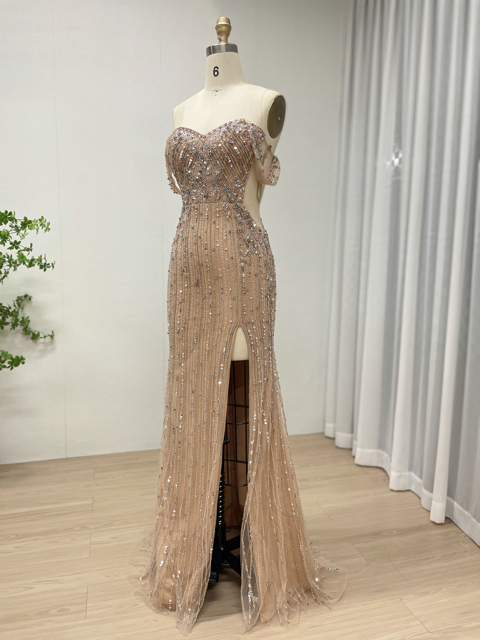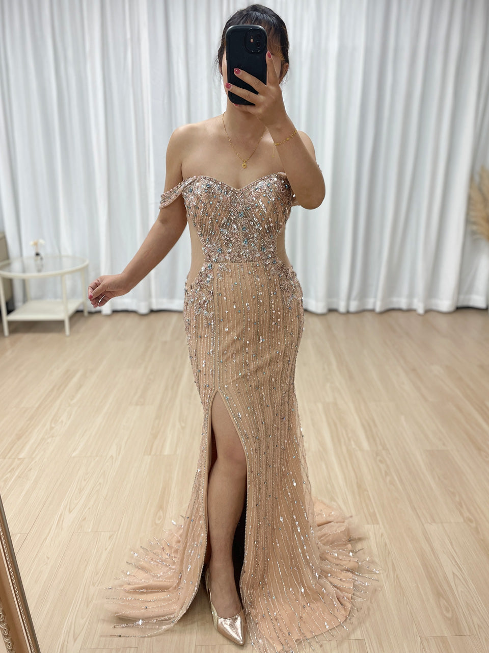 Exquisite Champagne Prom Dress with Pearl Embellishments Off-Shoulder Style MB40399