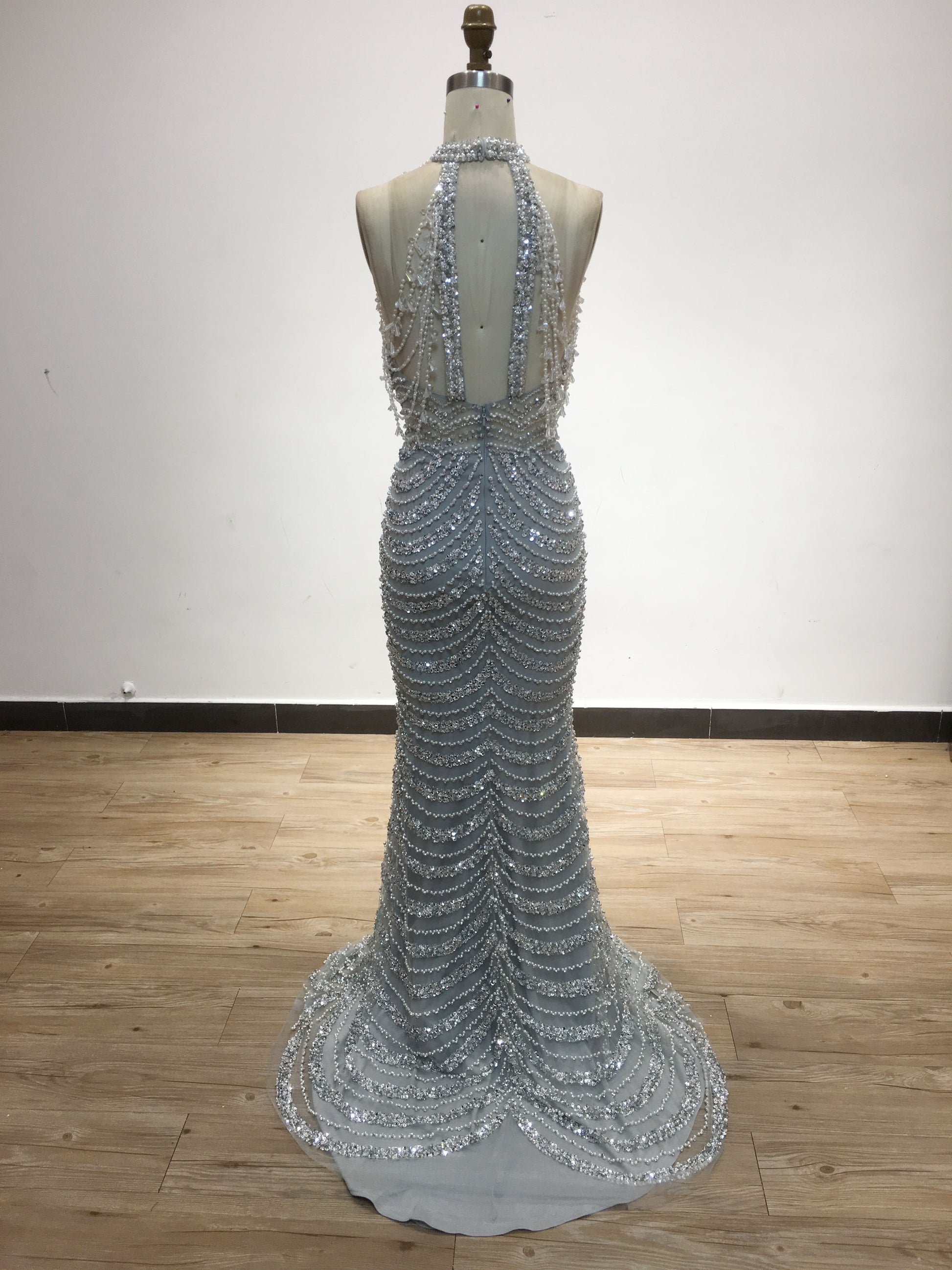 Luxury Halter Neck Handmade Beading Silver Engagement Evening Dress DUA001