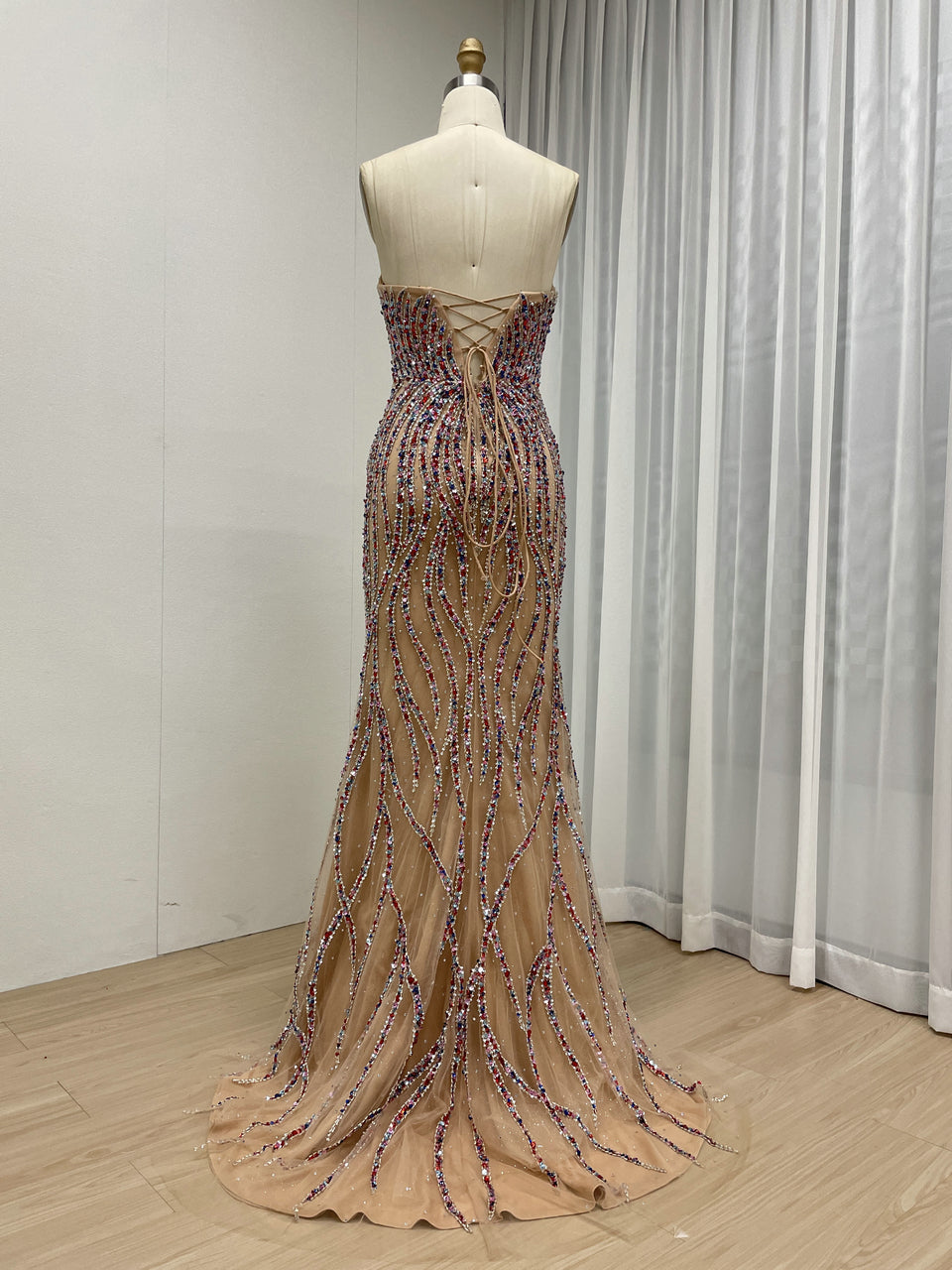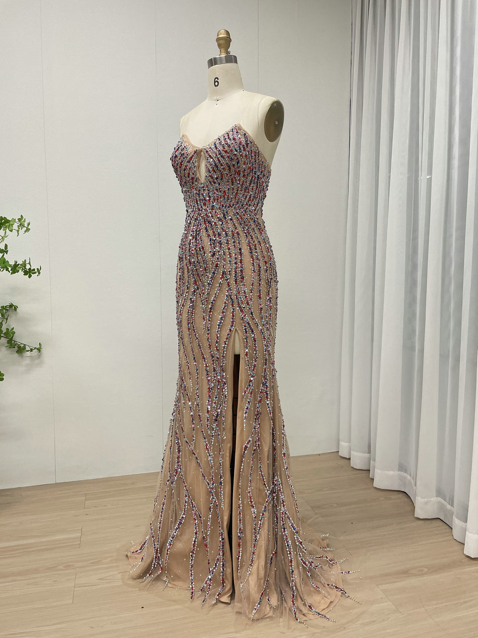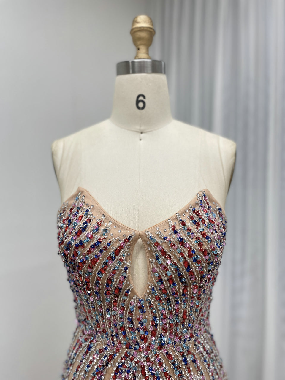 Luxury Multicolor Evening Wear with Beaded Bodice Slit Design Long Train MB40414