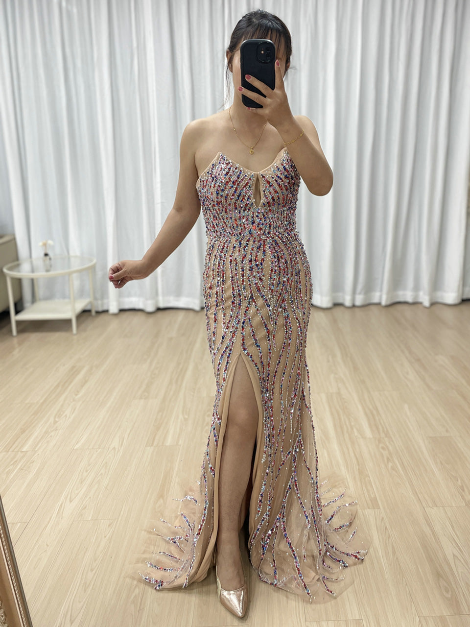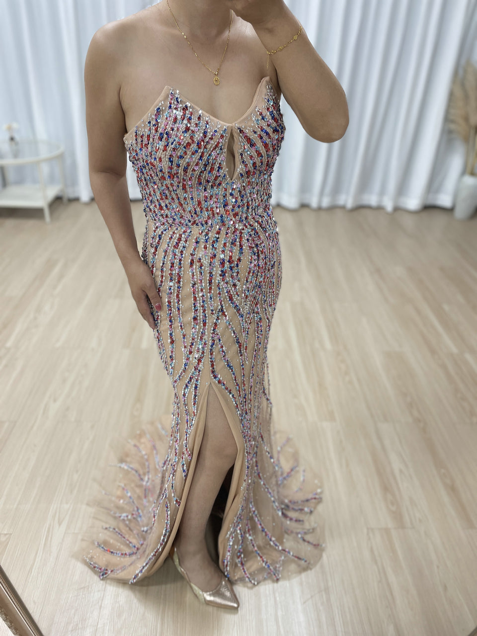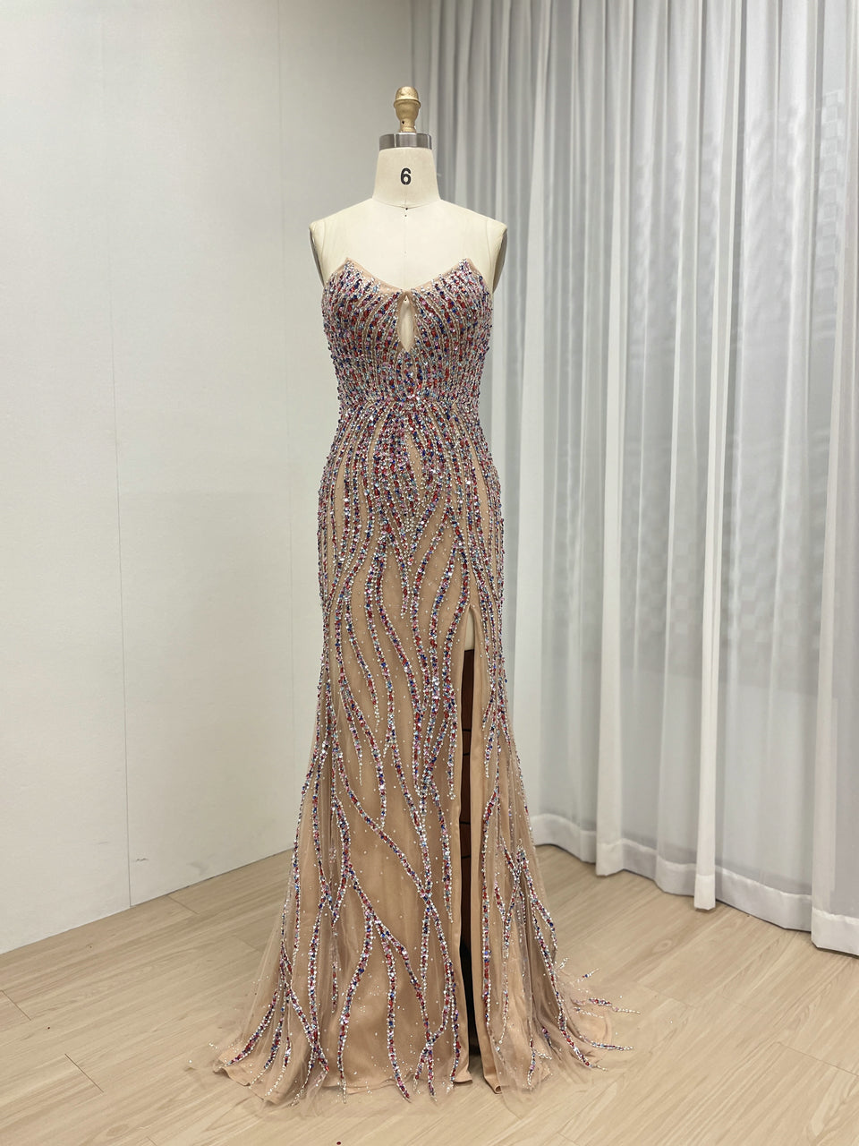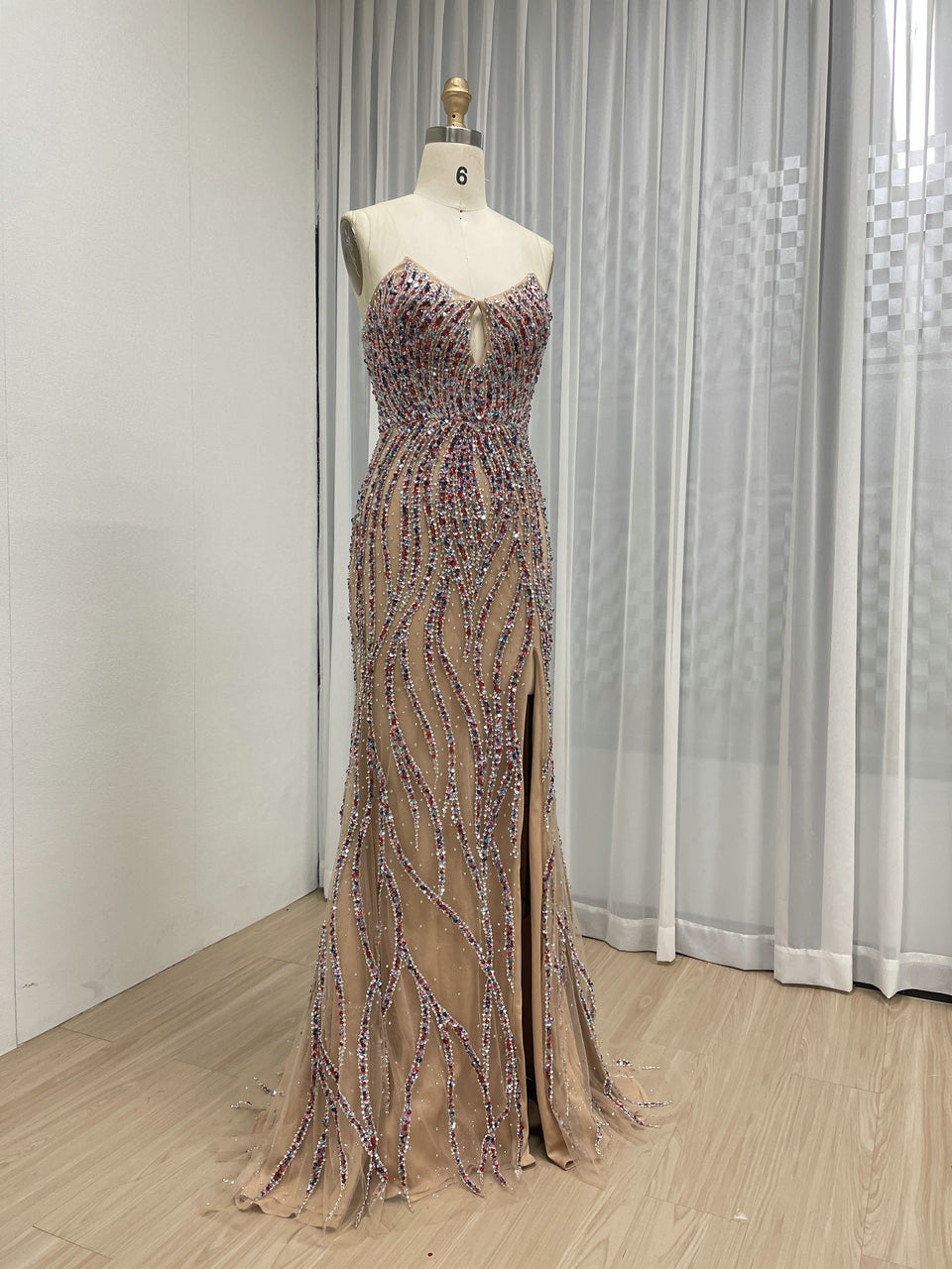 Luxury Multicolor Evening Wear with Beaded Bodice Slit Design Long Train MB40414