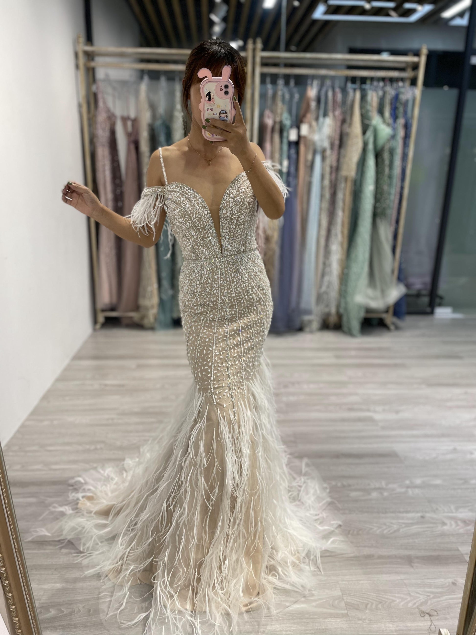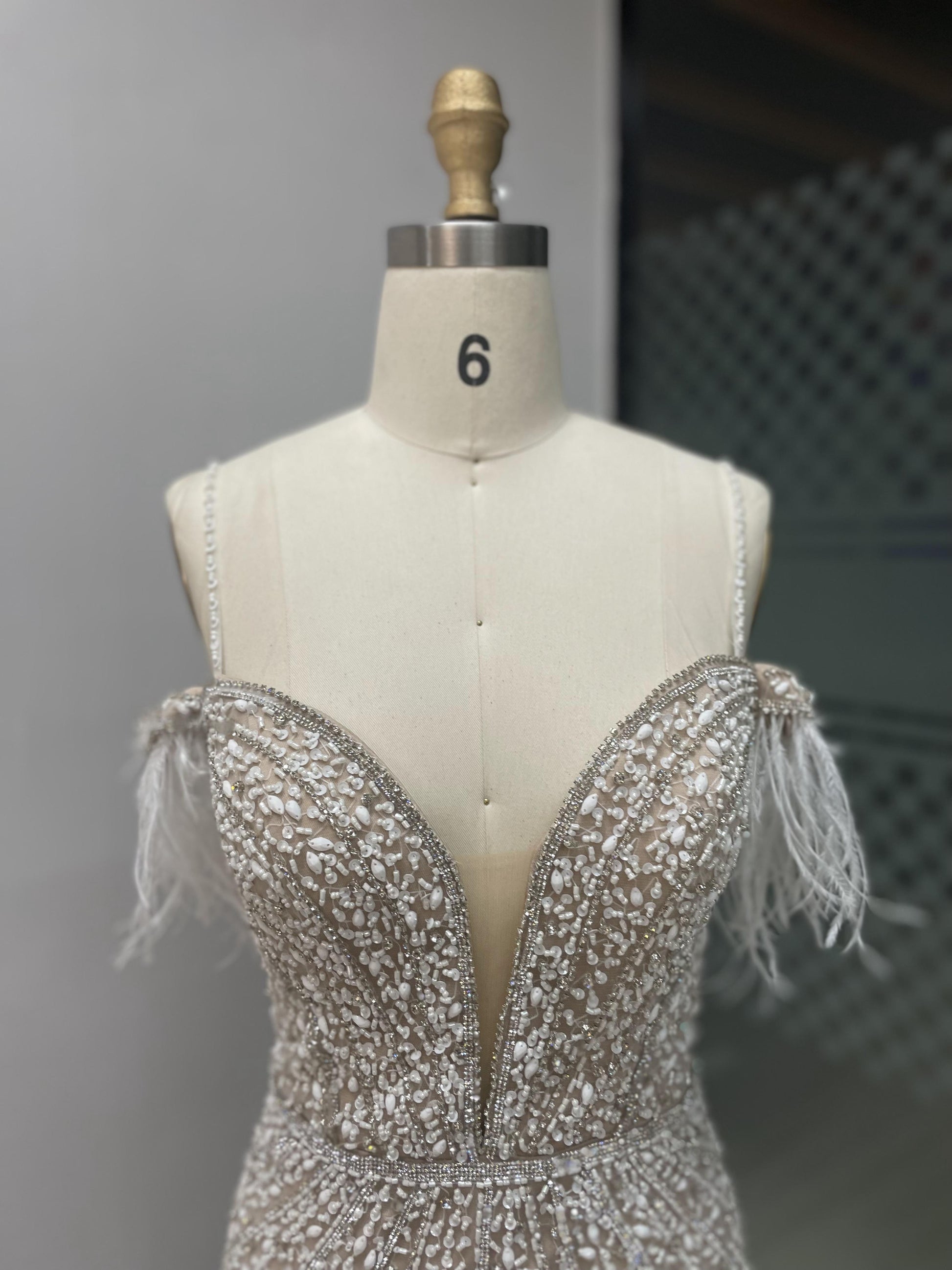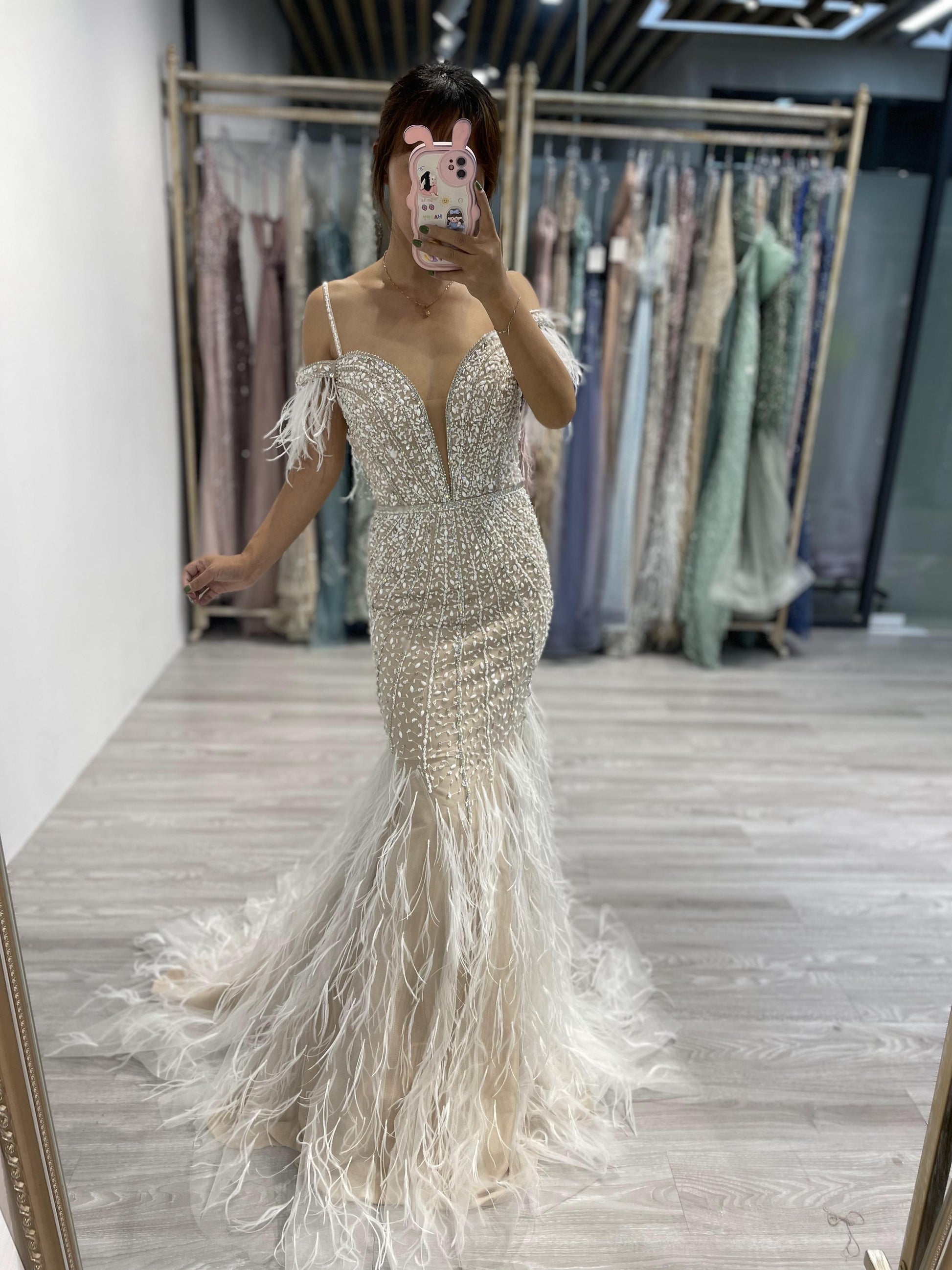 Luxury Off Shoulder Beading Feather Mermaid Evening Dress MB20021