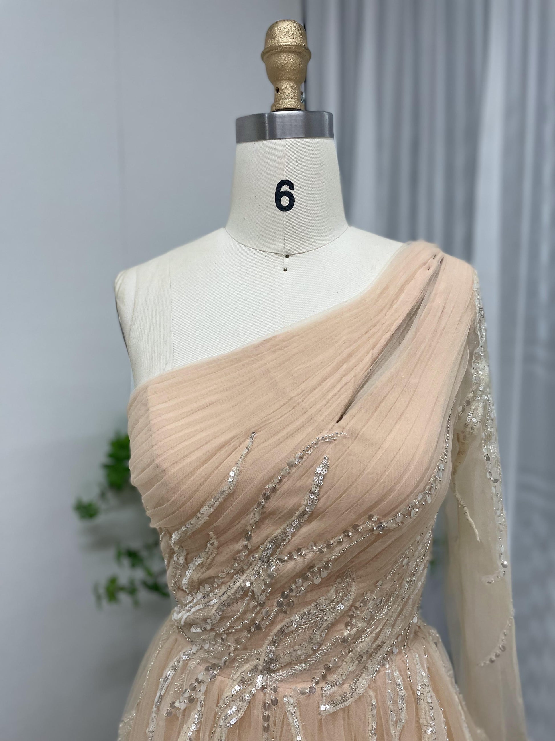 Luxury One Shoulder Ruffle Beading A Line Long Sleeve Evening Dress MB40196