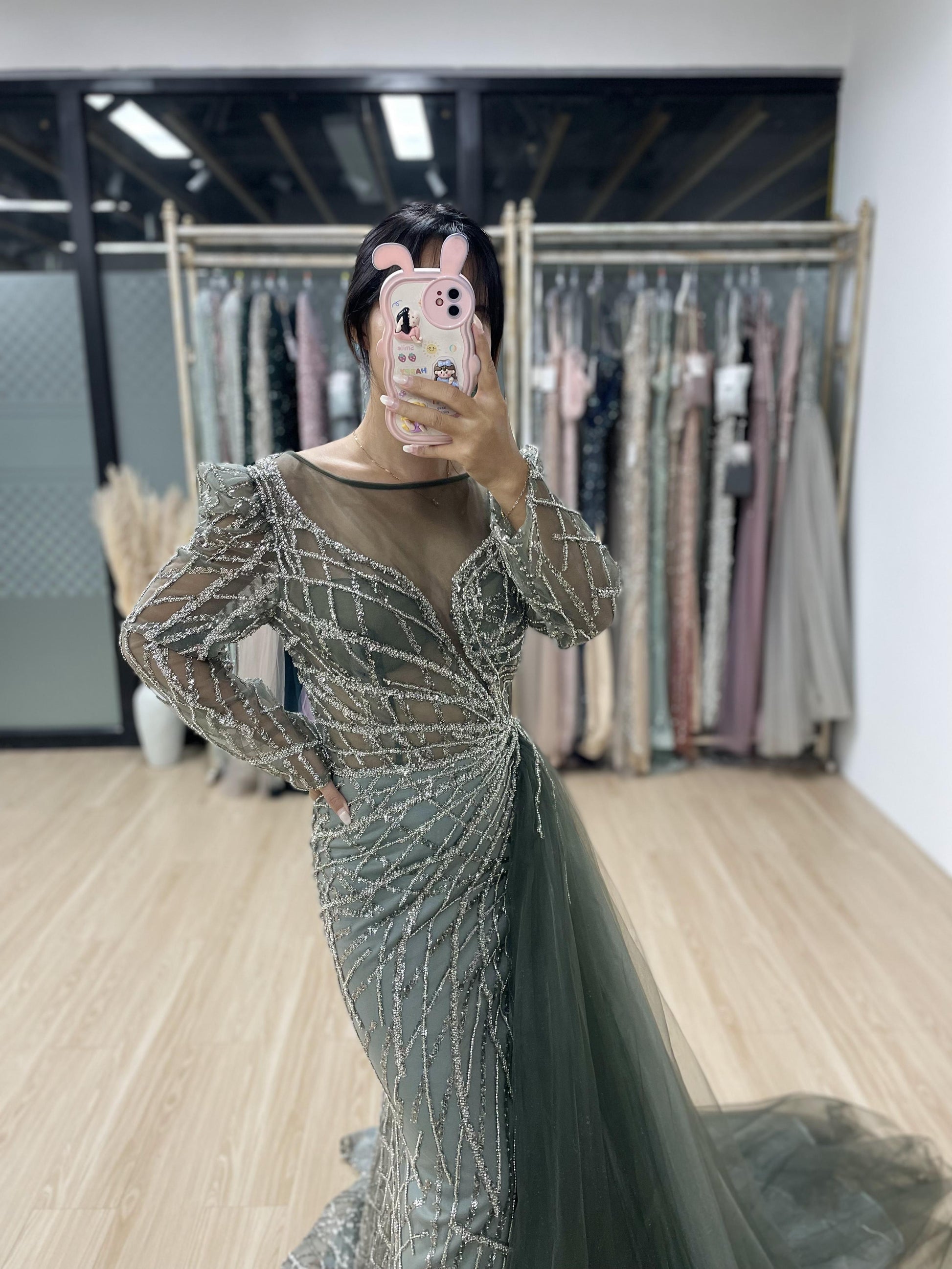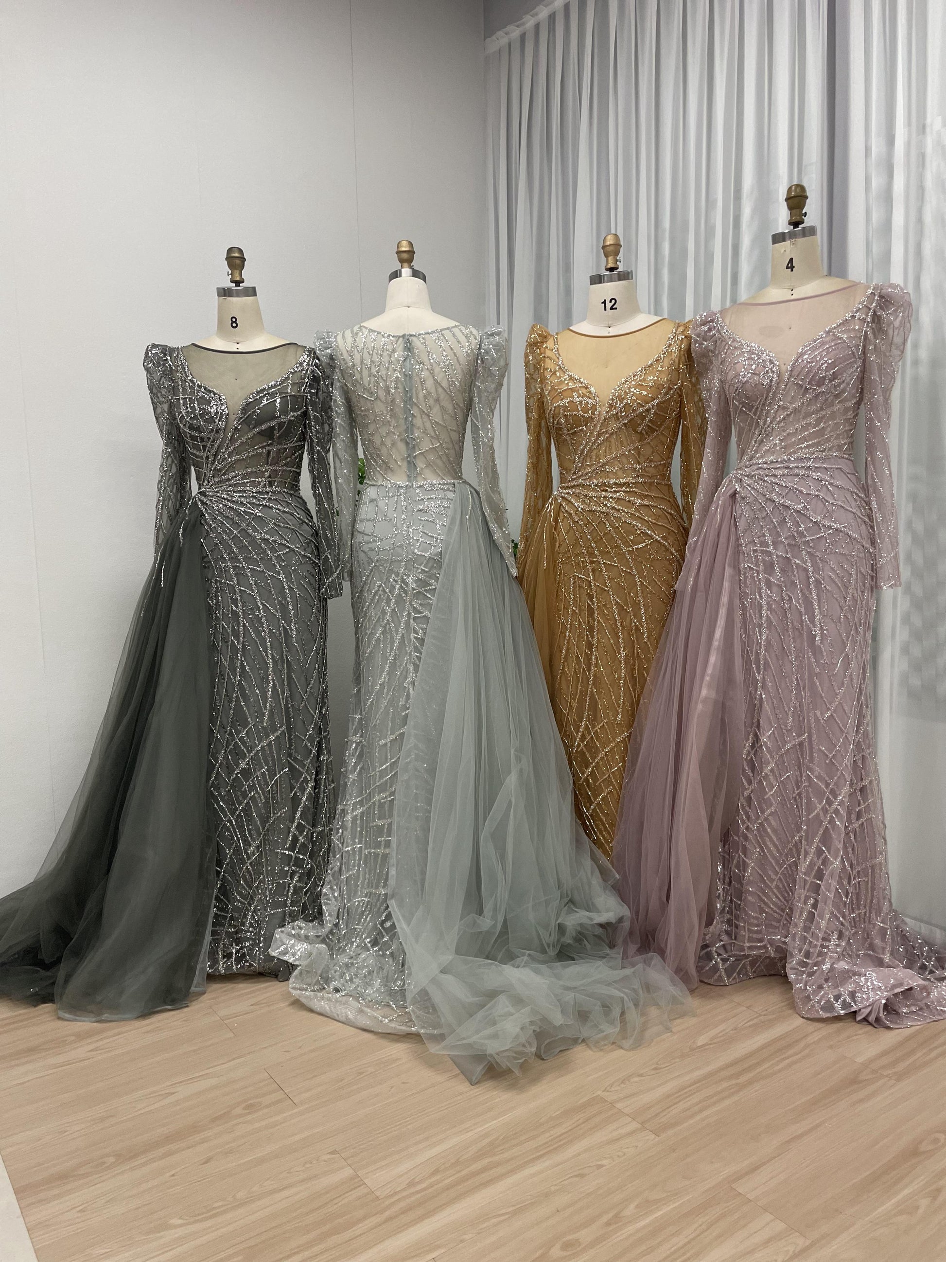 Luxury Puffy Long Sleeve Beading Lace Evening Dress With Side Skirt MB40123