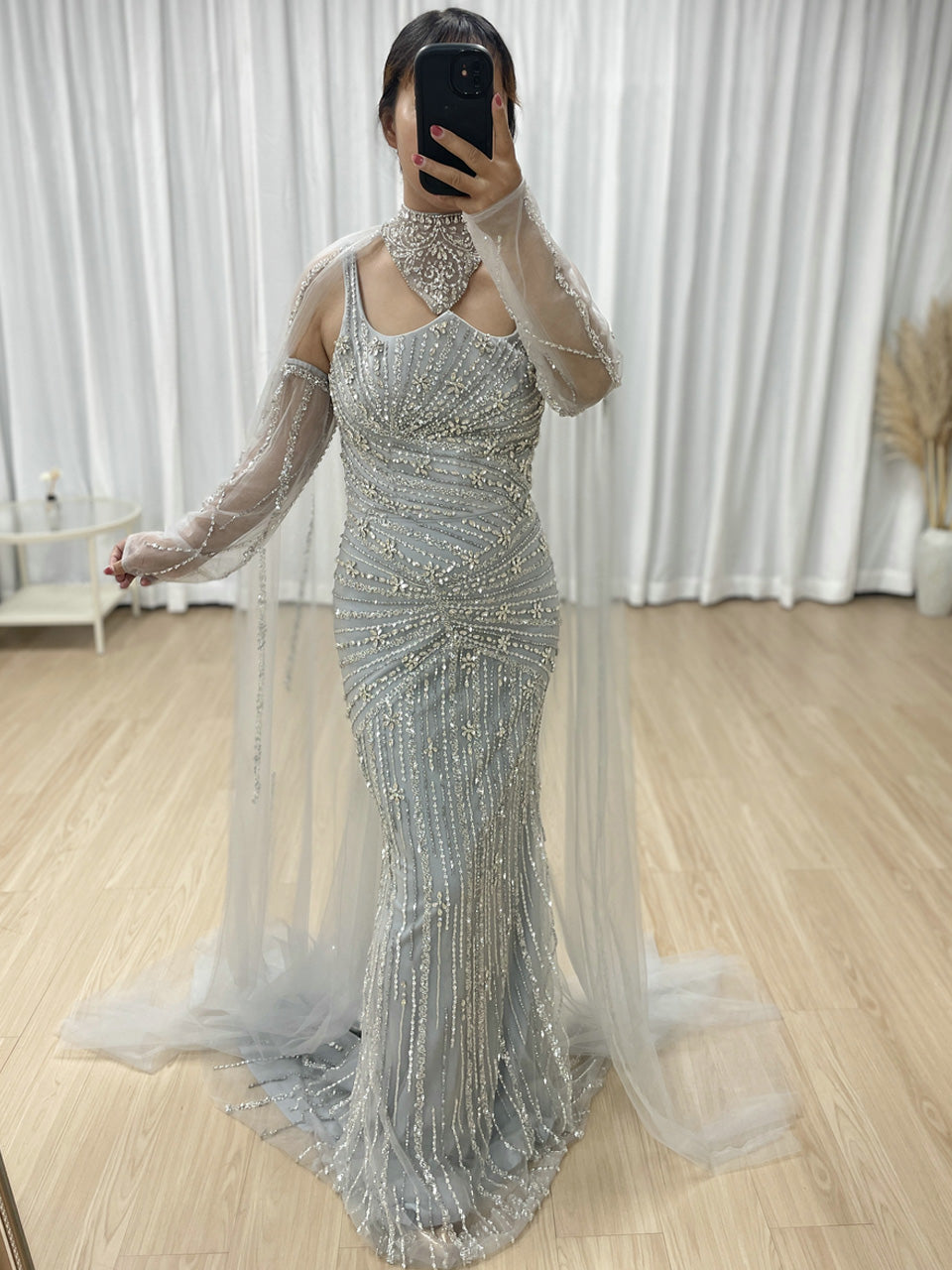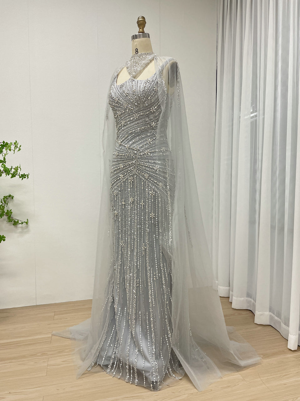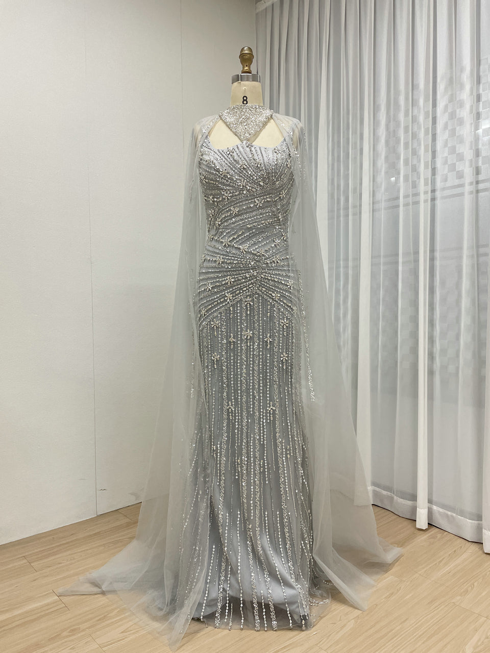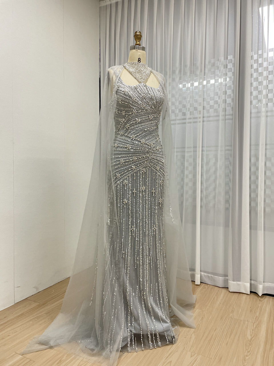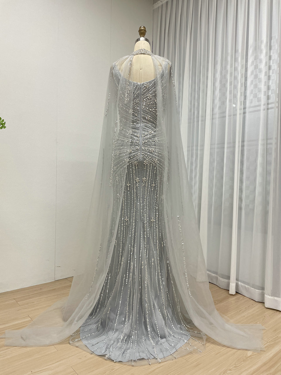 Luxury Silver Gowns for Women With Cape Sleeve Handmade Beading Long Mermaid Wedding Dress MB40420