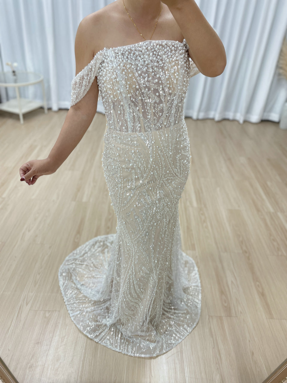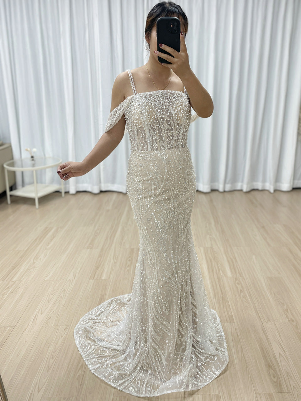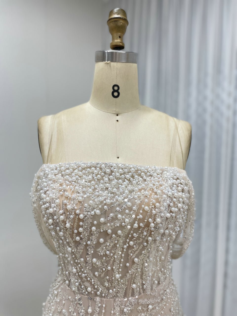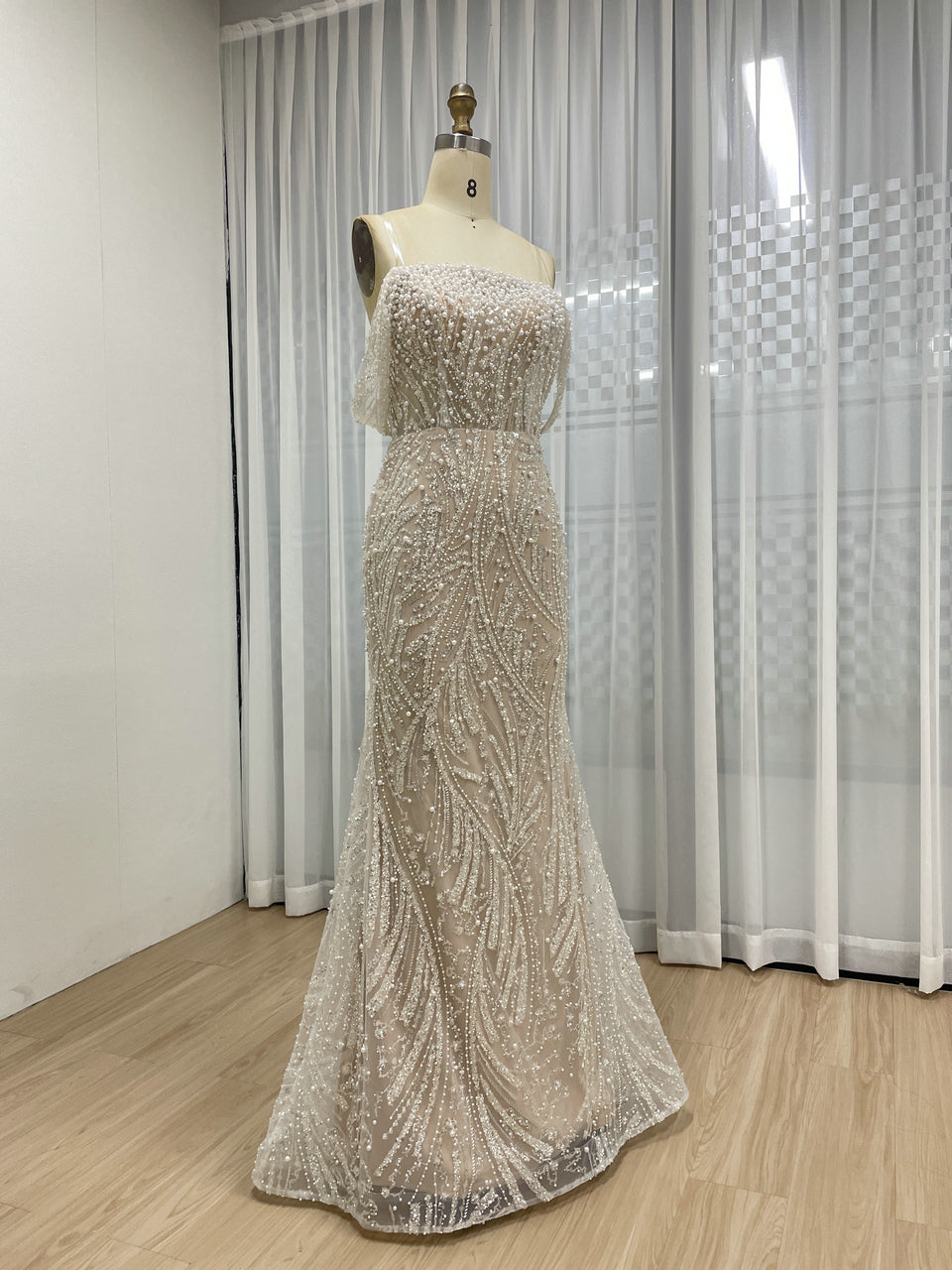 Luxury Strapless Pearl Beaded Mermaid Evening Dress Ivory Tulle Gown for Prom MY30140