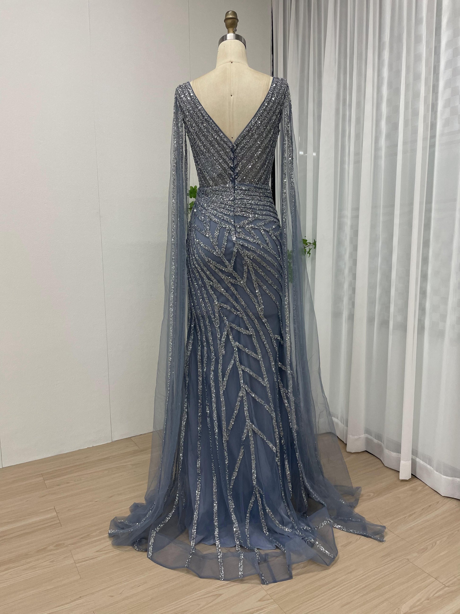Luxury V Neck Cape Sleeve Body Fitted Beading Lace Wedding Party Formal Dress MB40207