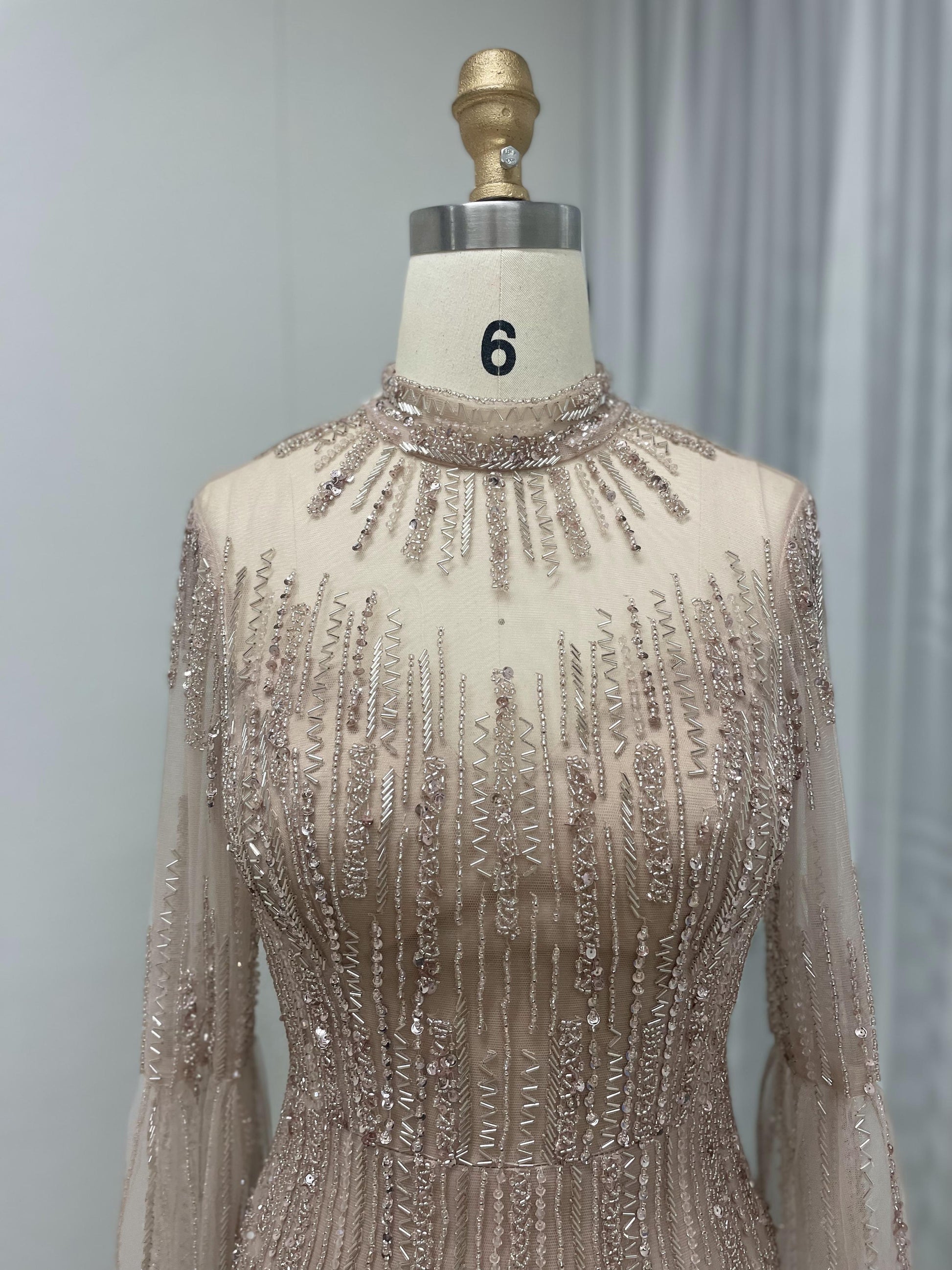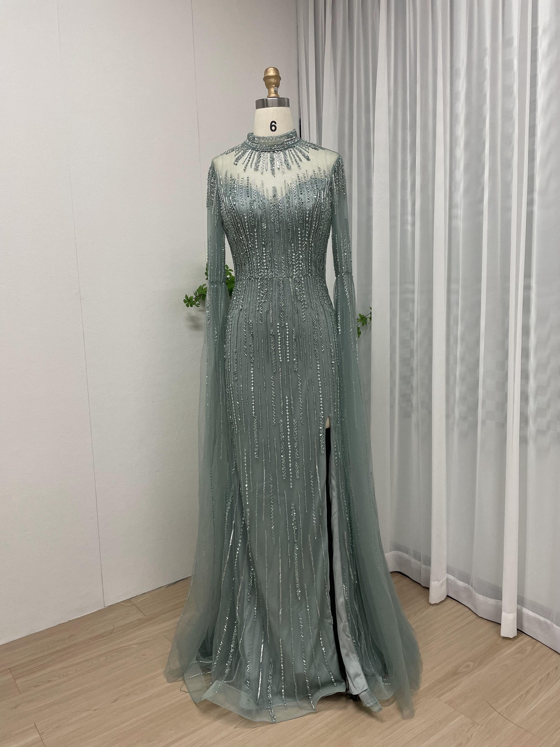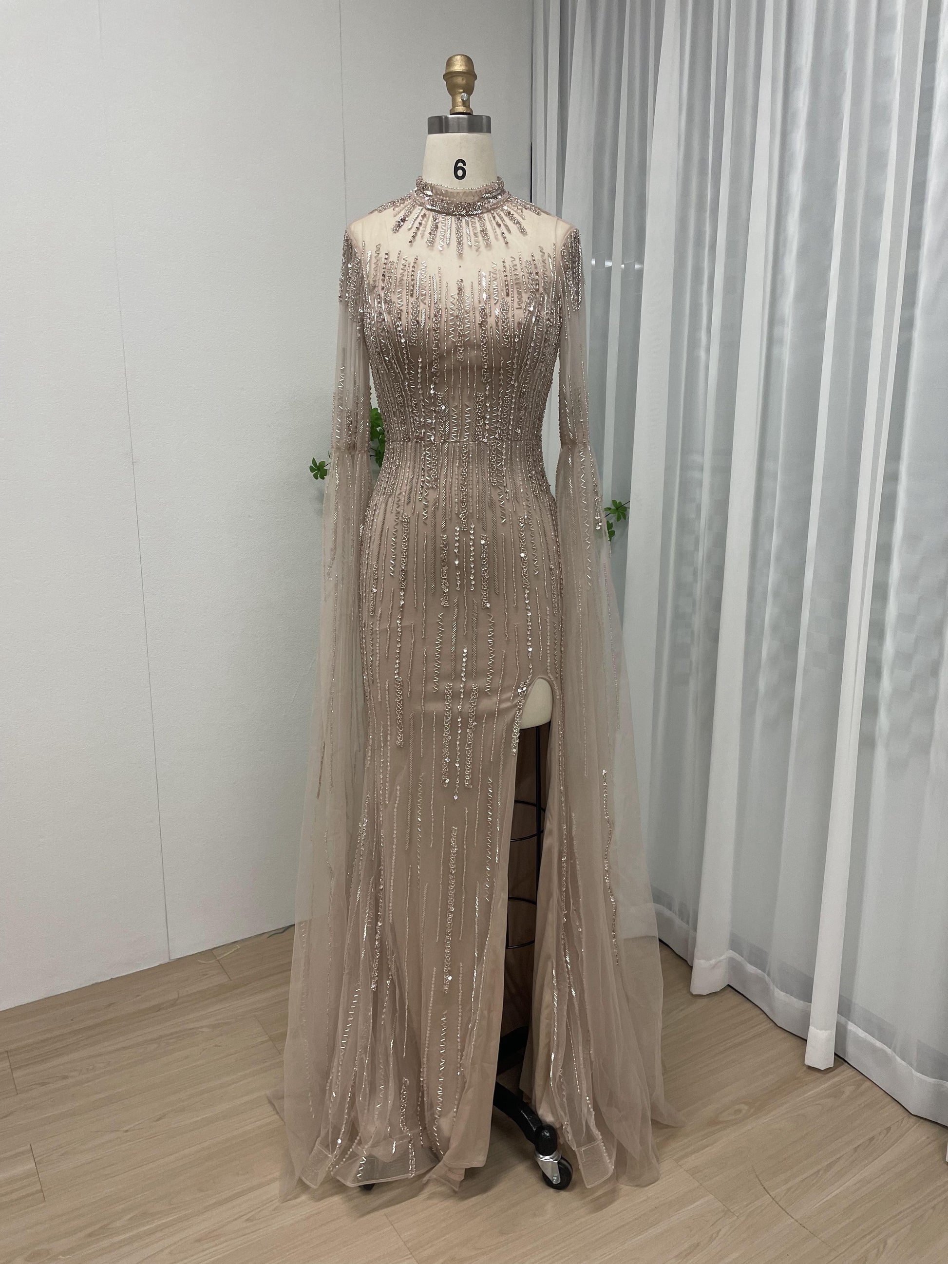 Magnificent High Neck Beading Fitted Formal Evening Gown With Cape Sleeve MB40187