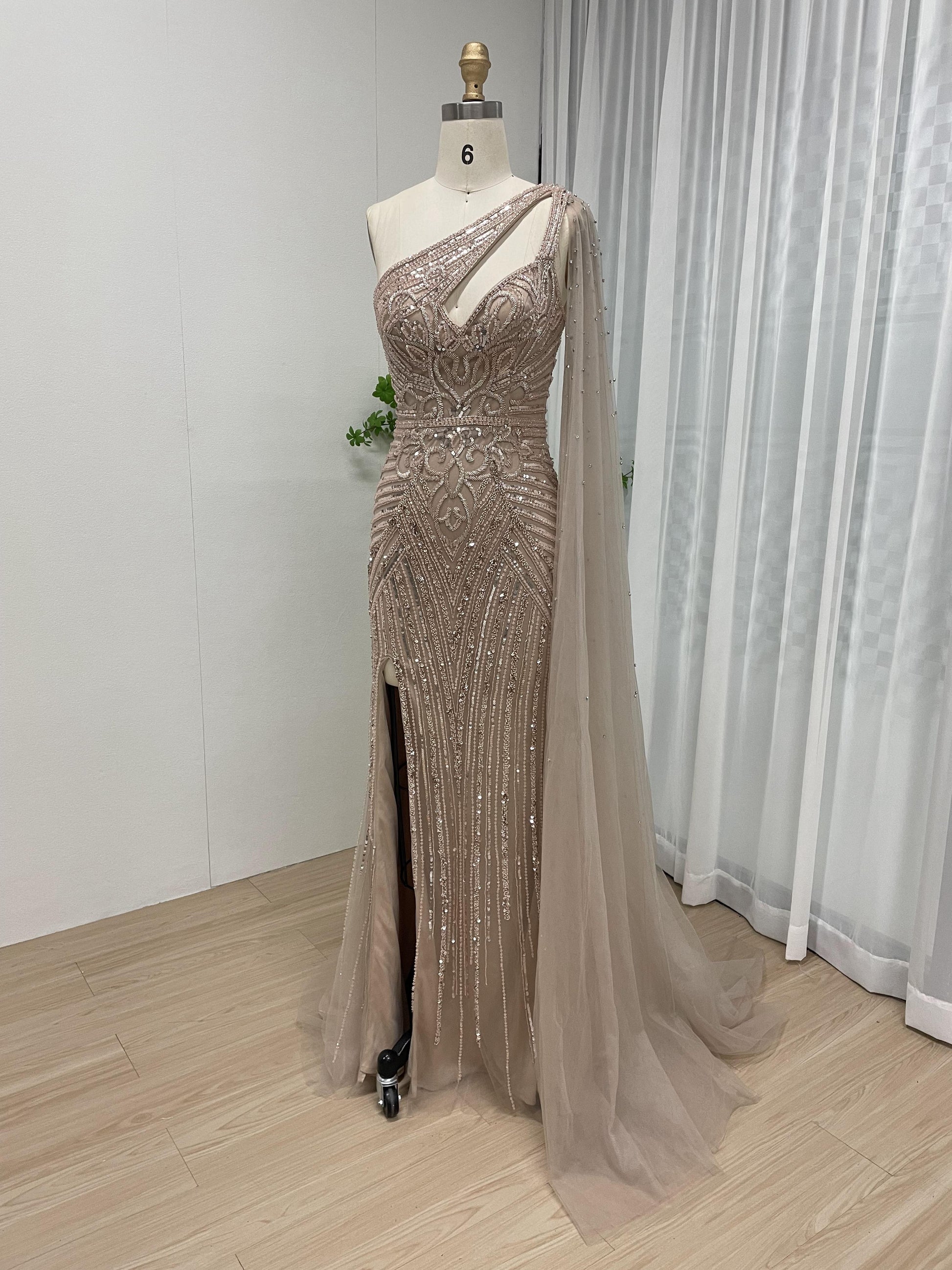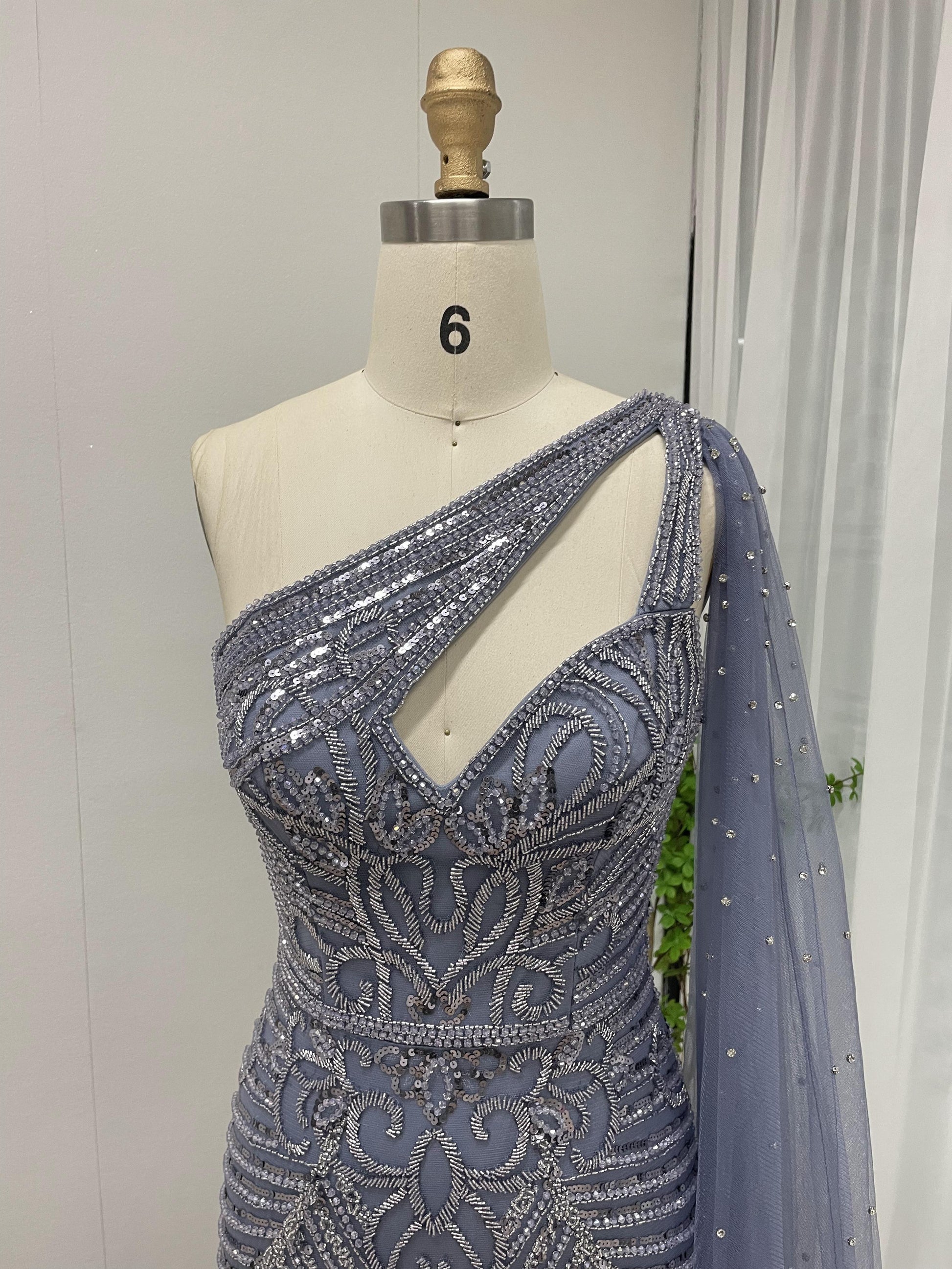Magnificent High Split One Shoulder Couture Beading Evening Dress MB40152