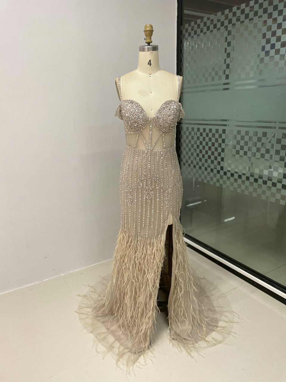 Off Shoulder Strap Handmade Beading Feather Dress MY30019