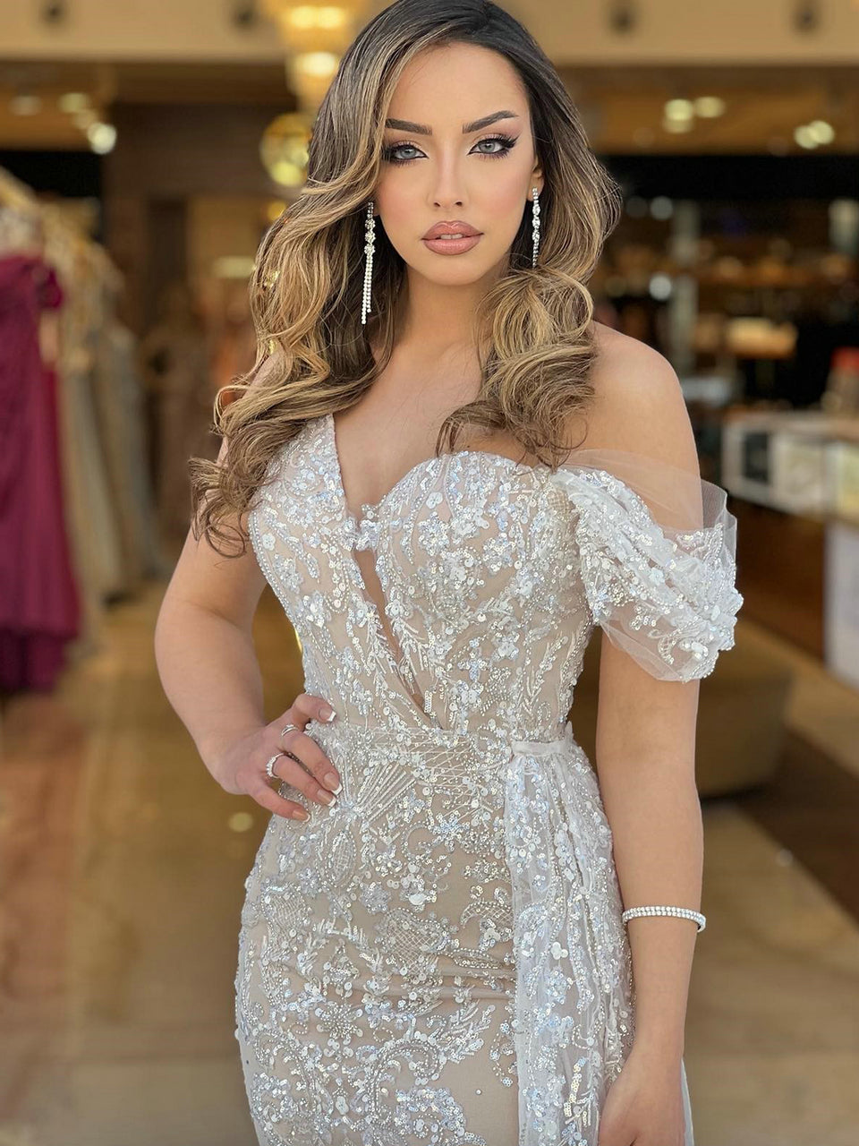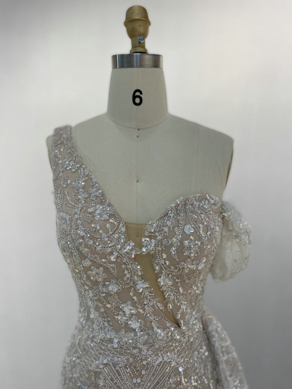 One-Shoulder Asymmetric Cut High Slit Lace Mermaid Couture Evening Gown DDS065