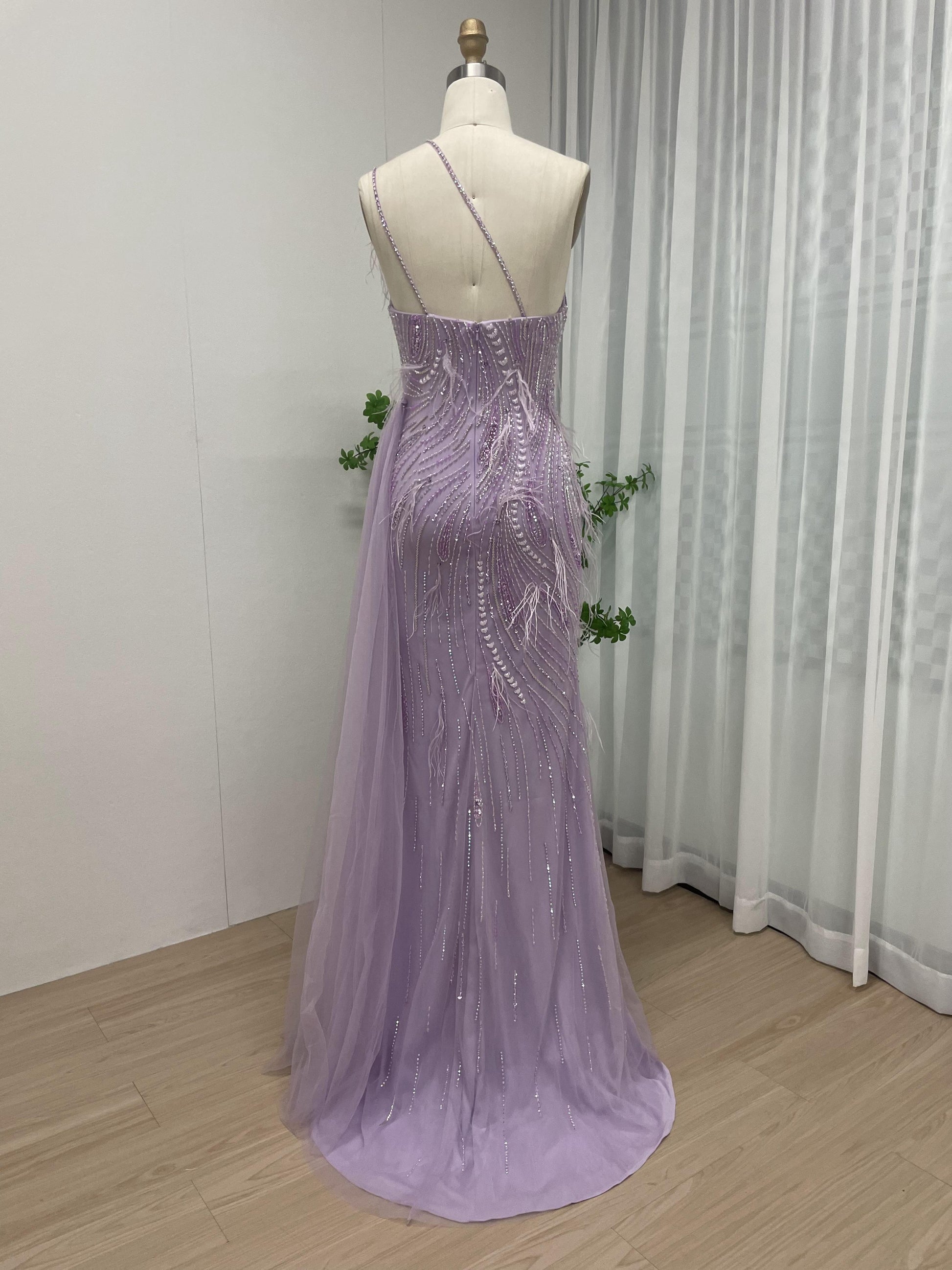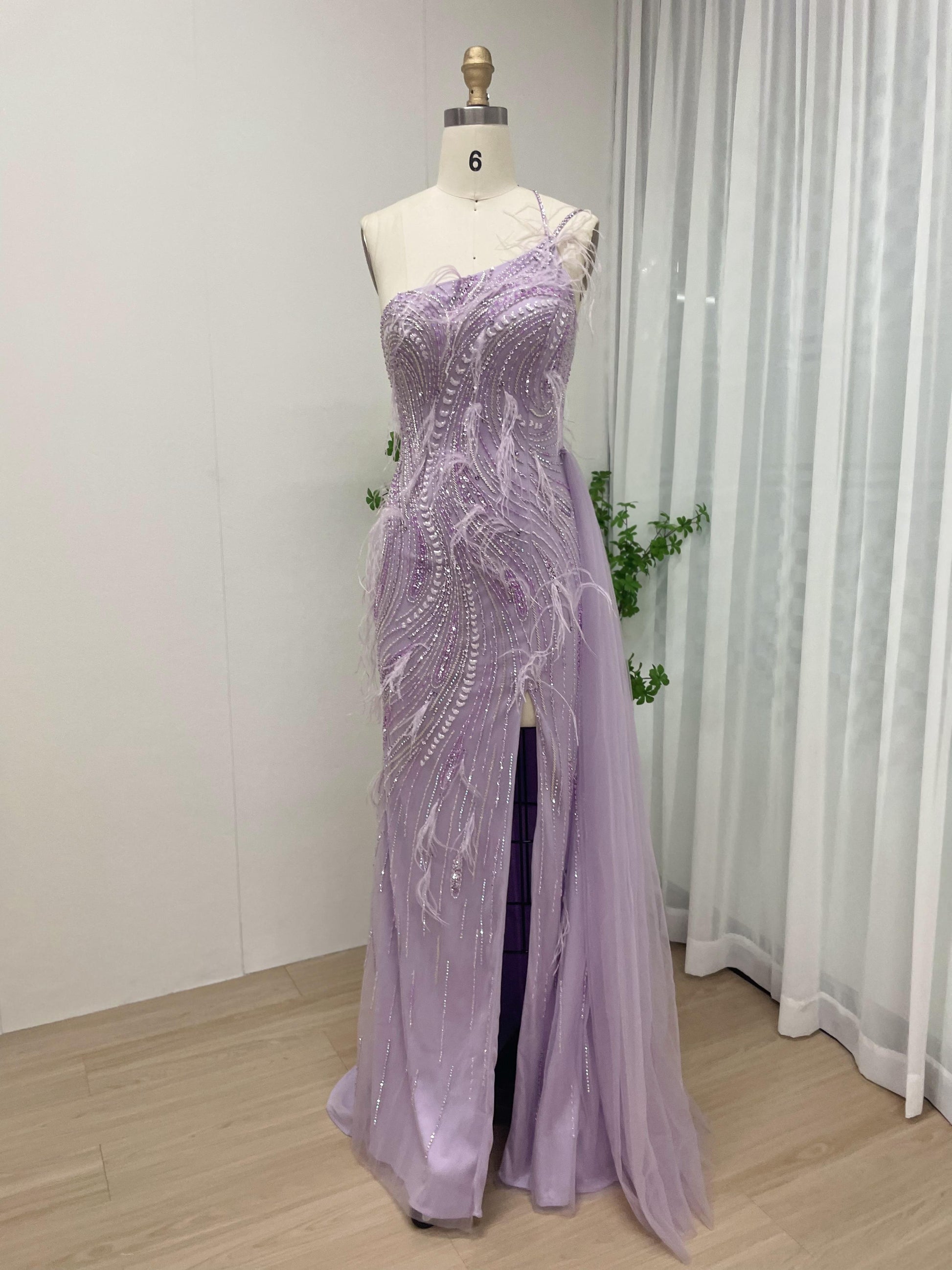 One Shoulder Beading Feather Evening Dress With Split MB40067