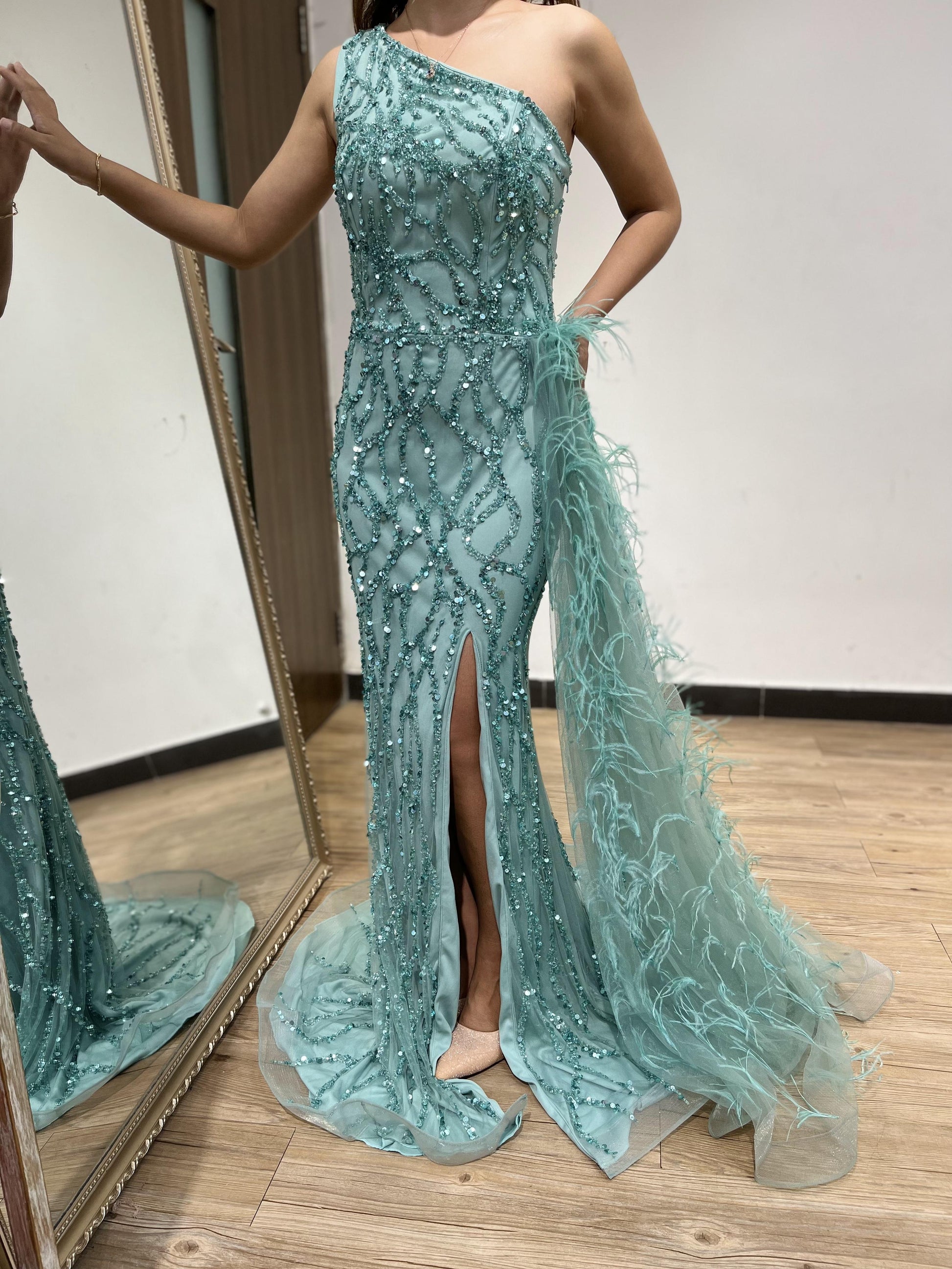 One Shoulder Couture Beading Split Feather Side-skirt Evening Dress DXM003