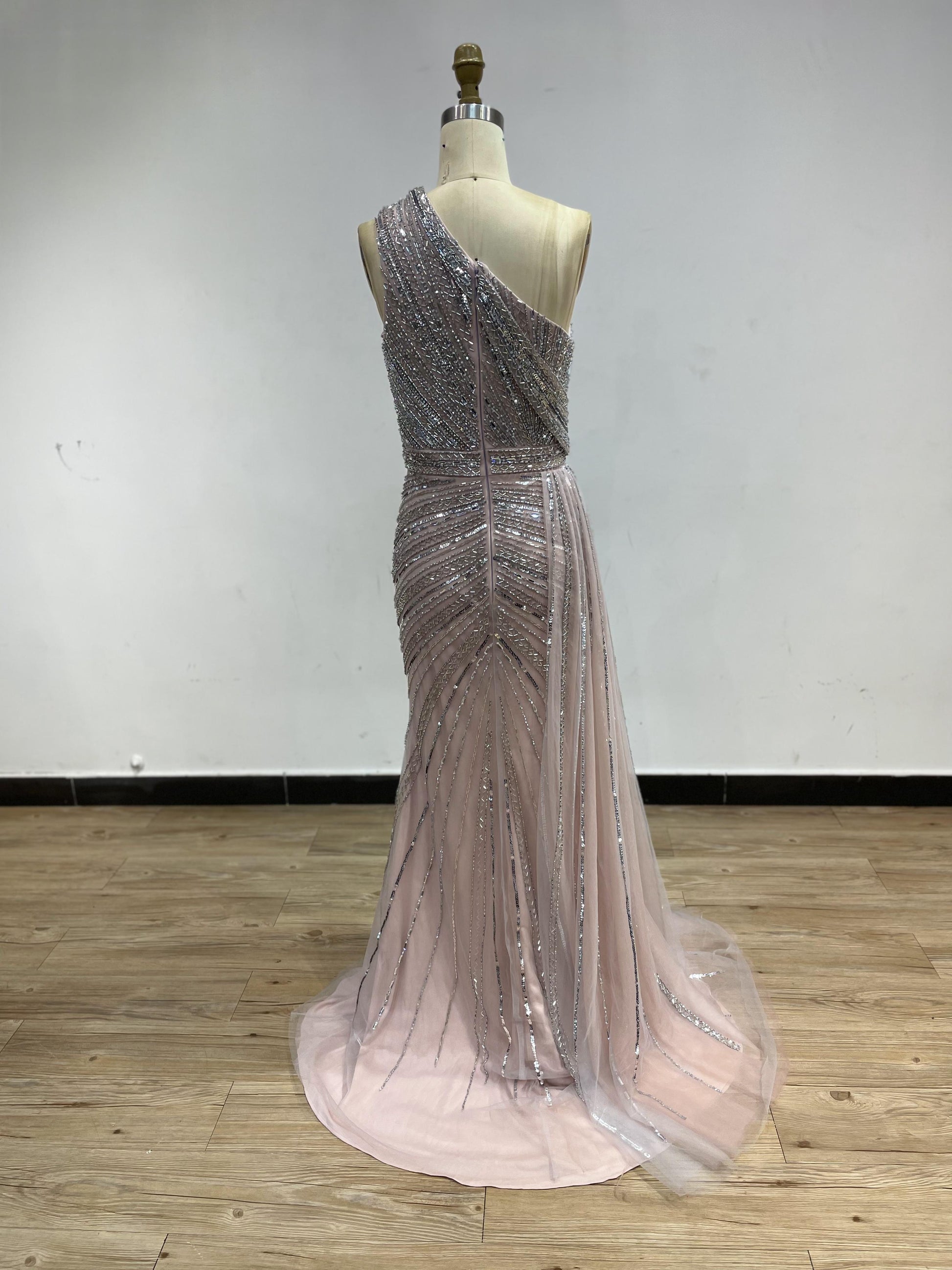 Turn heads in this breathtaking one-shoulder evening gown. Designed to flatter, this floor-length dress features a sophisticated mermaid silhouette adorned with intricate, hand-placed silver sequins in a radial sunburst pattern. The dusty rose tulle overlay adds a soft, romantic touch, while the bold thigh-high slit and sweeping train offer a dramatic finish. Perfect for galas, prom, or as a high-glamour bridesmaid look.