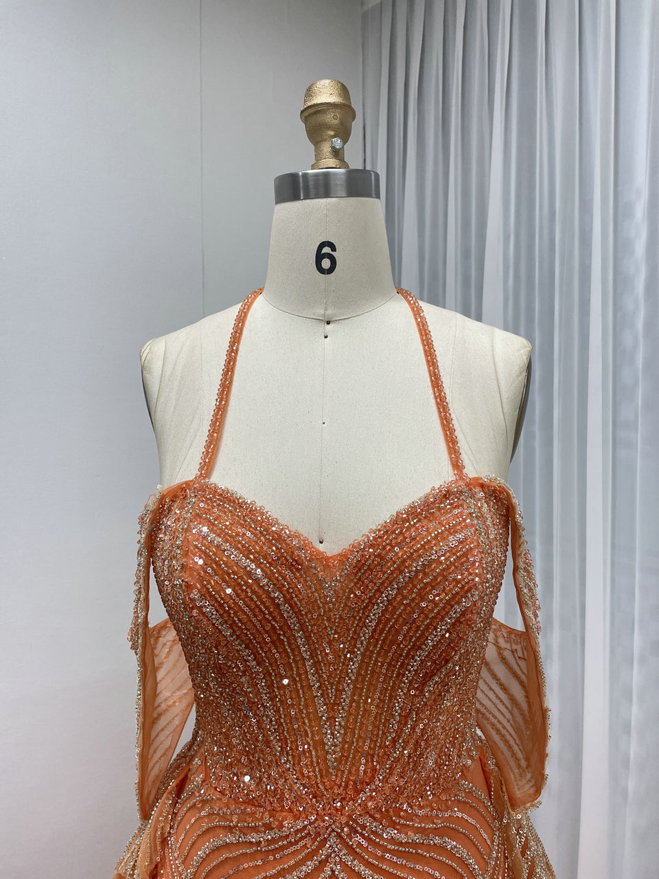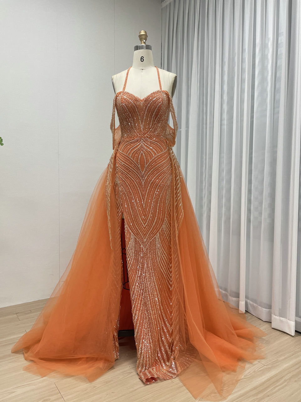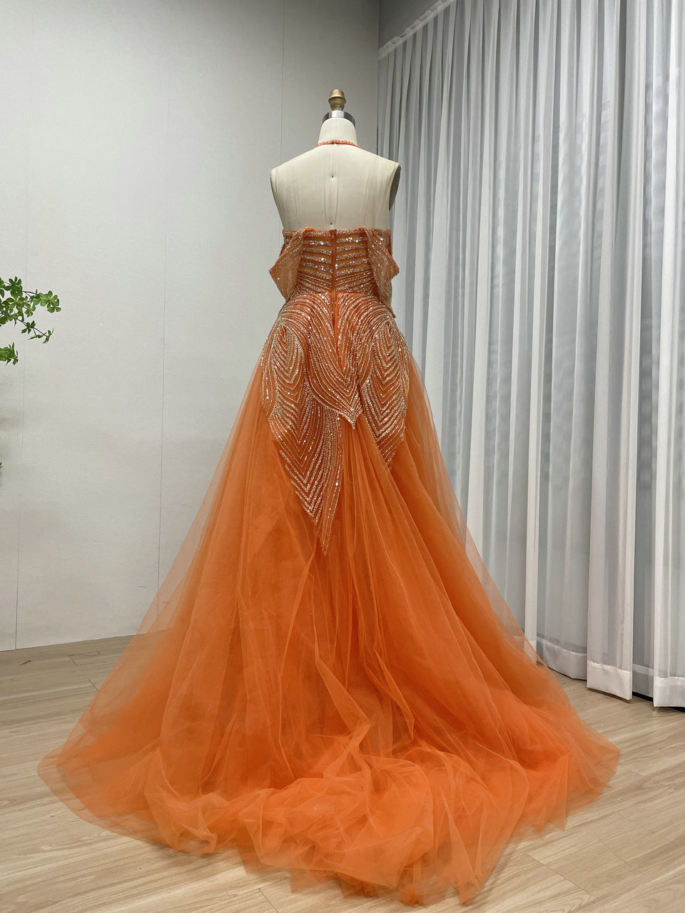 Orange Beaded Sexy High Slit Off-shoulder Heart-shaped Halter Neck Wrap Dress Evening Gown Prom Dress MB40304