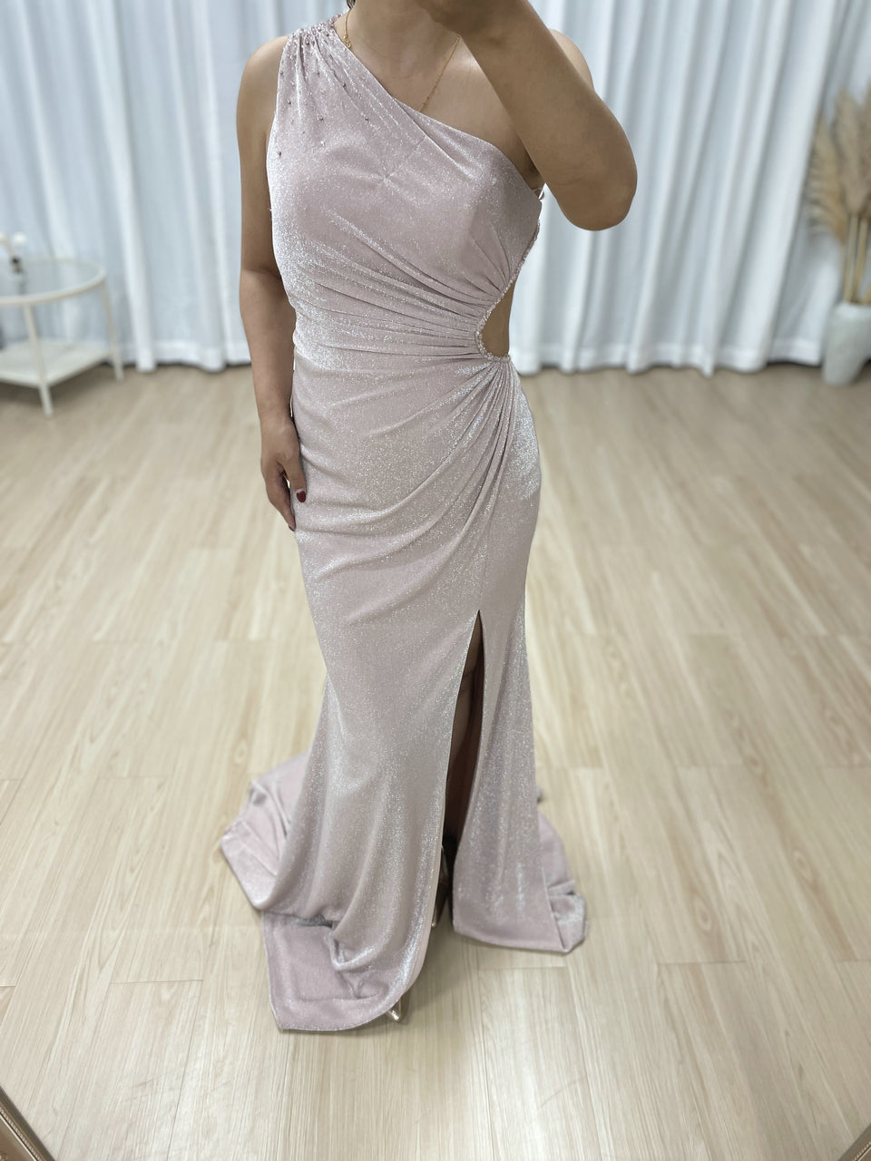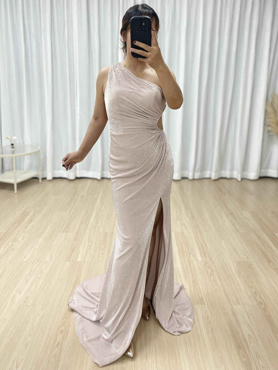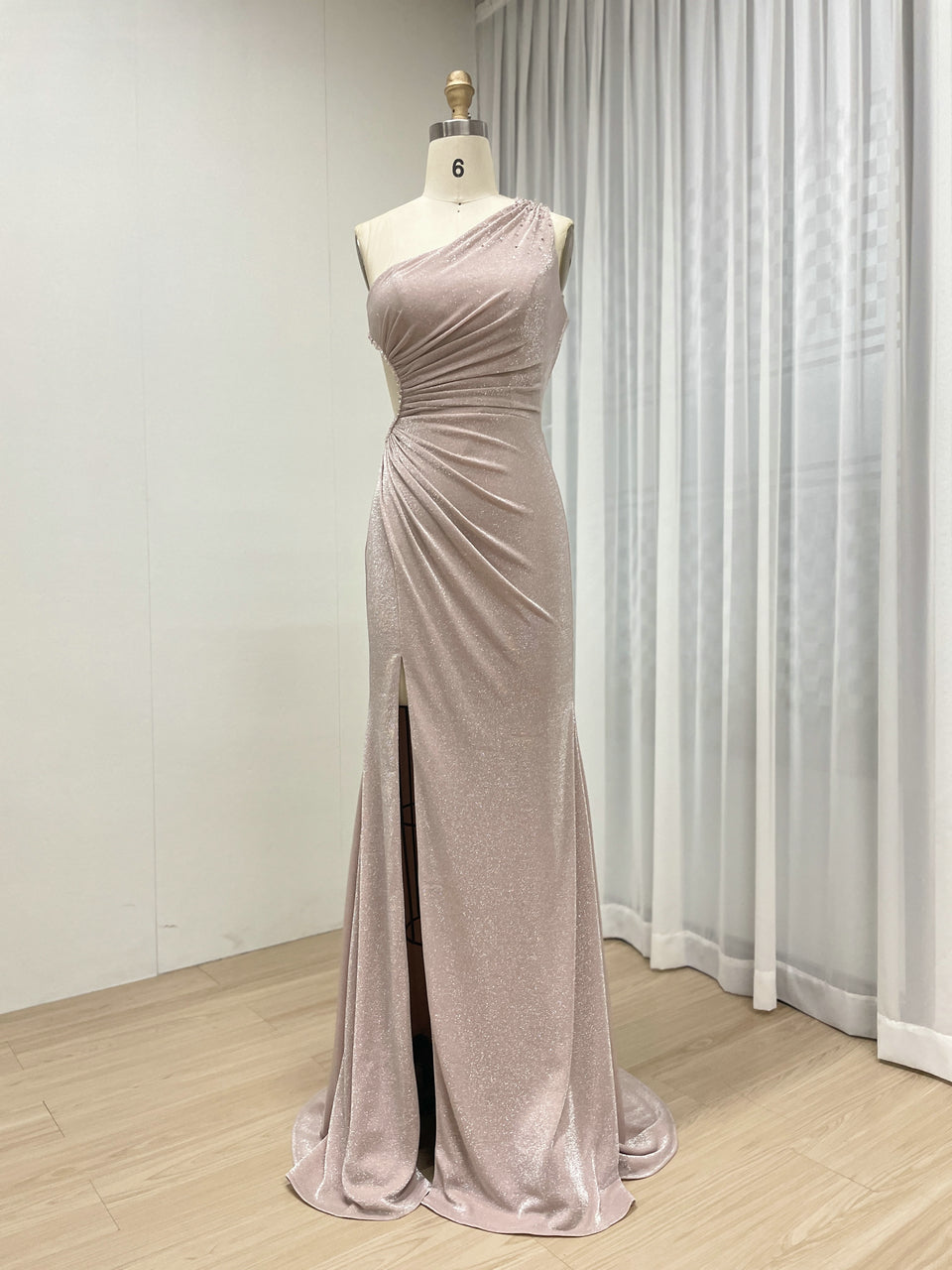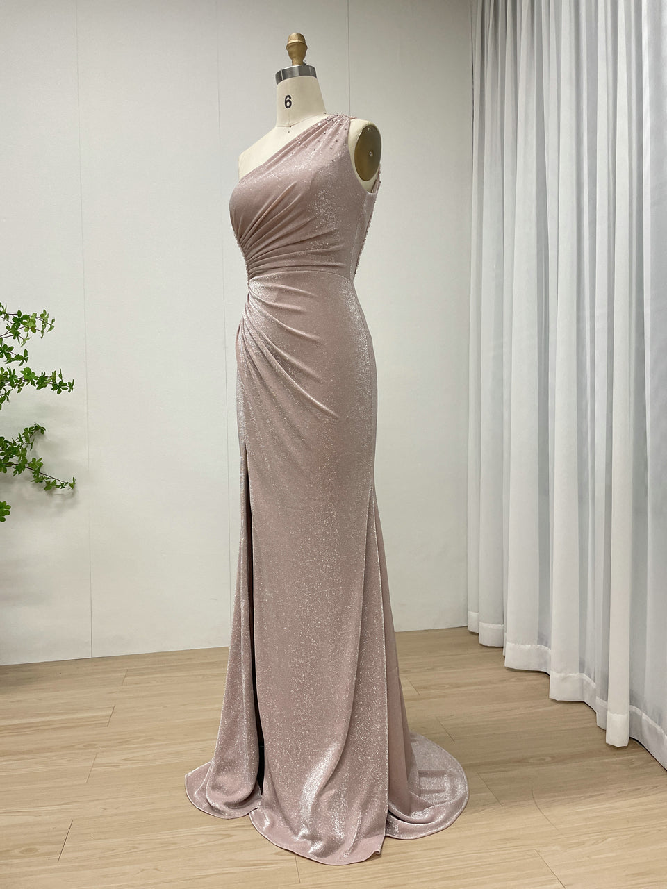 Pink Glamorous High Slit One Shoulder Pleated Mermaid Gown Suitable for Prom MB40349
