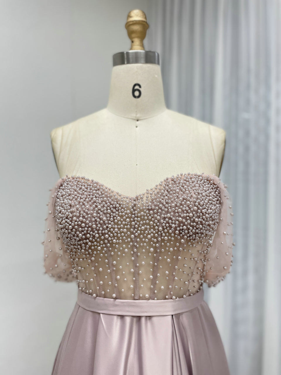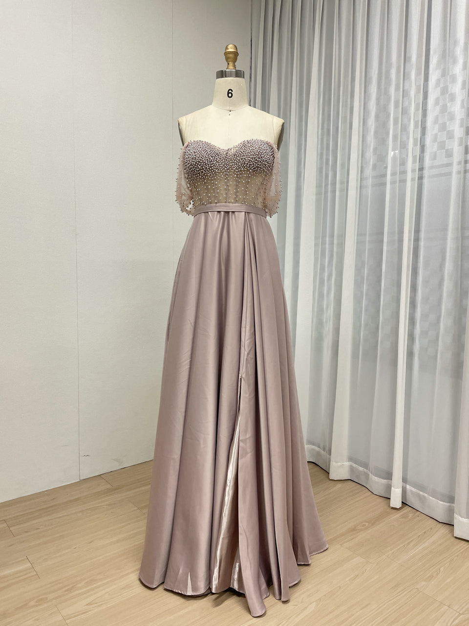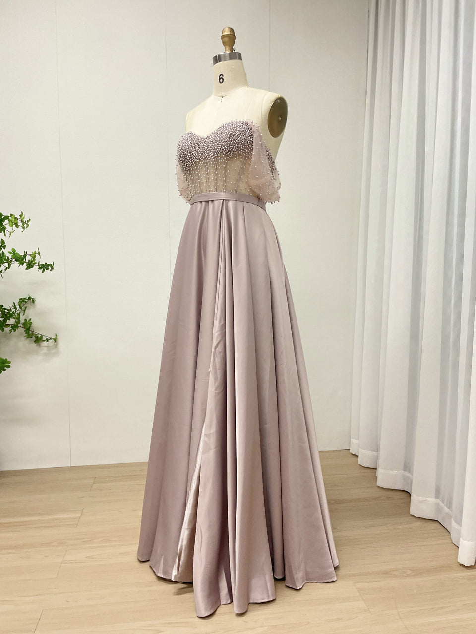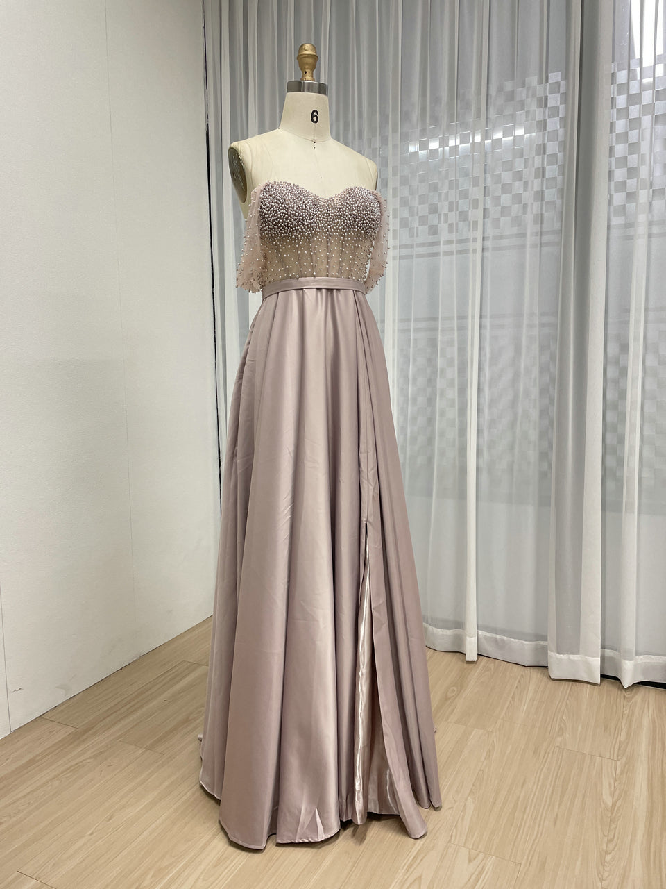 Pink Strapless Beaded Bodice A-Line Evening Dress Satin Skirt Formal Prom MY30150