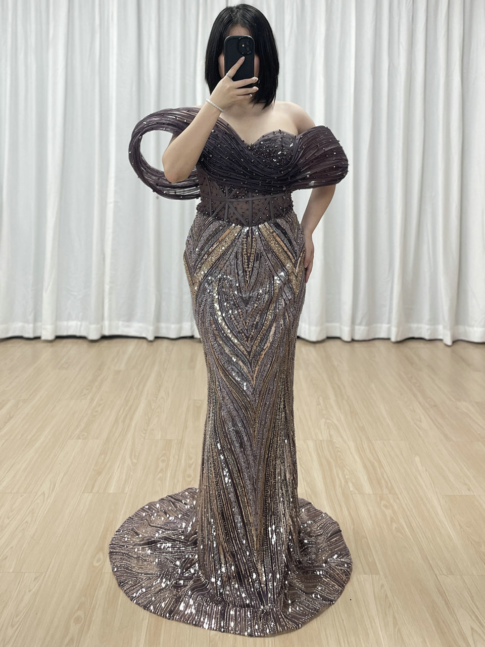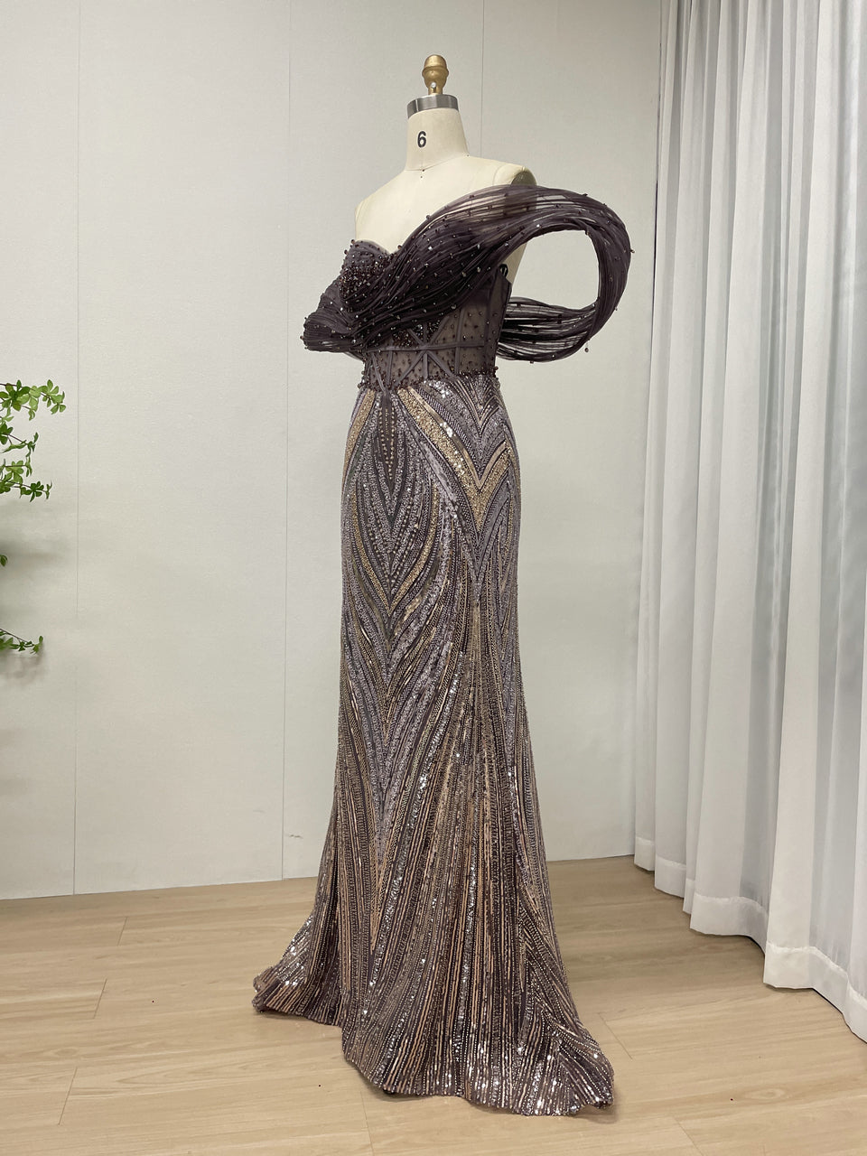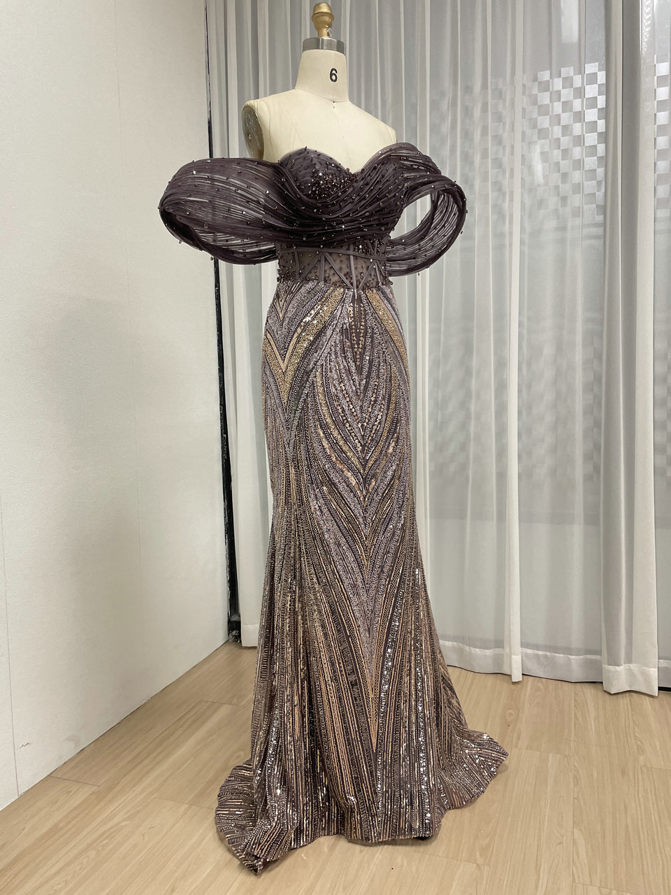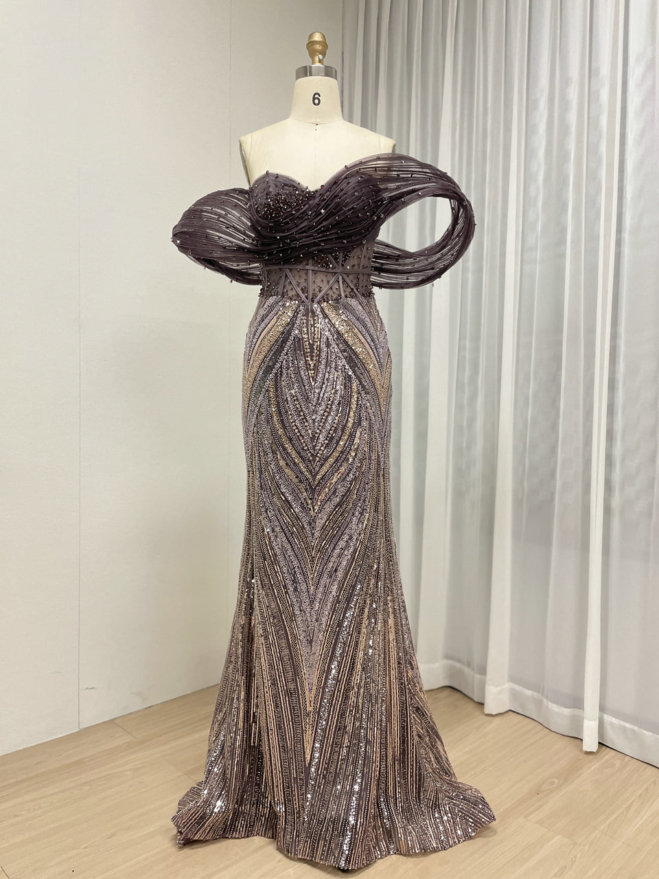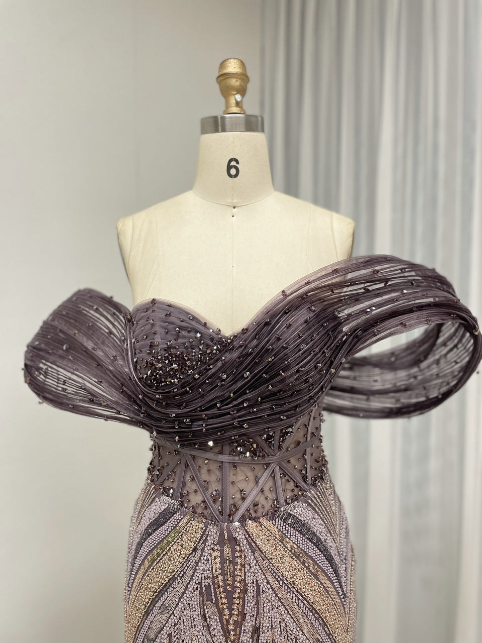 Purple Off-Shoulder Beaded Evening Gown with Dramatic Ruffle Slit for Galas MY30181