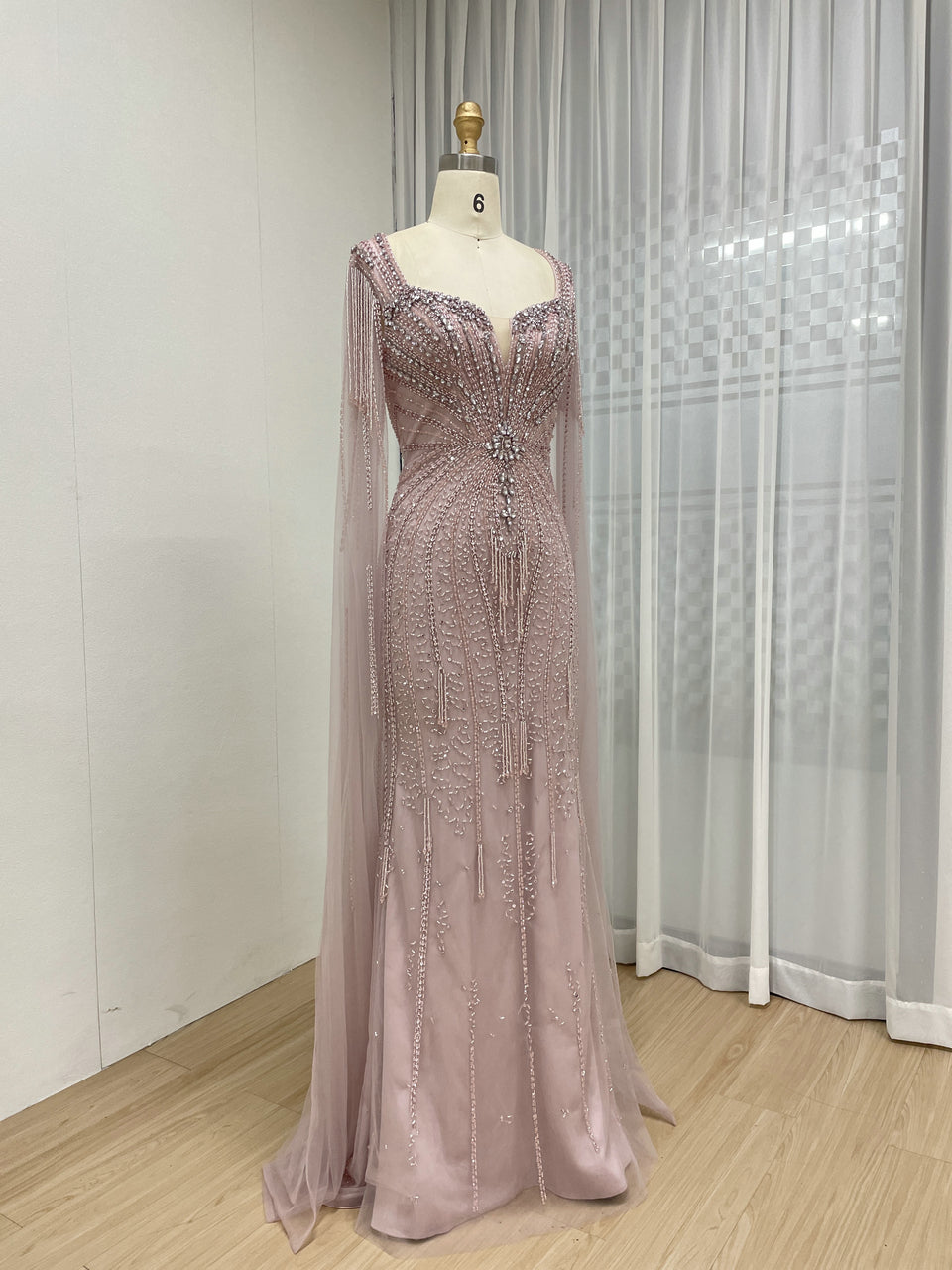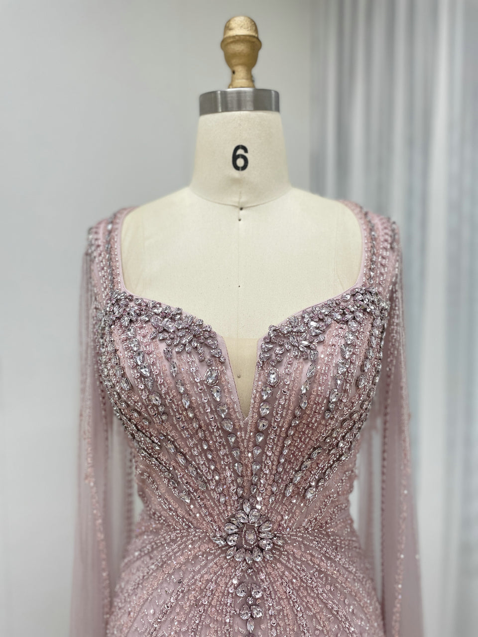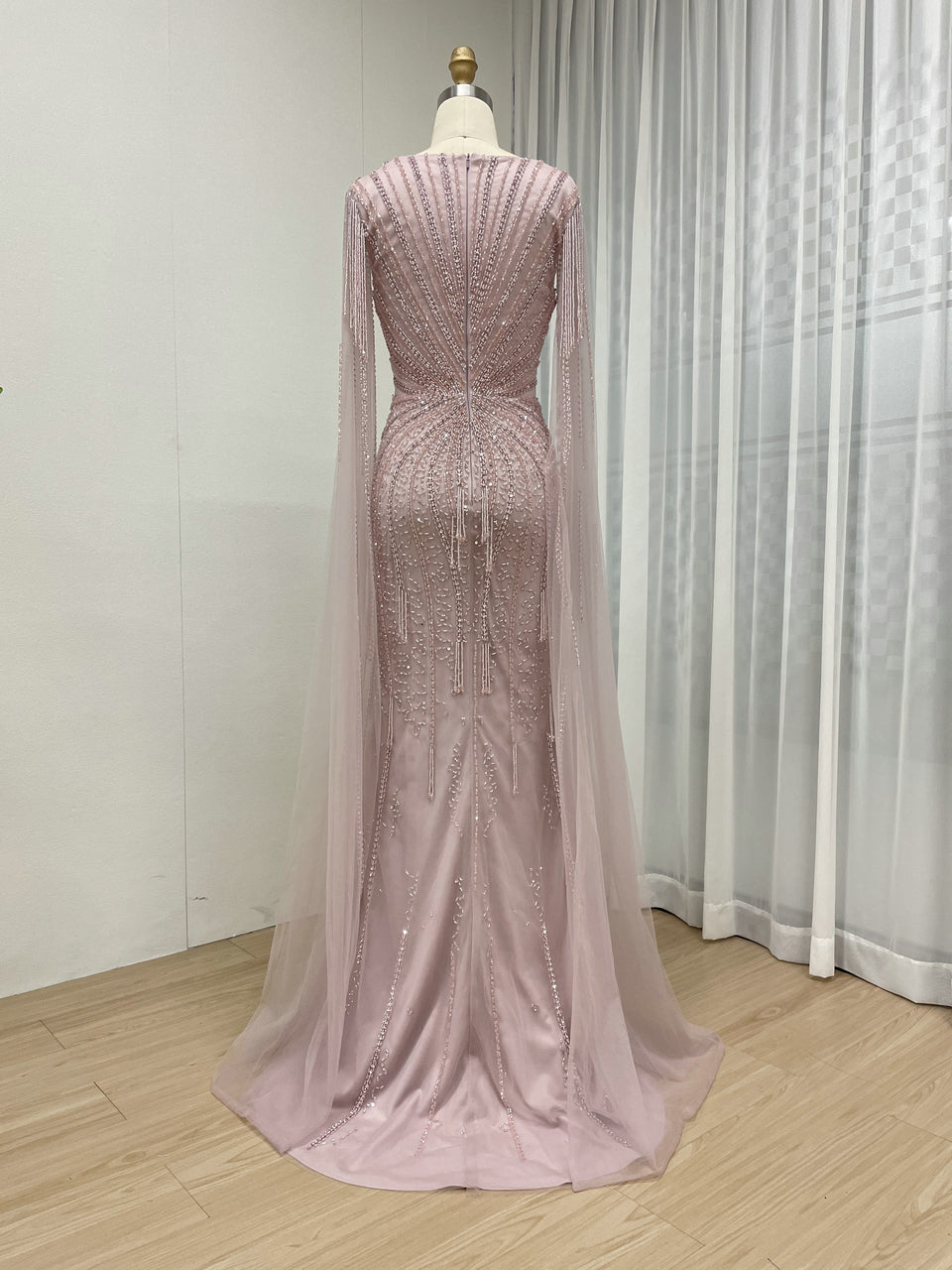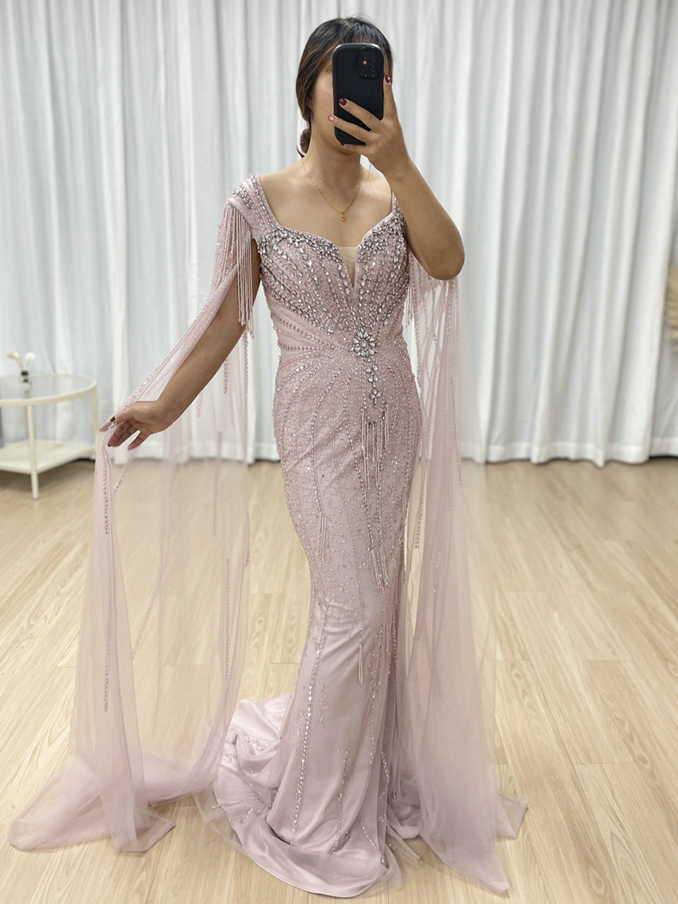 Sexy Deep V Neck Pink Mermaid Evening Gown With Embellished Exquisite Beaded Crystal Elegant Cap Sleeve MB40343