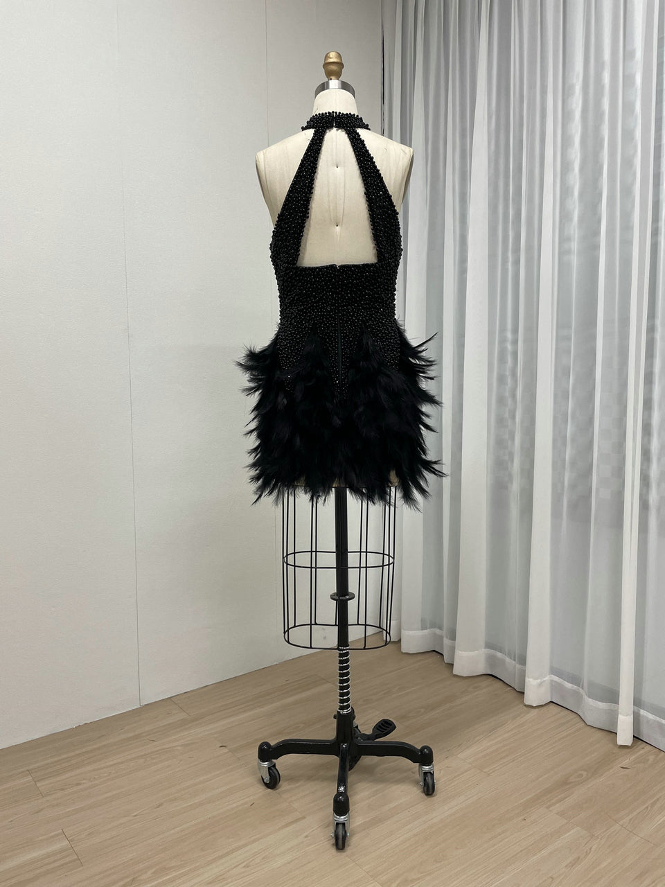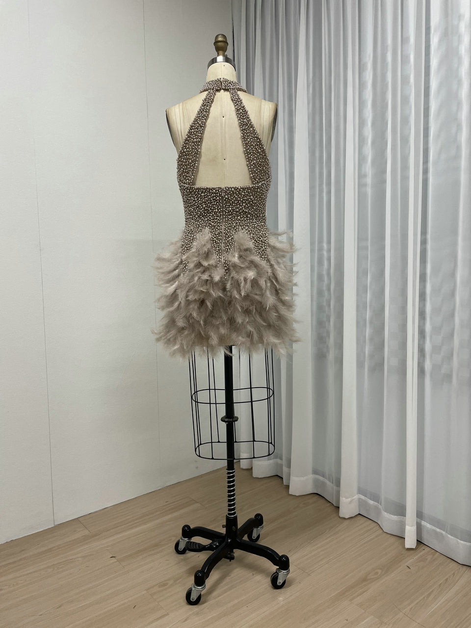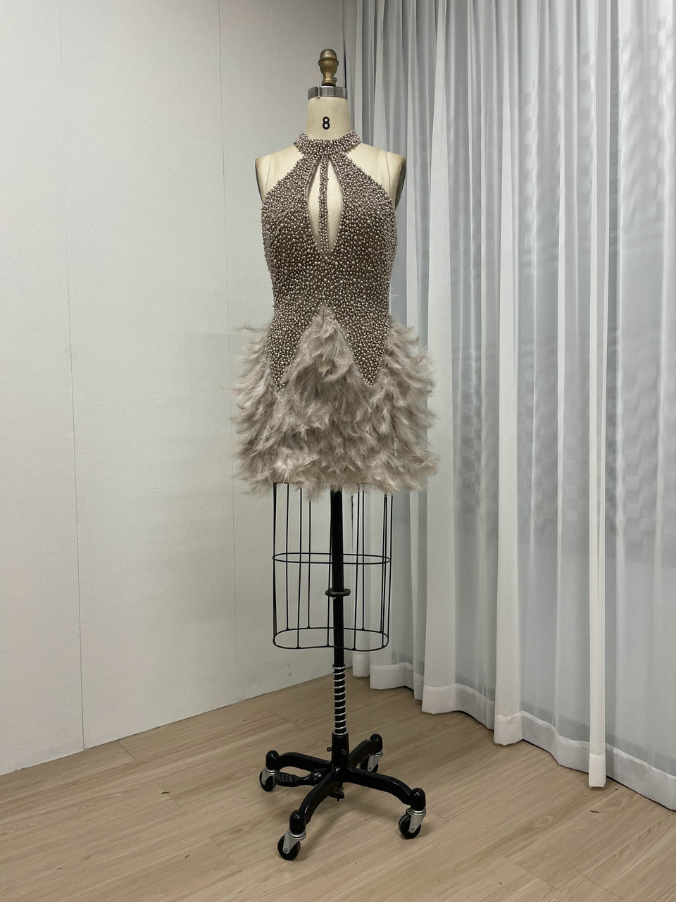 Sexy Halter Neck Bottom Feather Short Party Pearl Dress MB40232
