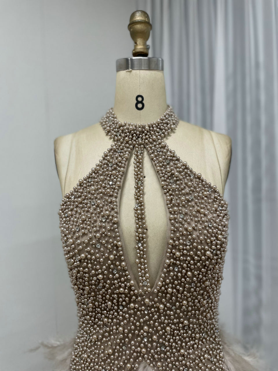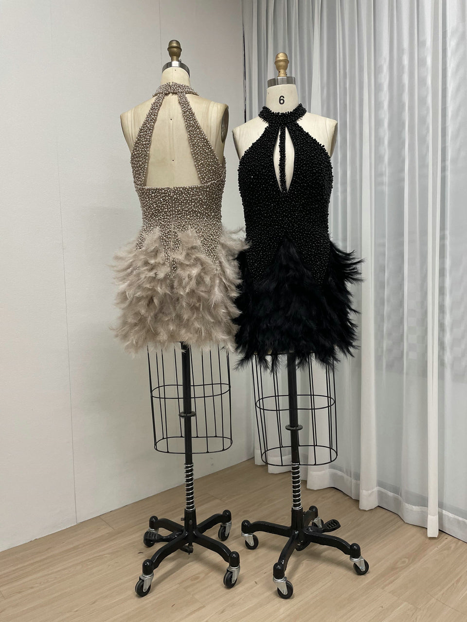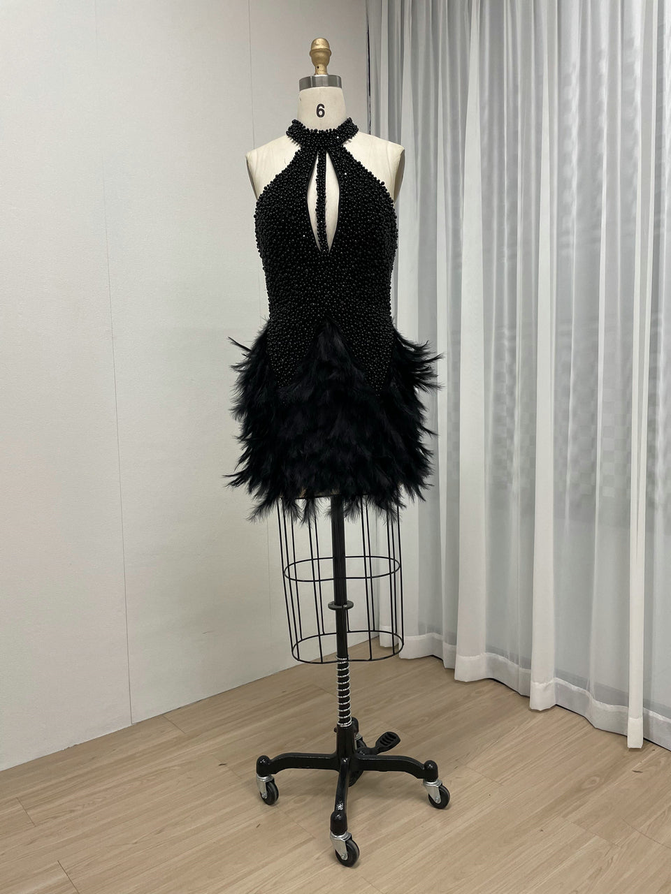 Sexy Halter Neck Bottom Feather Short Party Pearl Dress MB40232