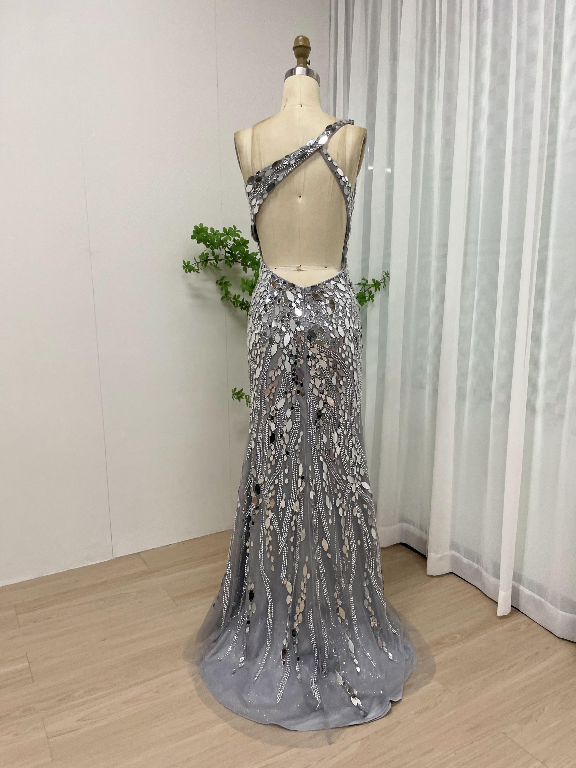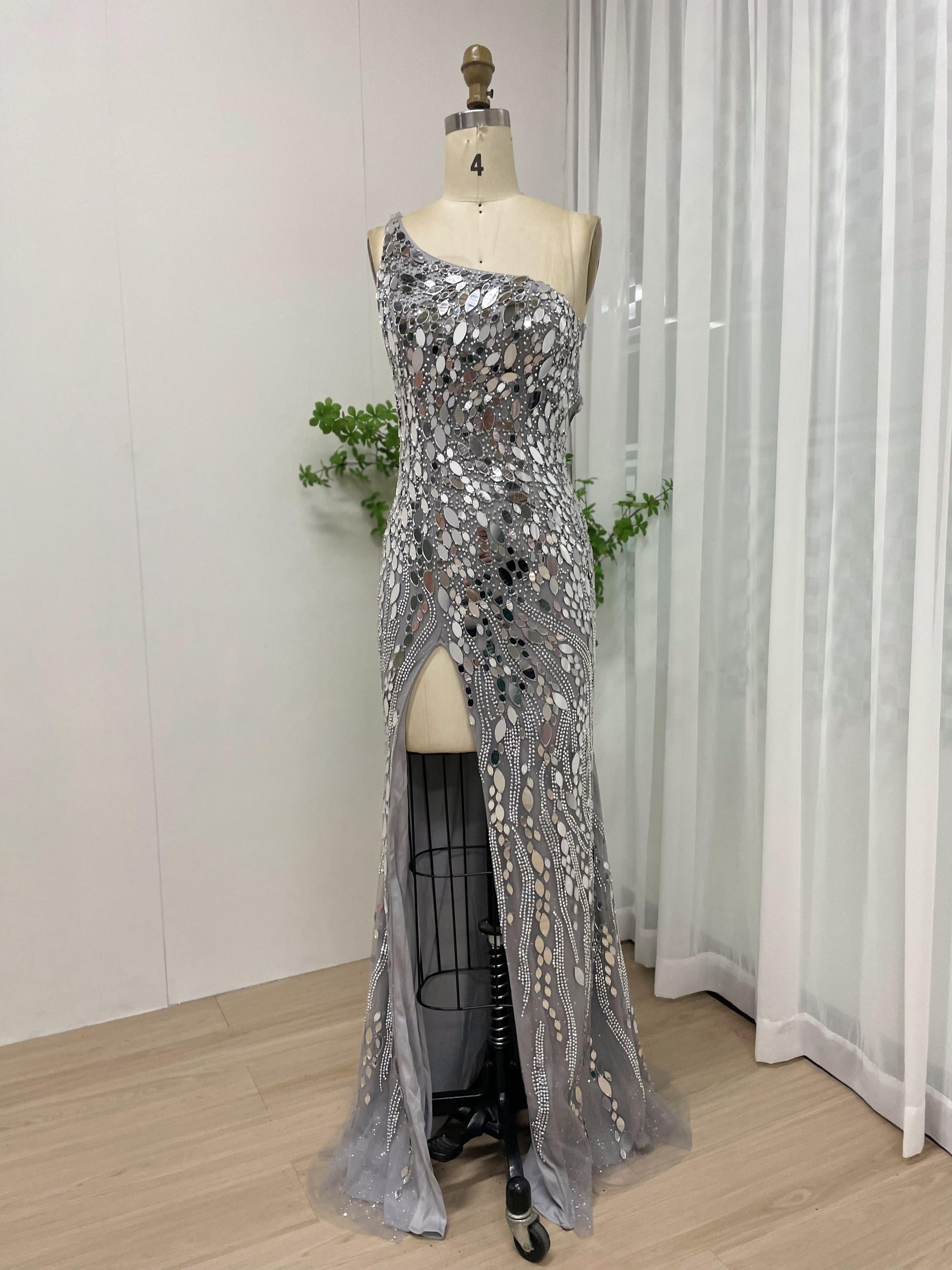 Sexy One Shoulder Open Back Silver Couture High Split Evening Prom Dress MB40087