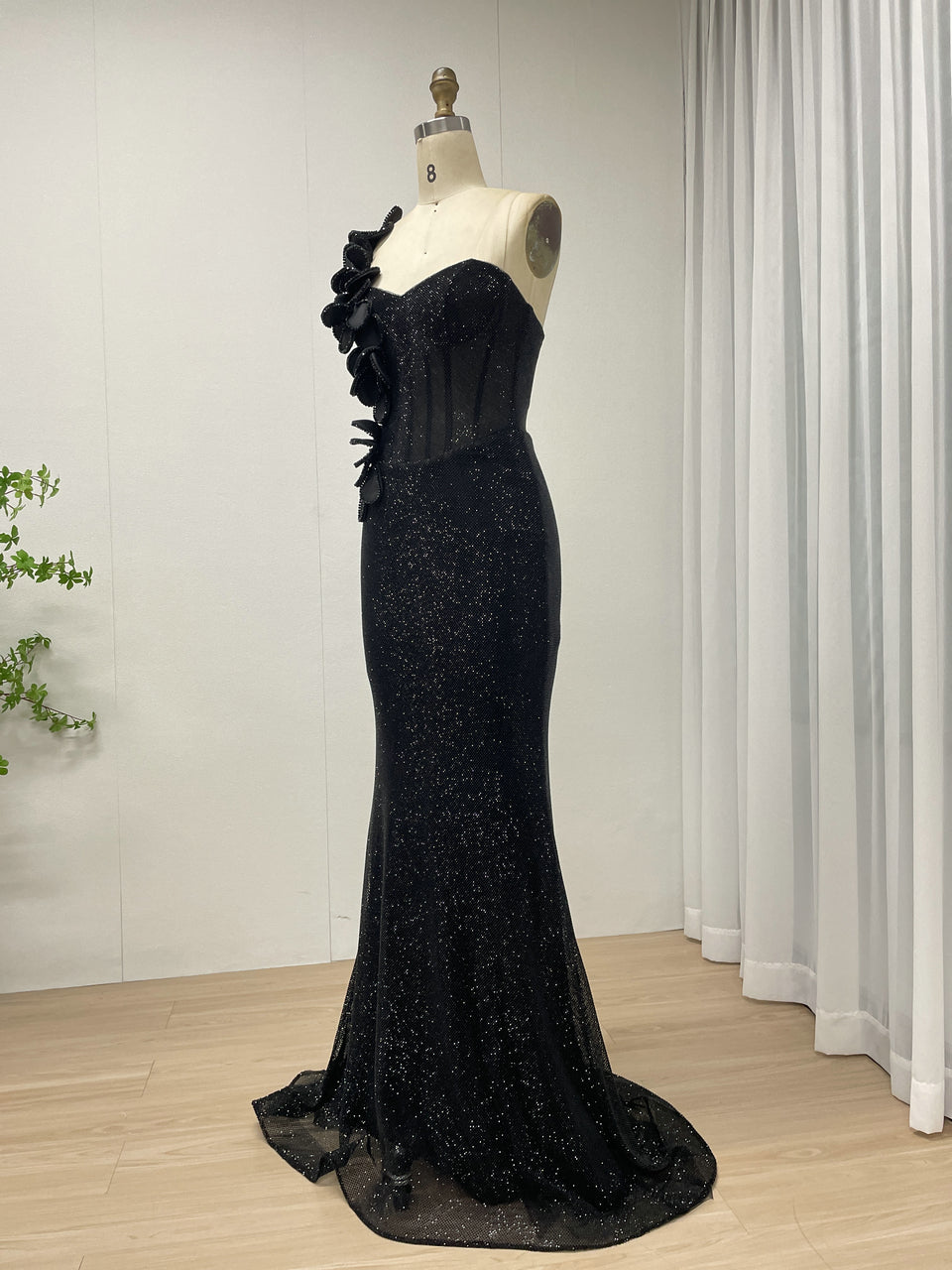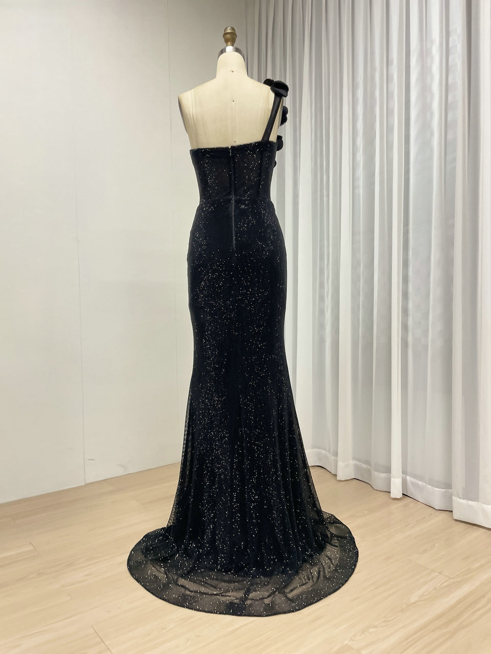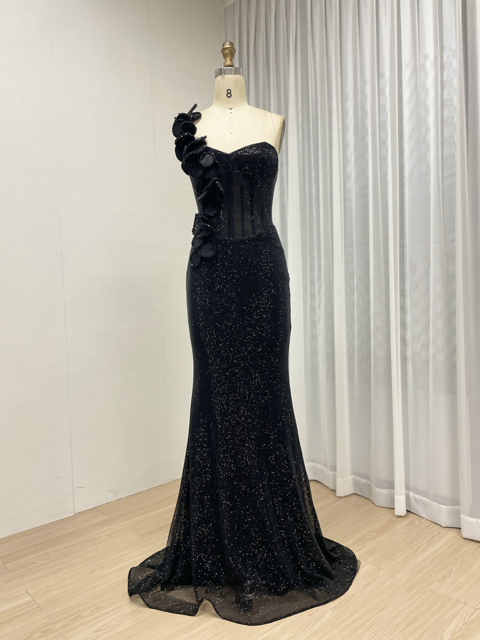 Sexy One Shoulder Sweetheart Neck Bodice Black Evening Gown Suitable for Banquet MB40359